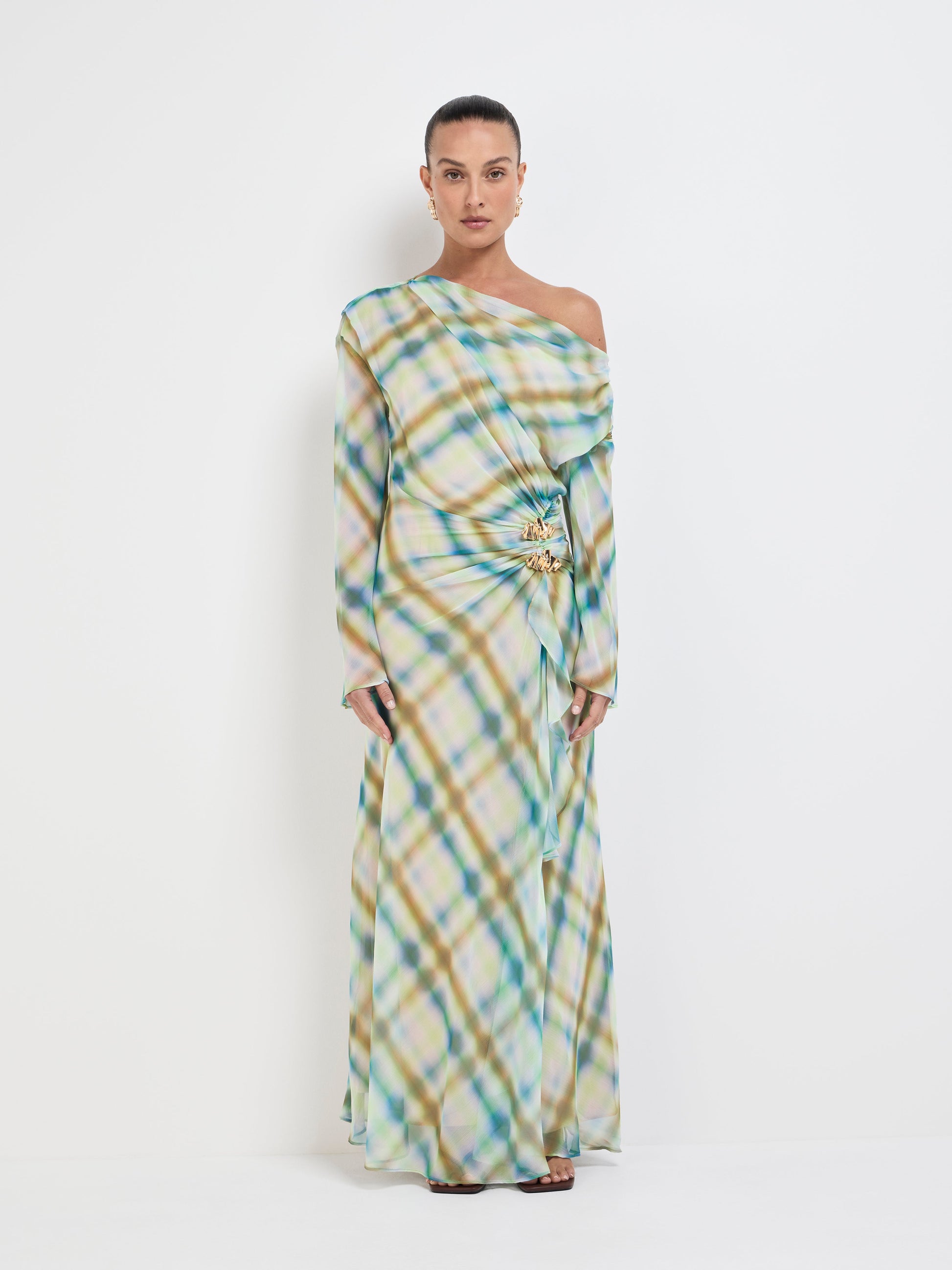 Embrace new prints with our Ada Maxi Dress, a show stopping maxi perfect for your next event. Featuring a check georgette fabrication, asymmetrical neckline, long sleeves, gathering at bodice and hip with gold detail, front split and maxi skirt length. Style with our Knot Earrings to complete the look.