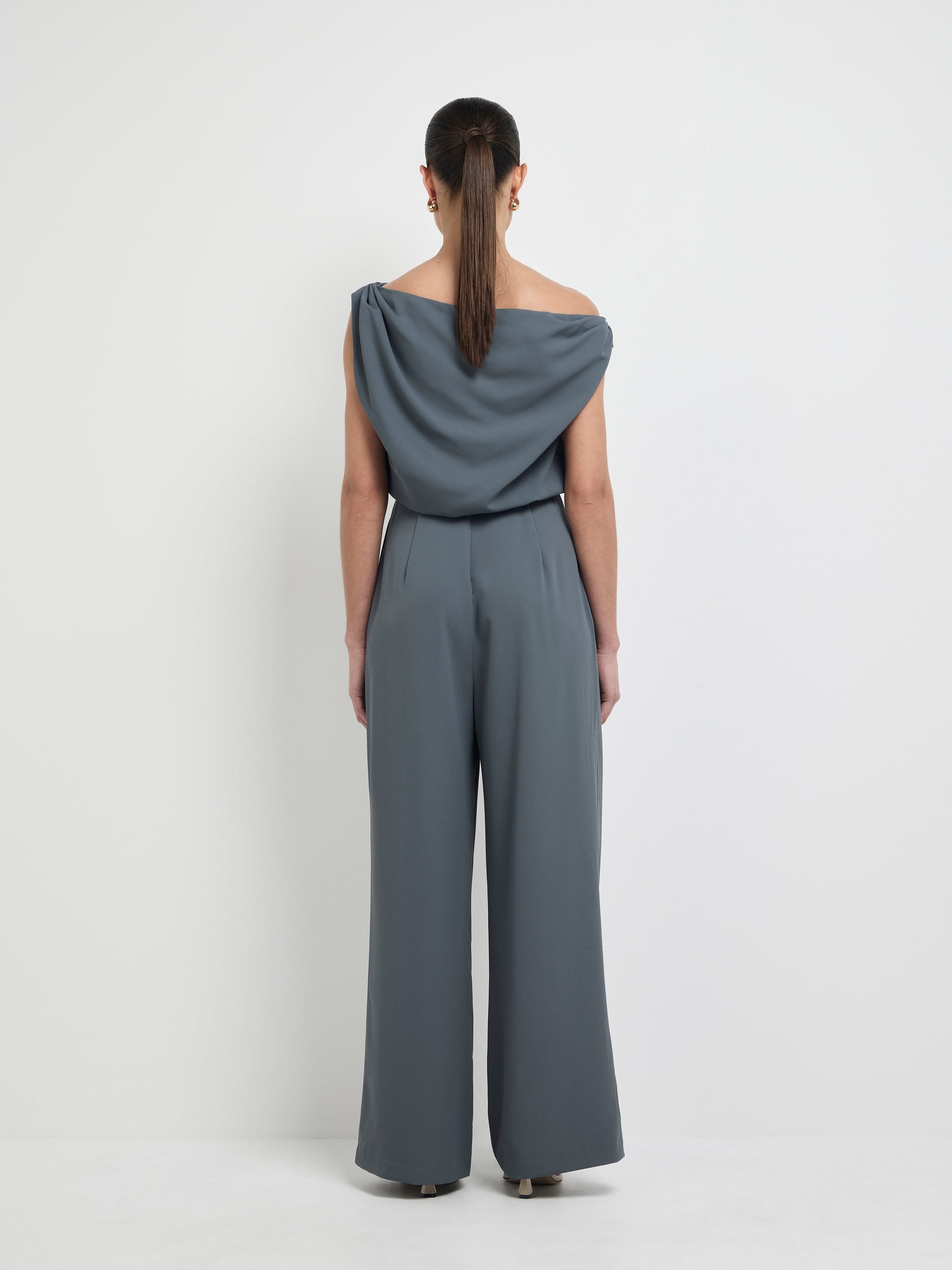 Radiate nothing but style in our Adeline Jumpsuit. Perfect for your next event, this stylish jumpsuit features an anthracite woven fabrication, lined bodice, asymmetrical neckline, rouleau tie with gold hardware. Pair with our Demi Earring Stack to complete the look.