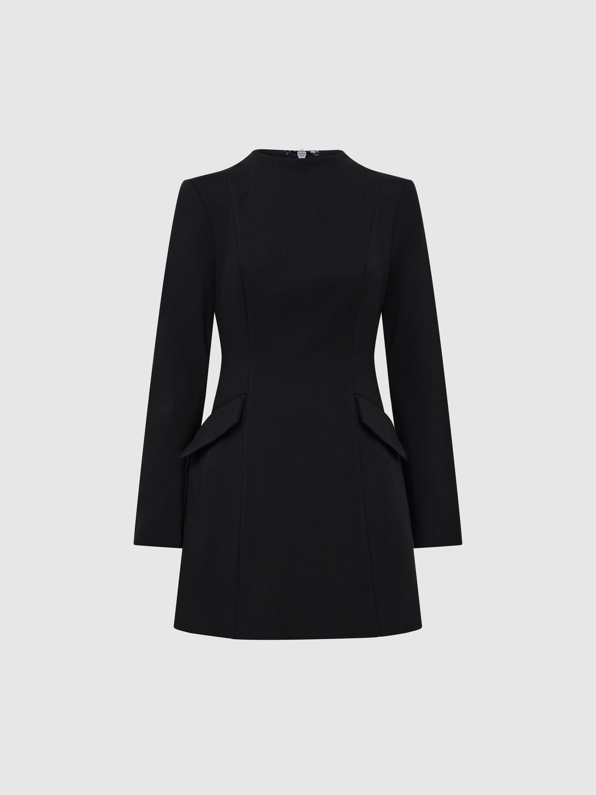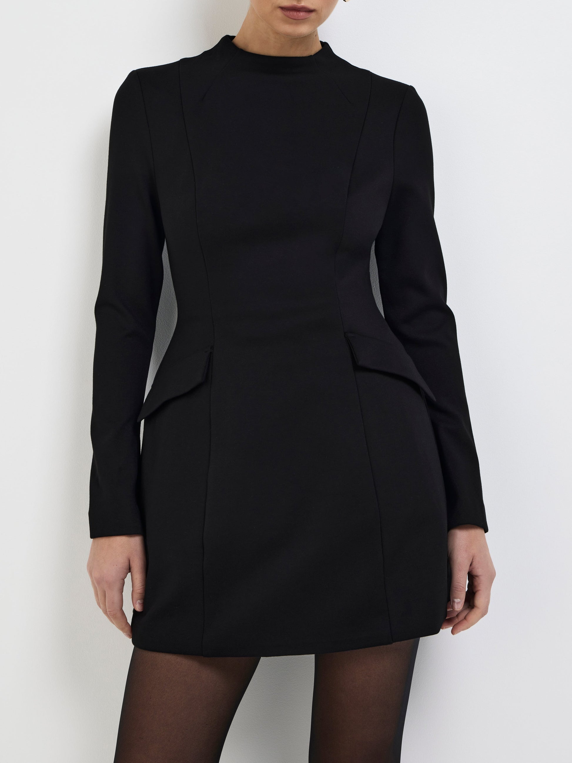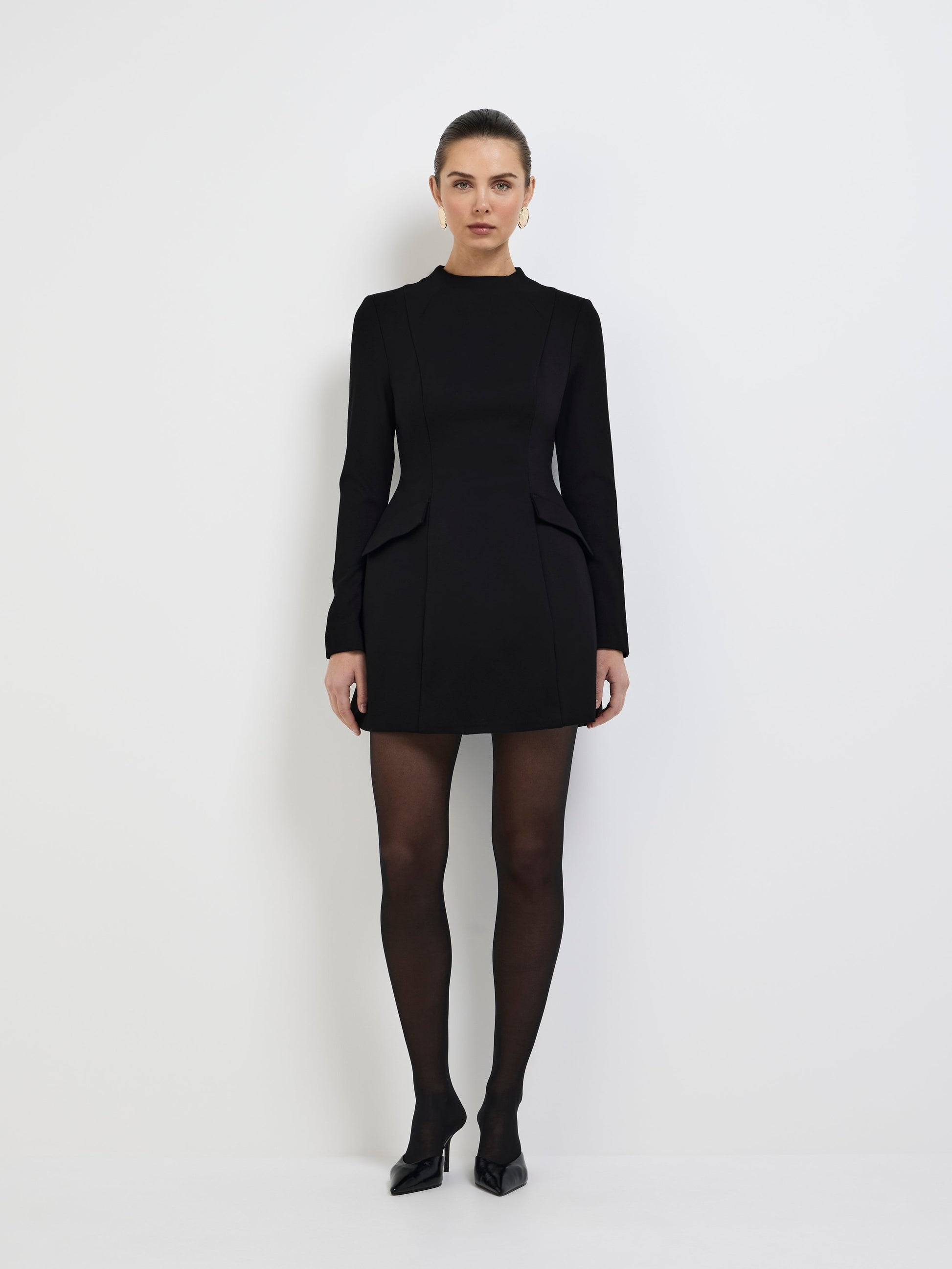Structured and sophisticated. The Alora Mini Dress showcases a black stretch fabrication, high neckline, long sleeves, structured tulip skirt with fitted bodice and mini skirt length. A statement-making little black dress with an impulse for drama. Pair with the Hannah Earrings to complete your look.