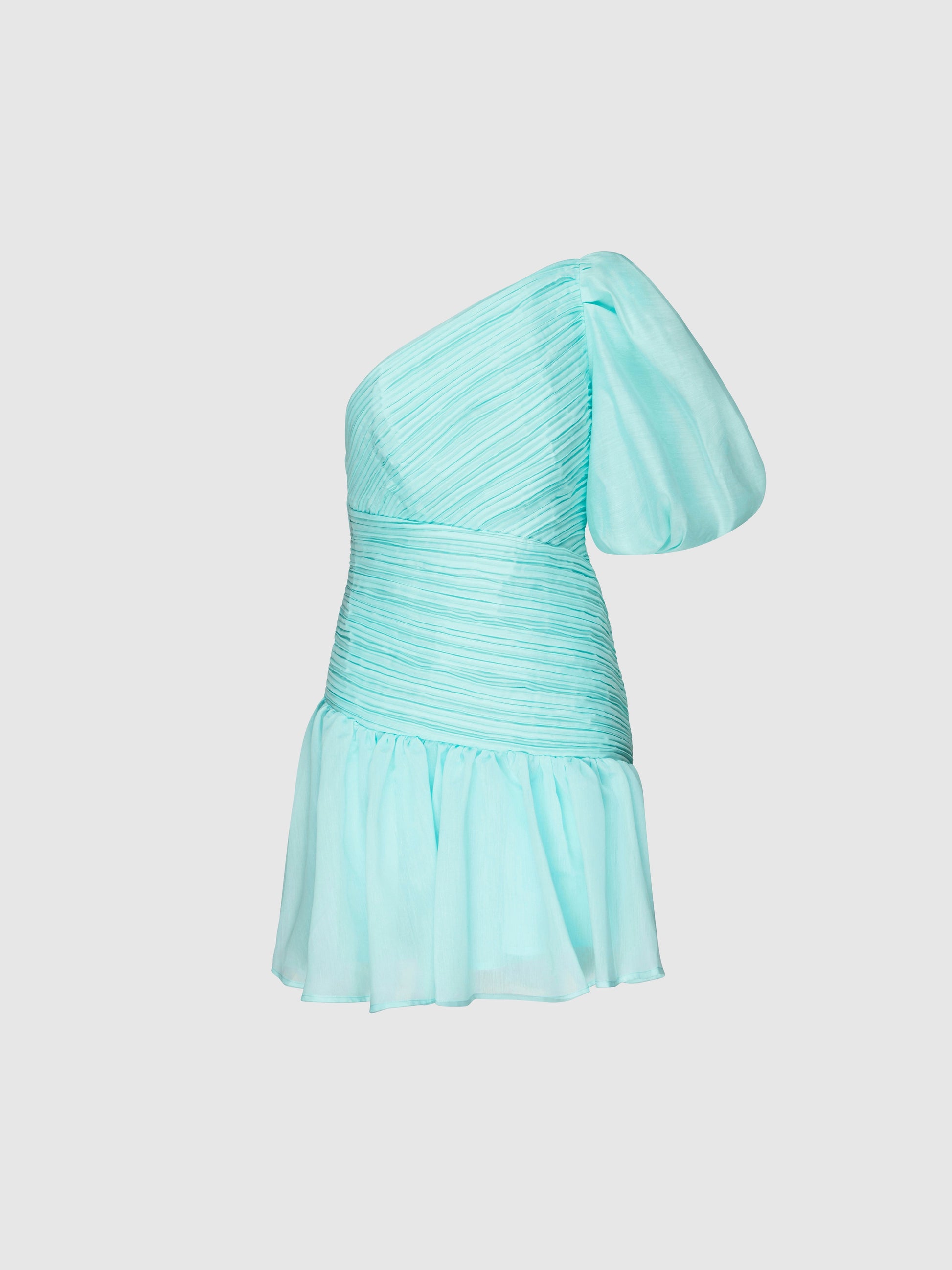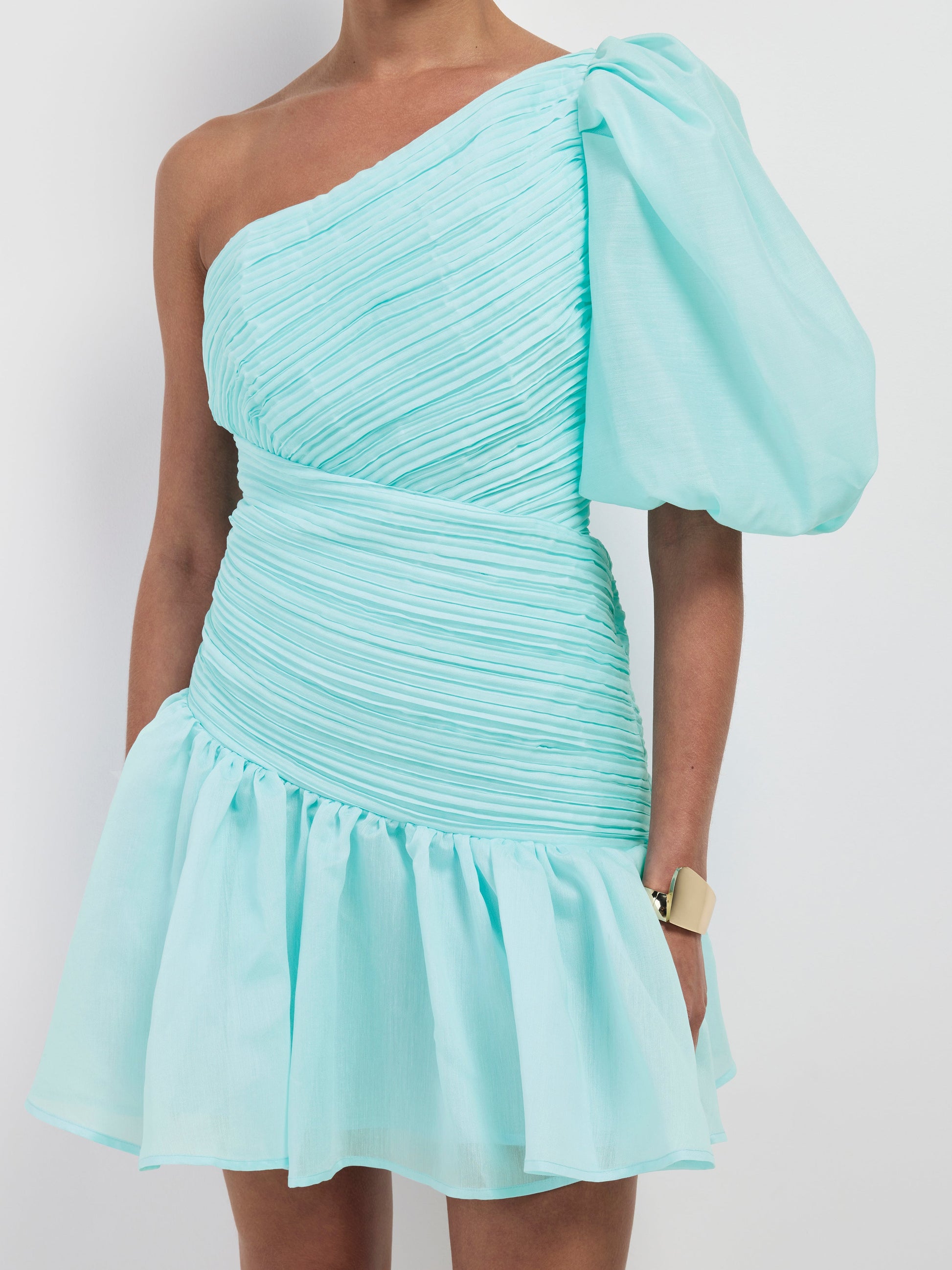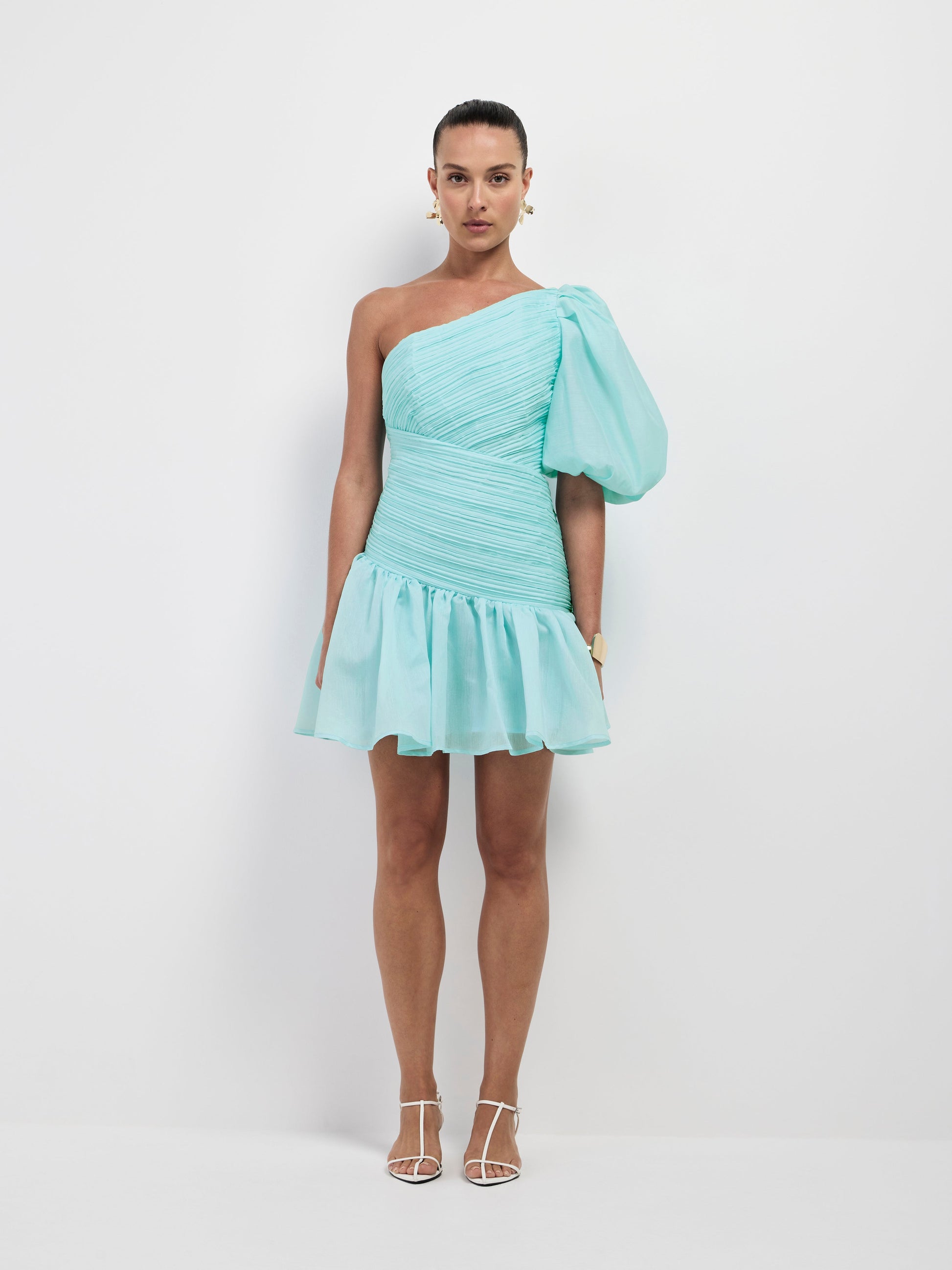 Unleash your inner muse with our Amelia Mini Dress - featuring an asymmetrical neckline with puff sleeve, aqua pleated fabrication, fitted styling with dropped waist and full gathered mini length skirt. Pair back with our Gardenia Earrings to take your look to the next level.