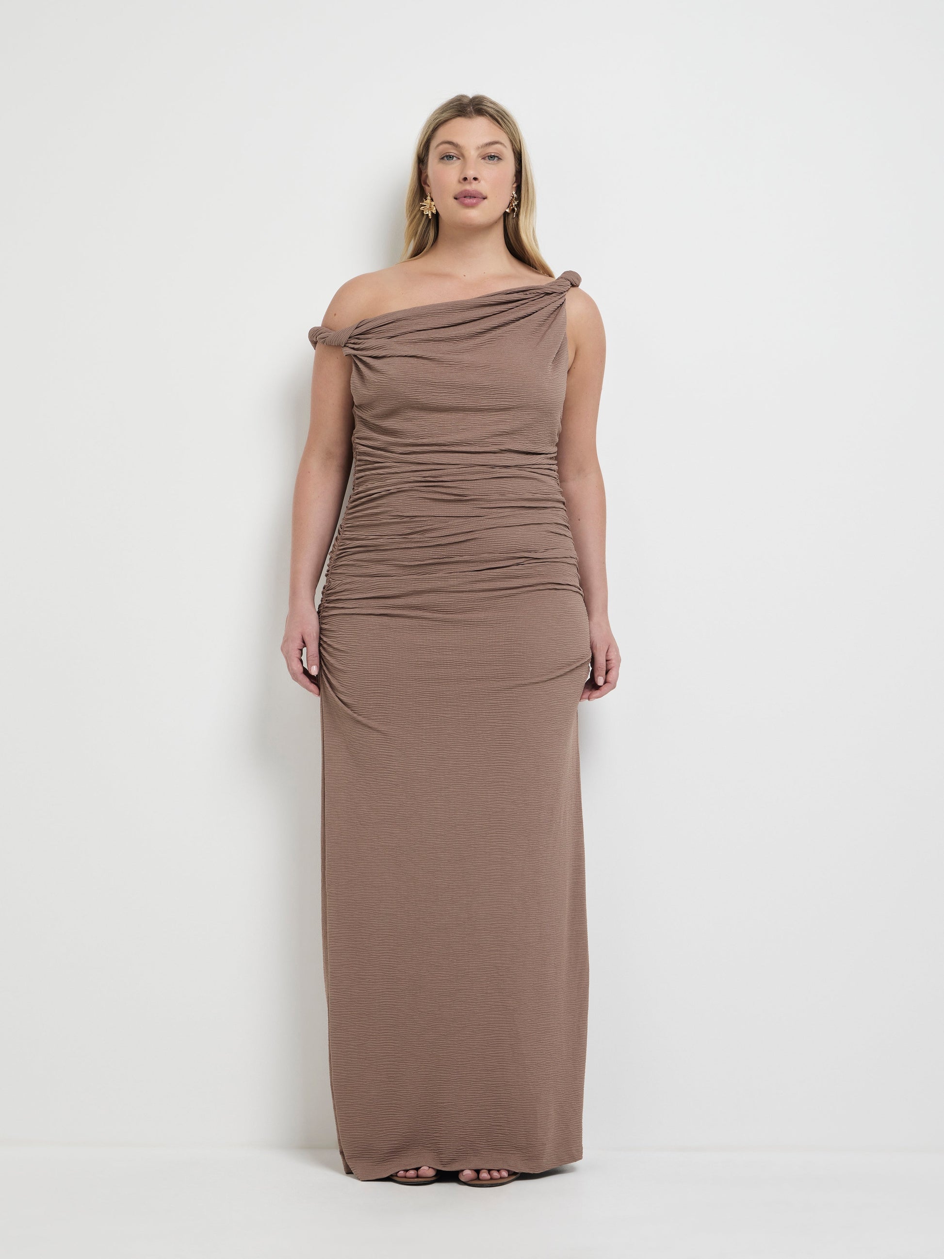 Classic beauty redefined. Introducing the Athena Dress - showcasing a brown stretch fabrication, slim fit cut, asymmetric neckline with twisted strap detailing and rouching at the waist. Pair with our Demi Earrings Stack to complete the look.