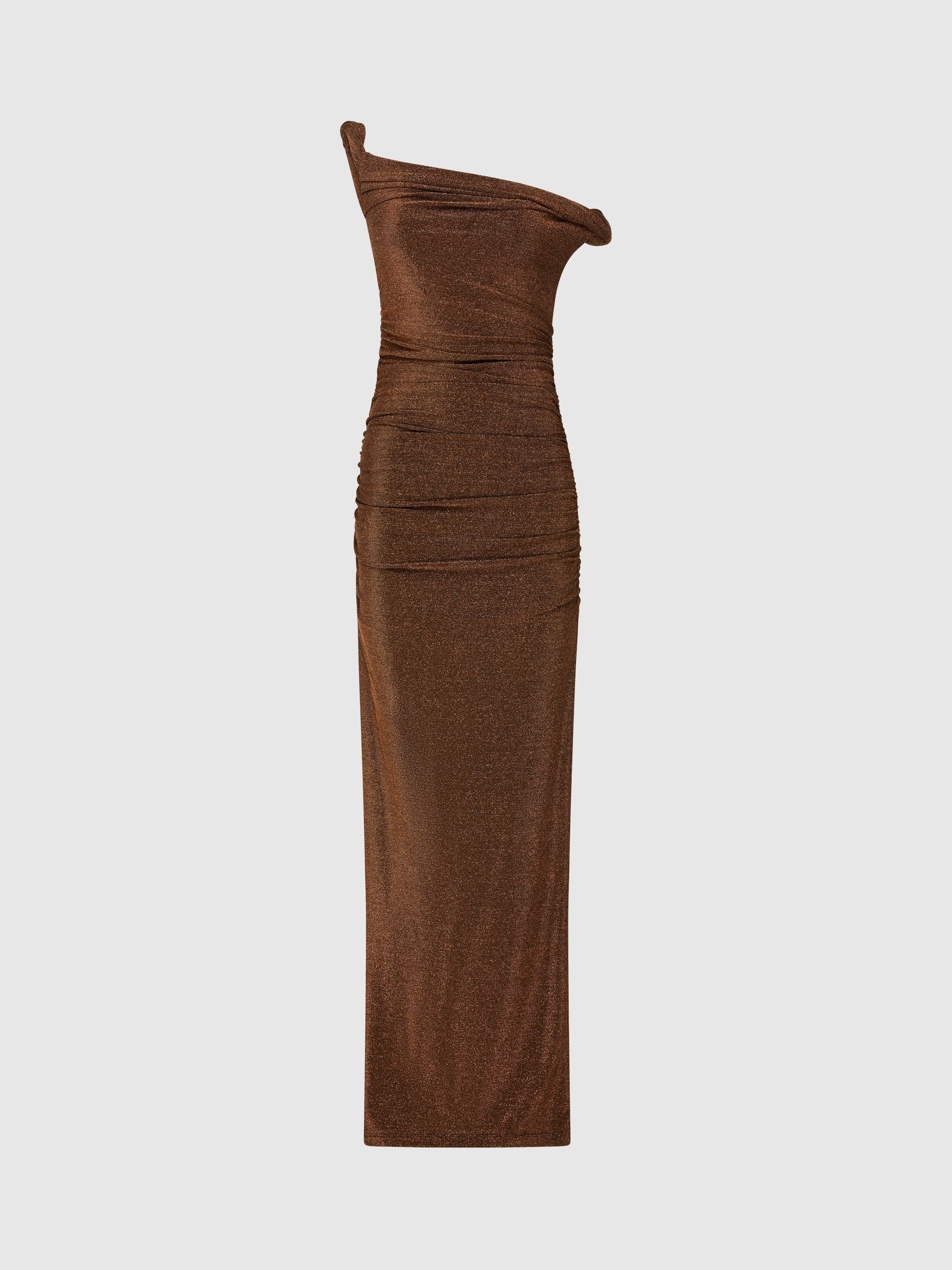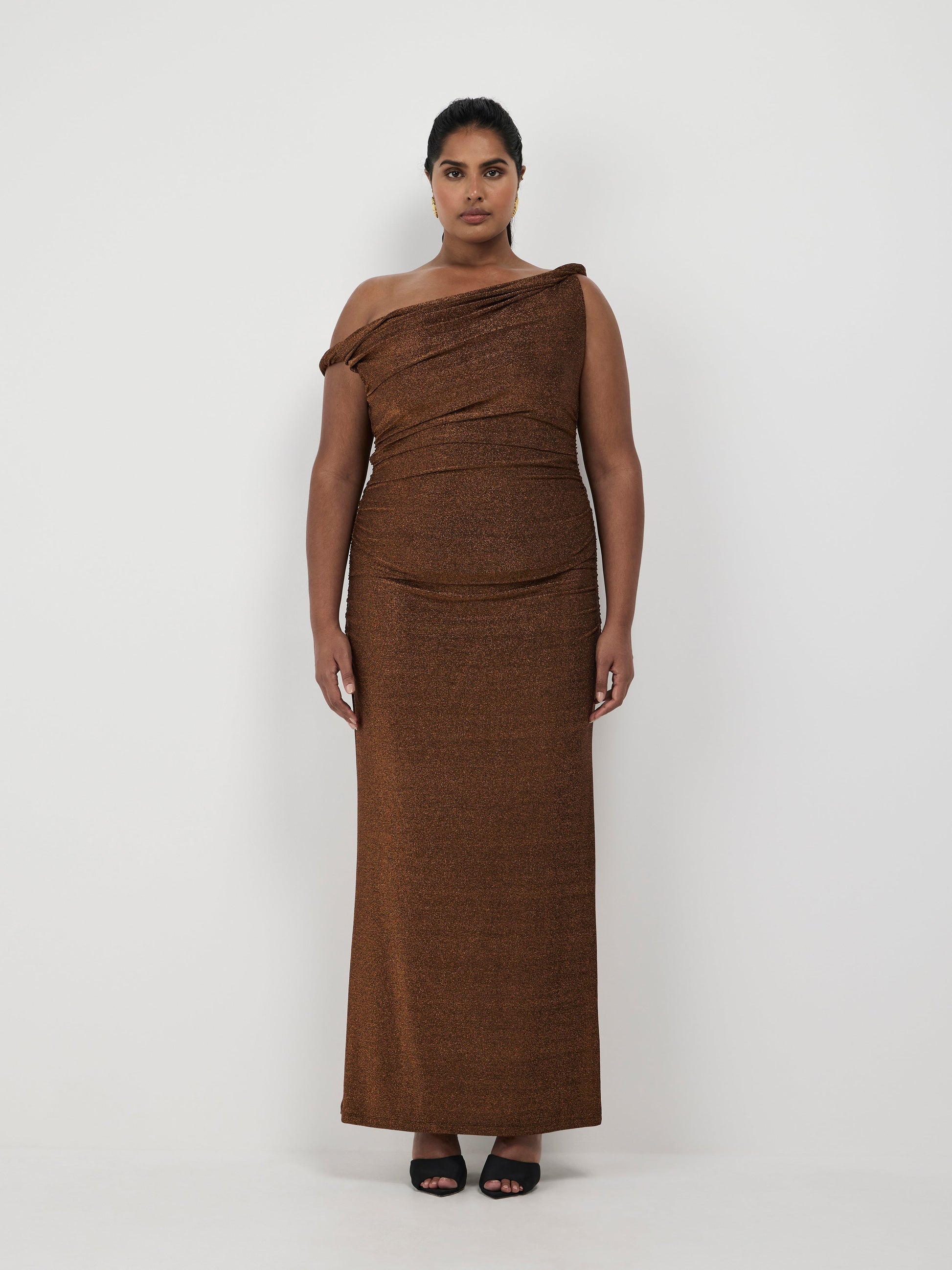 Classic beauty redefined. Introducing the Athena Dress - showcasing a metallic copper fabrication, slim fit cut, asymmetric neckline with twisted strap detailing and rouching at the waist. Pair with our Camilla Earrings to complete the look.