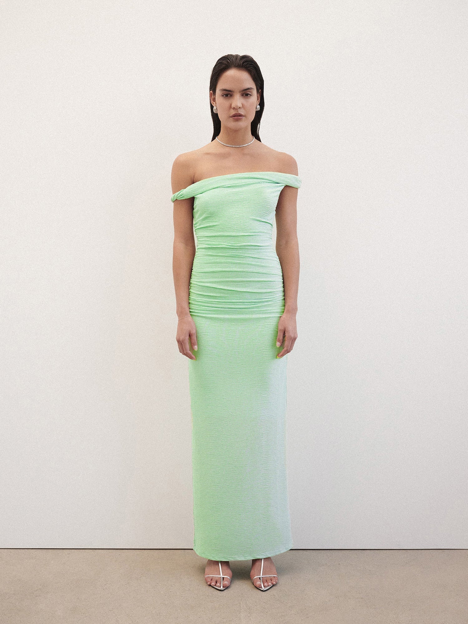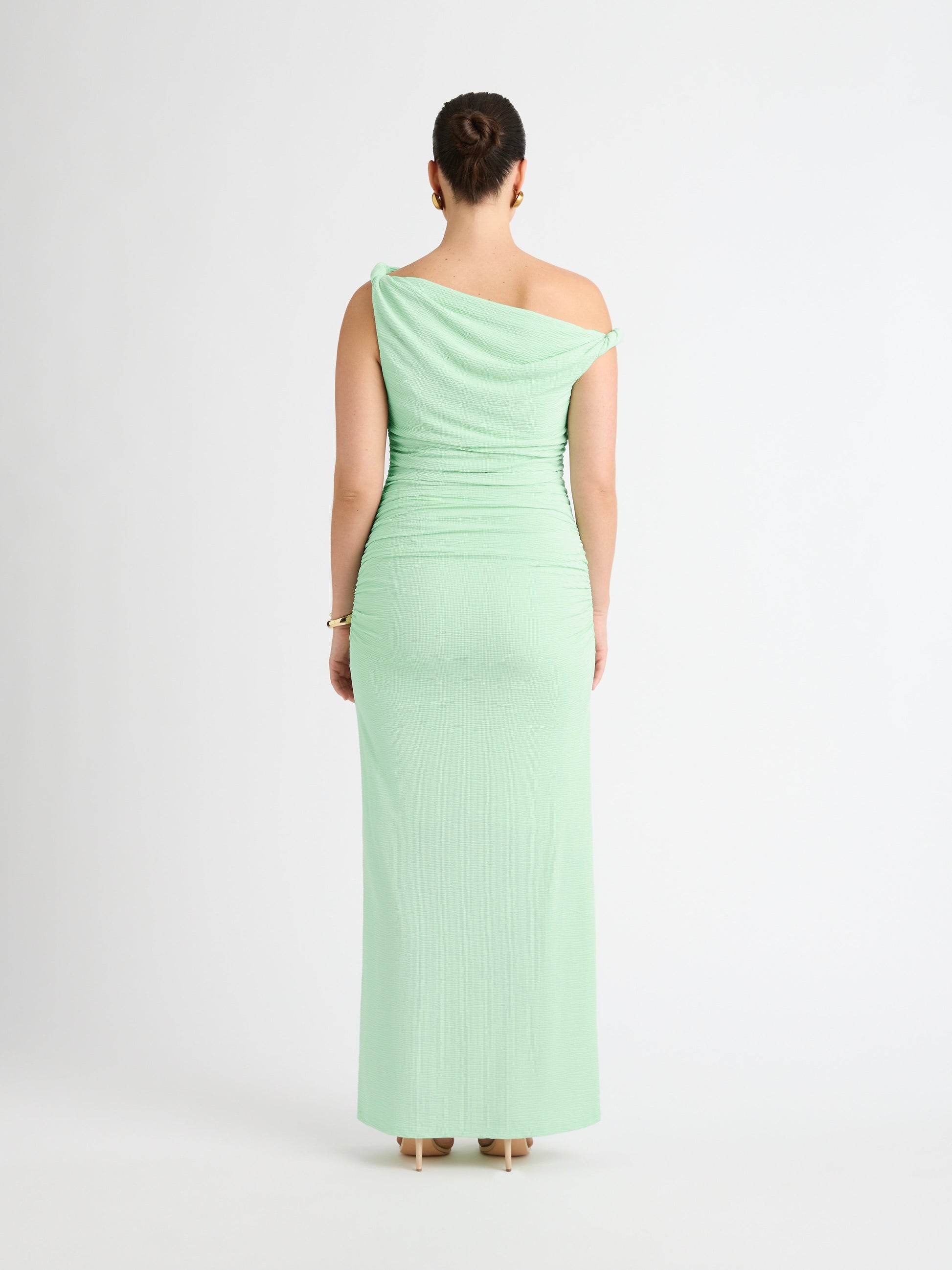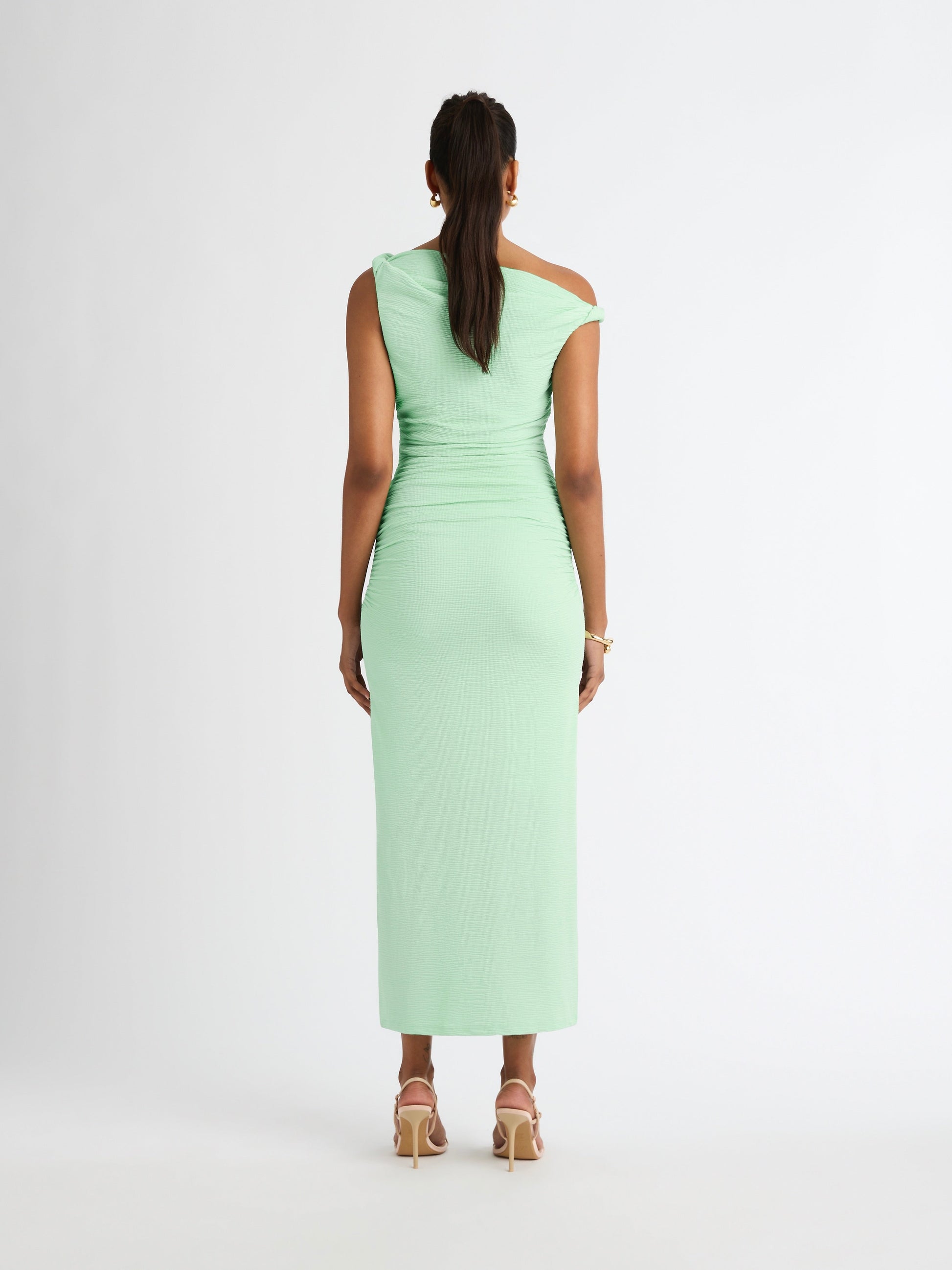 Classic beauty redefined. Introducing the Athena Dress - showcasing a mint stretch fabrication, slim fit cut, asymmetric neckline with twisted strap detailing and rouching at the waist. Pair with our Jesinta Earrings to complete the look.