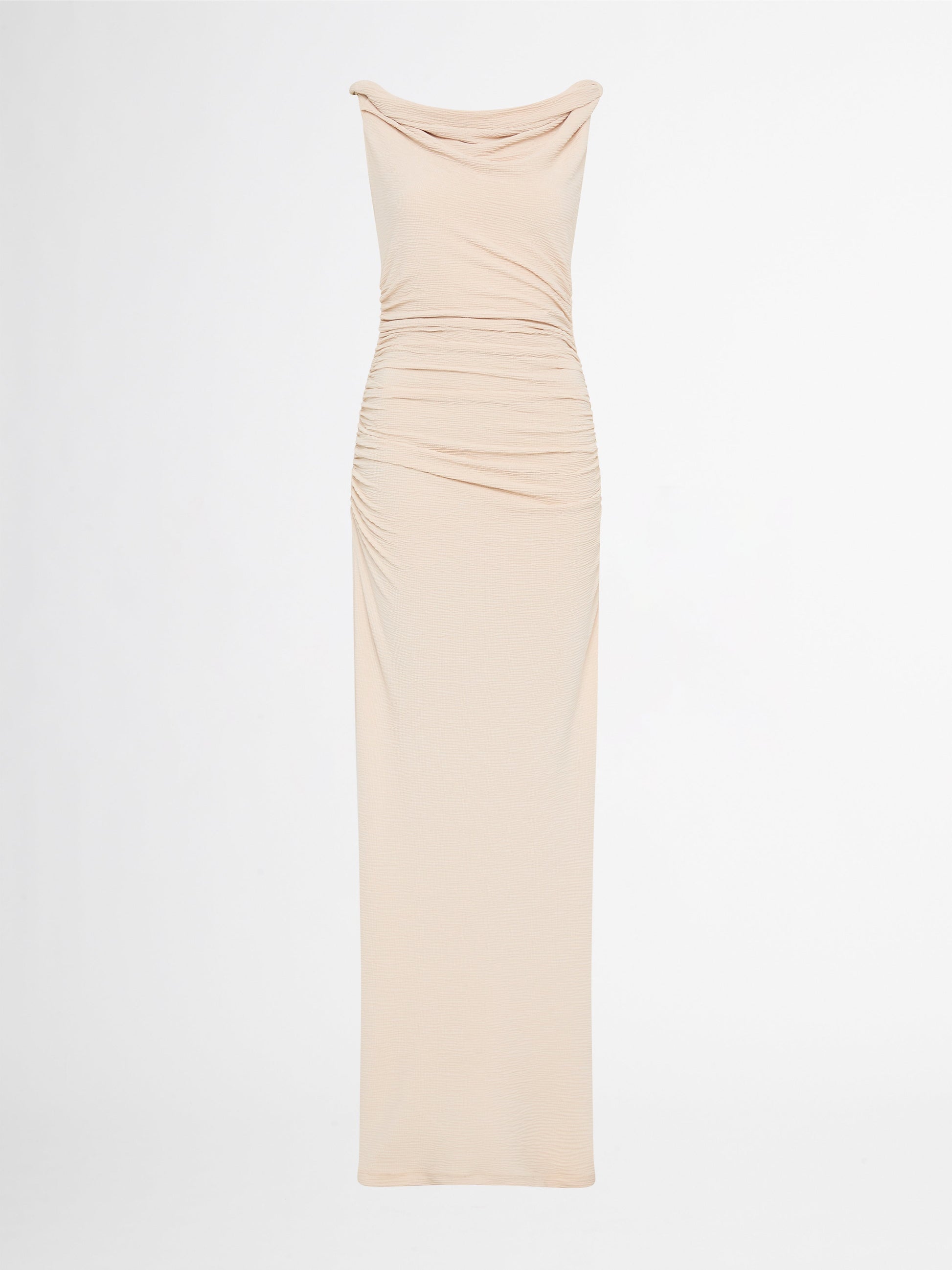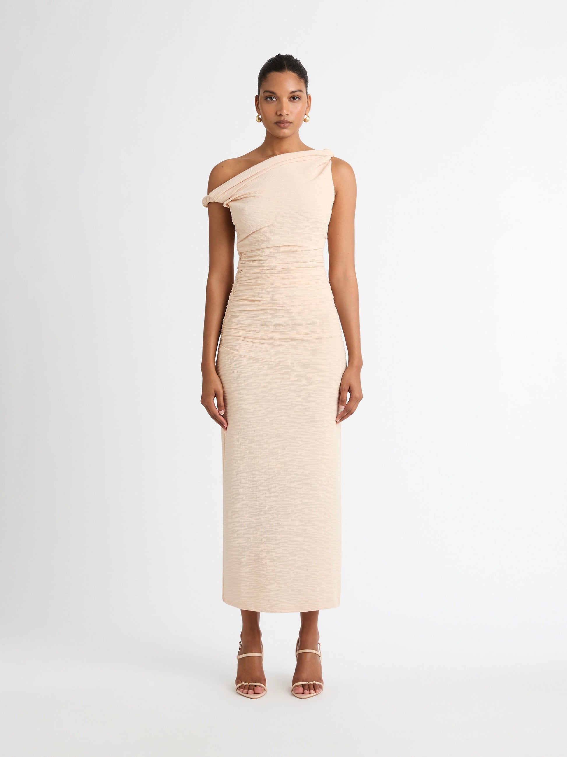 Classic beauty redefined. Introducing the Athena Dress - showcasing a slim fit cut, asymmetric neckline with twisted strap detailing and rouching at the waist. Pair with our Jesinta Earrings to complete the look.