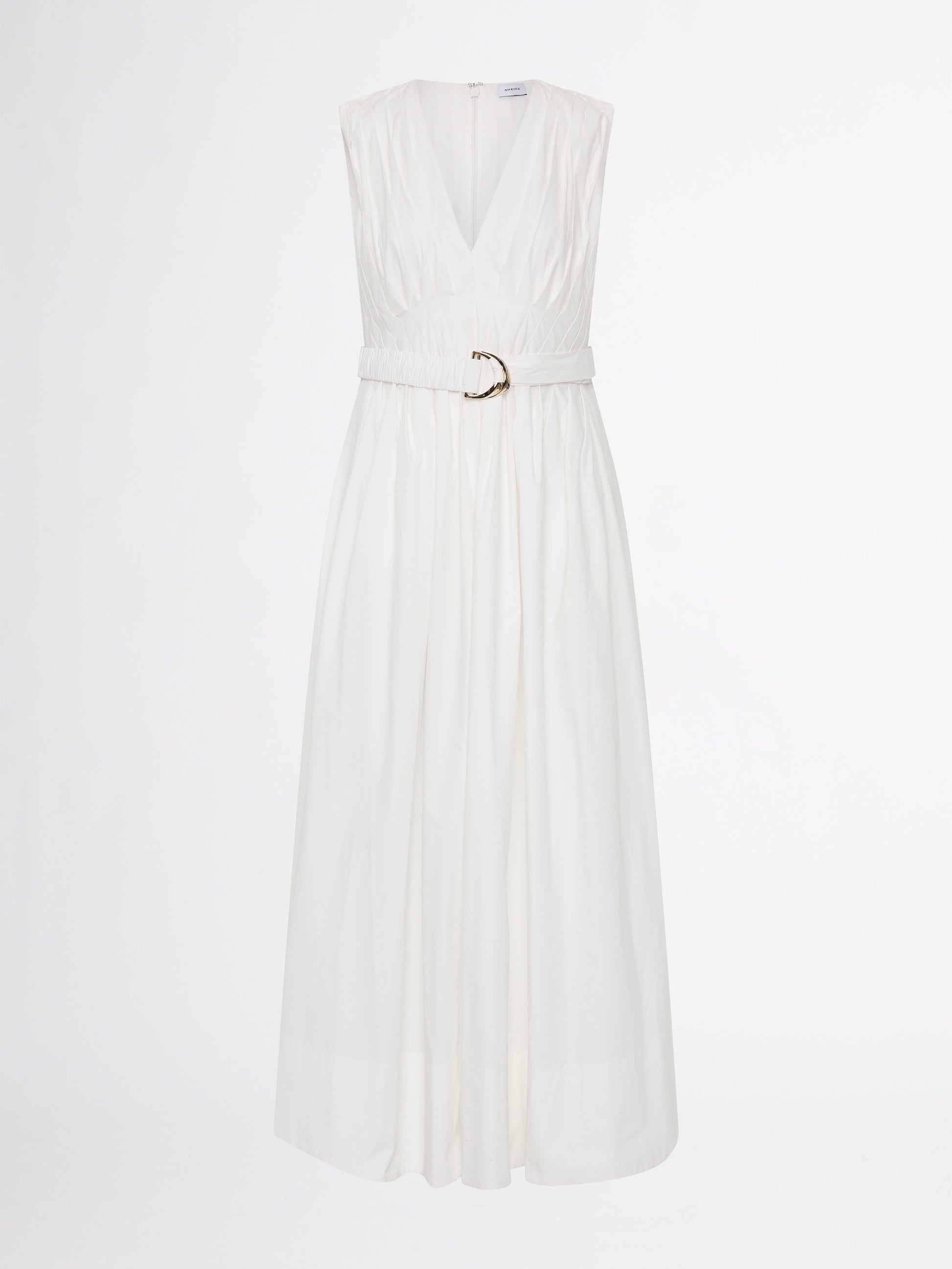 Refresh your wardrobe with the Avery Midi Dress - crafted from 100% white cotton this midi dress showcases a V-neckline with pleats/tucks across bodice and skirt, side seam pockets, A-line skirt and an elasticated belt. Pair with our Oceanic Earrings to complete the look.