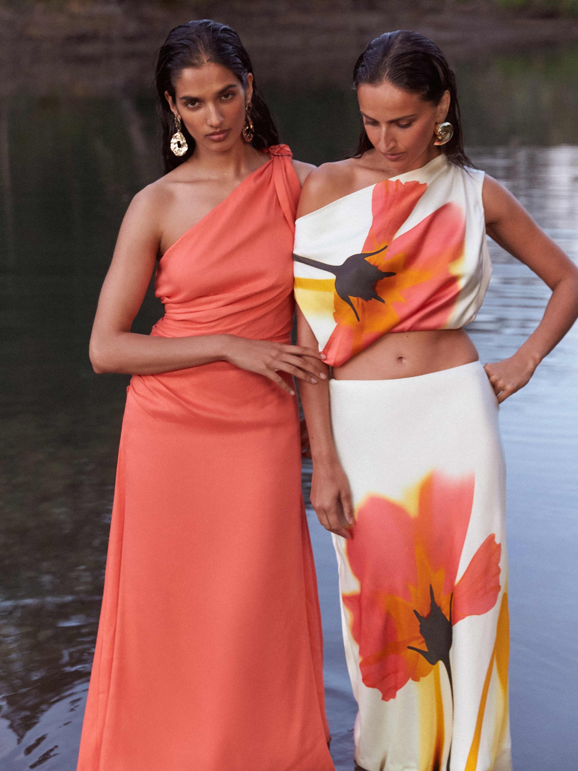 Make a lasting impression in decadent coral. Introducing the Azalea Midi Dress - showcasing a coral linen blend fabrication, fitted bodice with full skirt, one shoulder strap with self tying knot and midi skirt length. Pair with our Vanessa Earrings to complete the look.