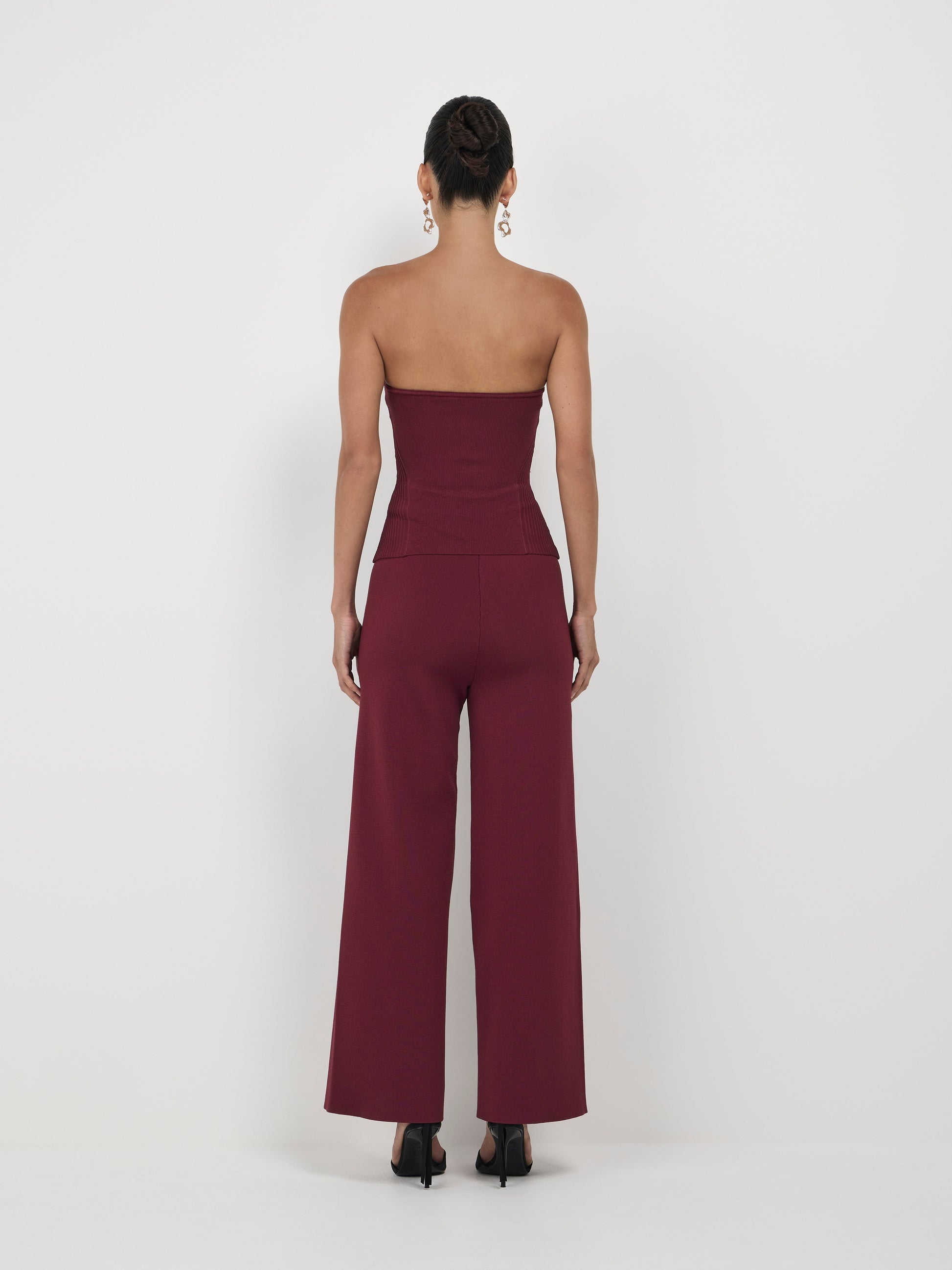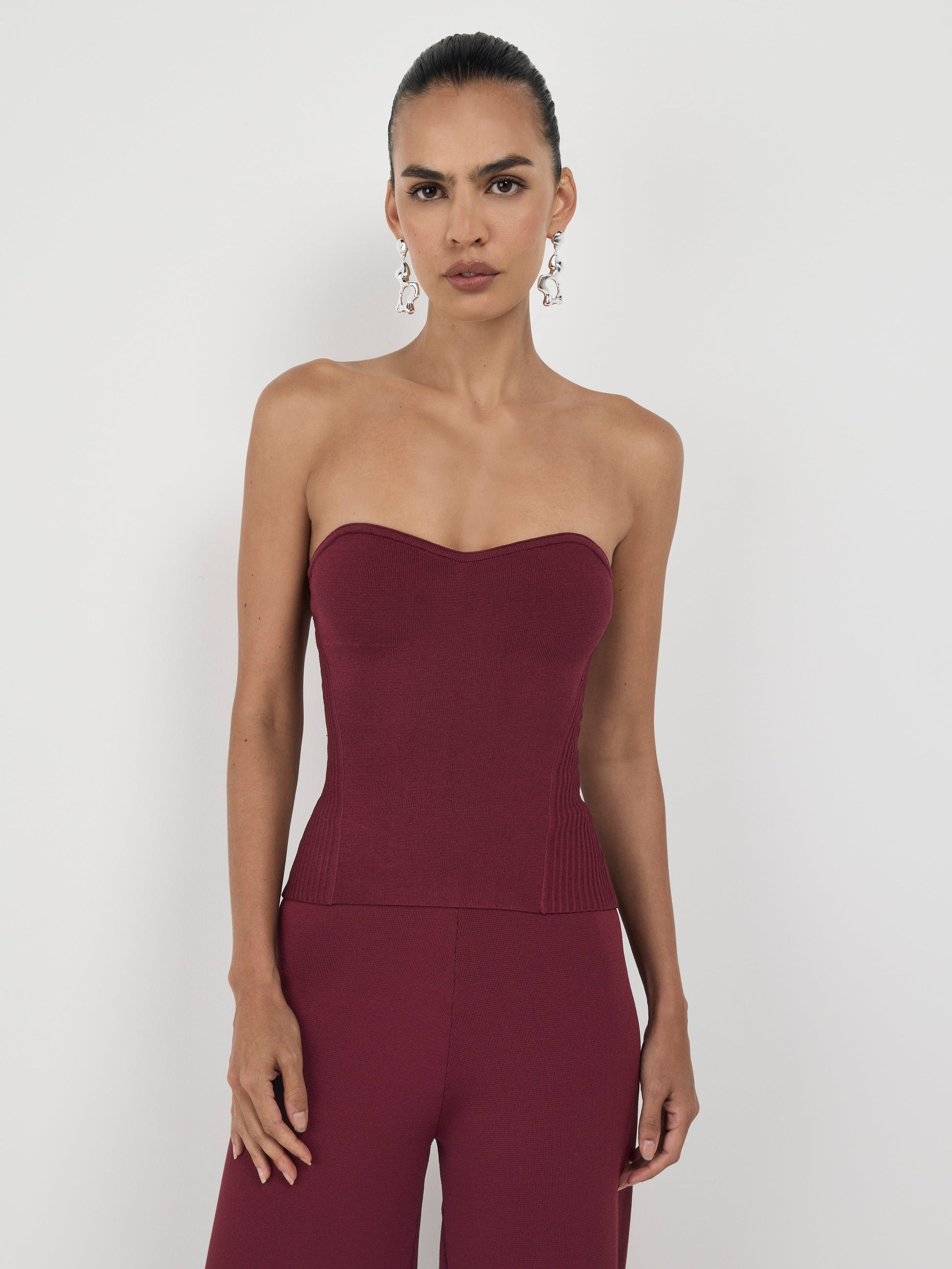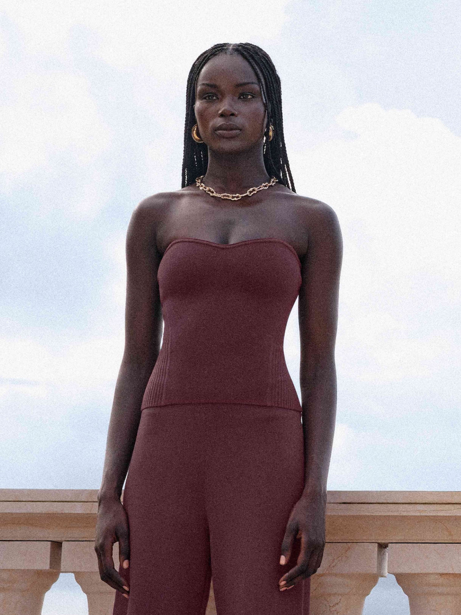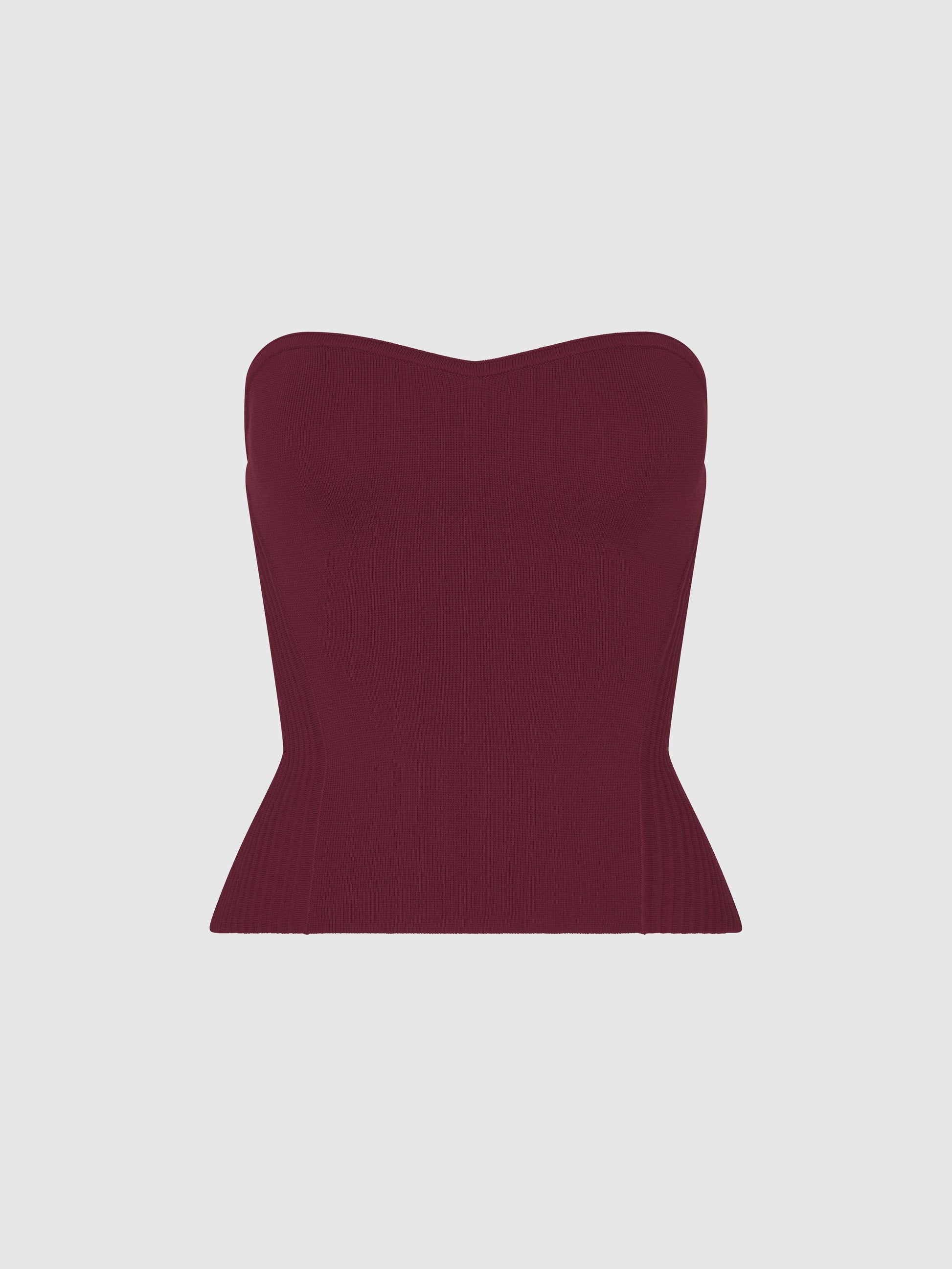 Bold in Burgundy - a statement shade for effortless sophistication. Introducing the Bailey Knit Top - featuring a strapless neckline with grip tape, slim fit and is a burgundy true knit fabrication. Pair back with our matching Bailey Knit Pant or Bailey Knit Mini Skirt for an effortless look.