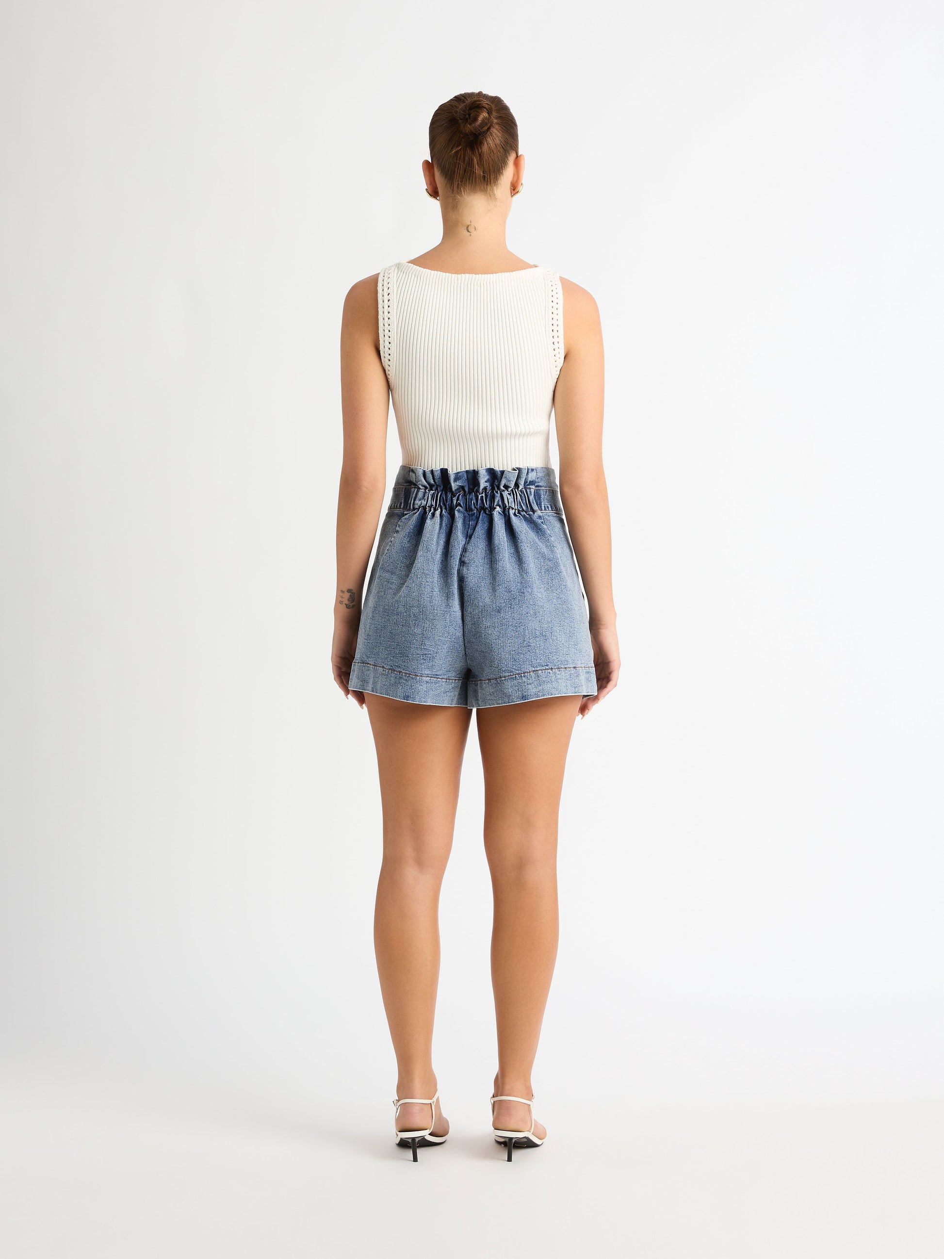 Our Blaire Shorts are here and they are a wardrobe must have this Season! Featuring denim stretch fabrication, high paper-bag waist, elasticated back waistband, non functional gold buttons at waist and side pockets. Pair with our Diego Top to complete the look.