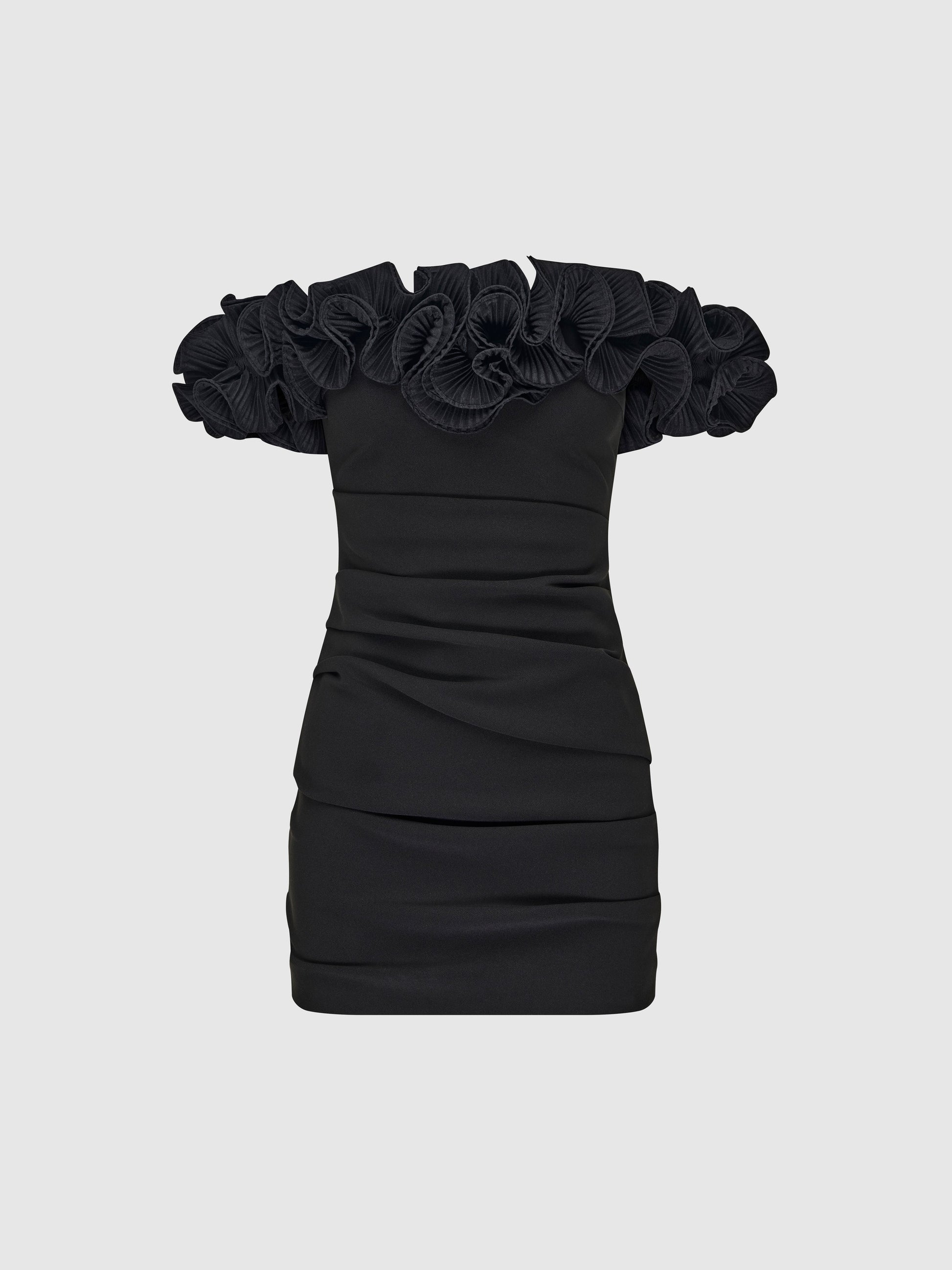 Add a hint of romance to your look with the Blissful Mini Dress. Showcasing fitted styling, off shoulder styling with pleated ruffle detail across front and over arm, asymmetrical tuck detailing at front and a mini skirt length. Pair with our Daria Earrings to complete the look!