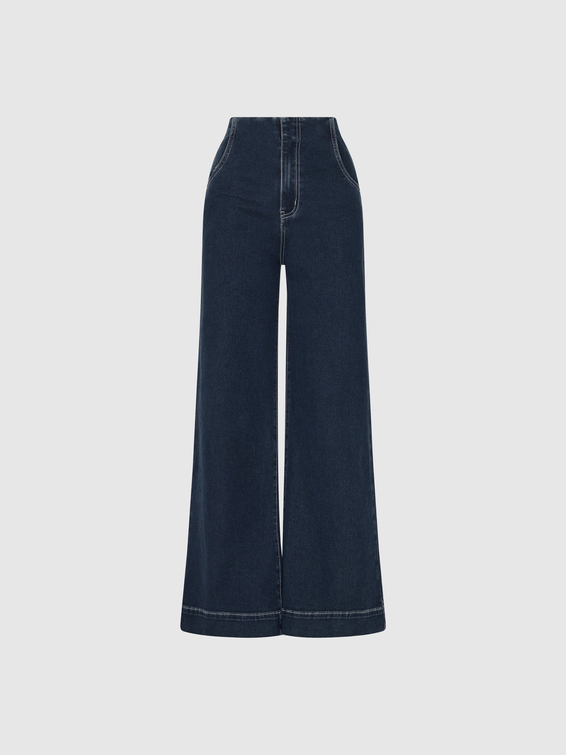 Denim, But Make It Luxe - Introducing the Broadway Jean. Showcasing a stretch denim fabrication, fitted styling, mid rise waist, back welt detail, contrast white stitching and wide pant legs. Pair with our matching Broadway Denim Shirt to complete the look.