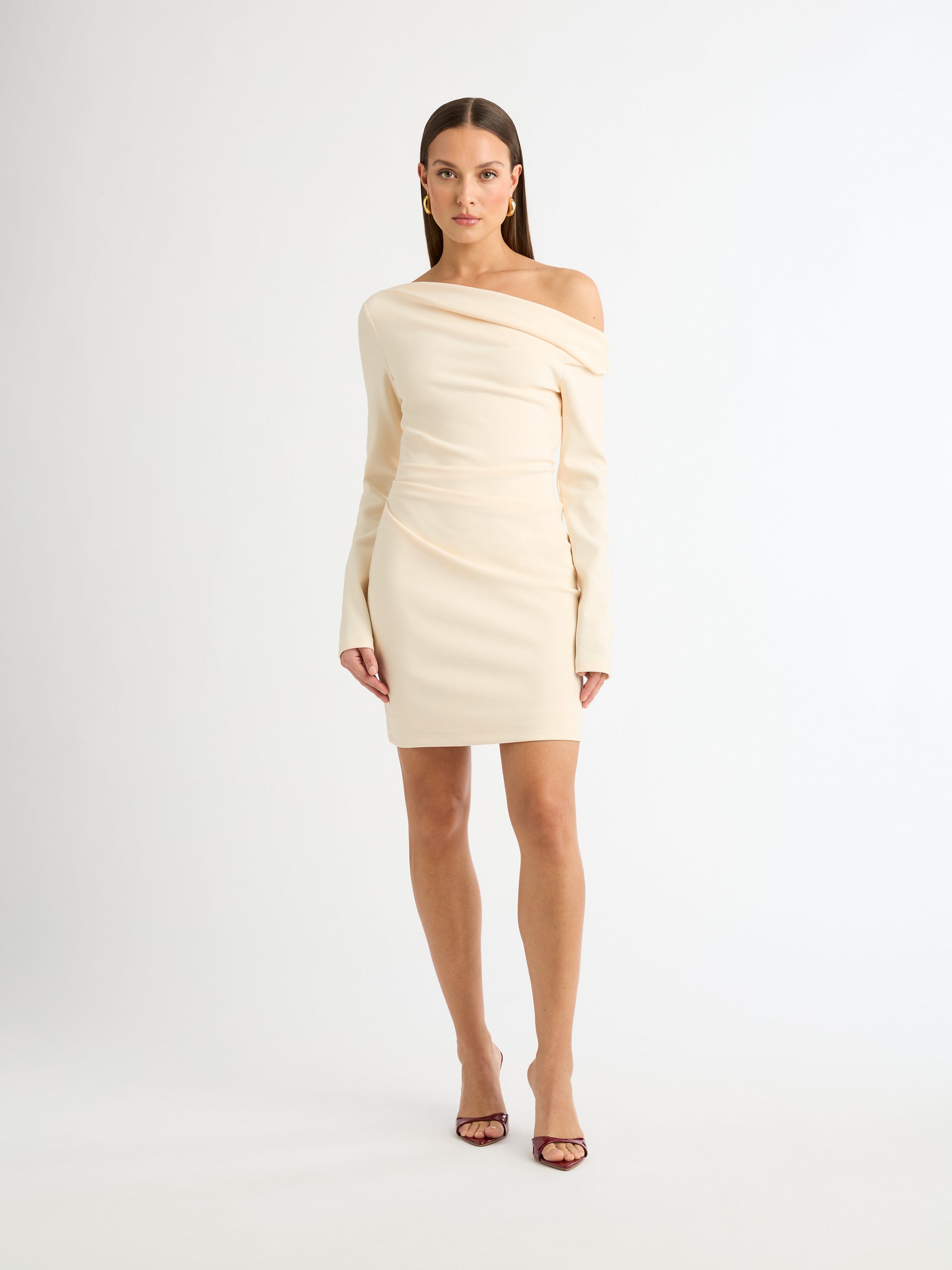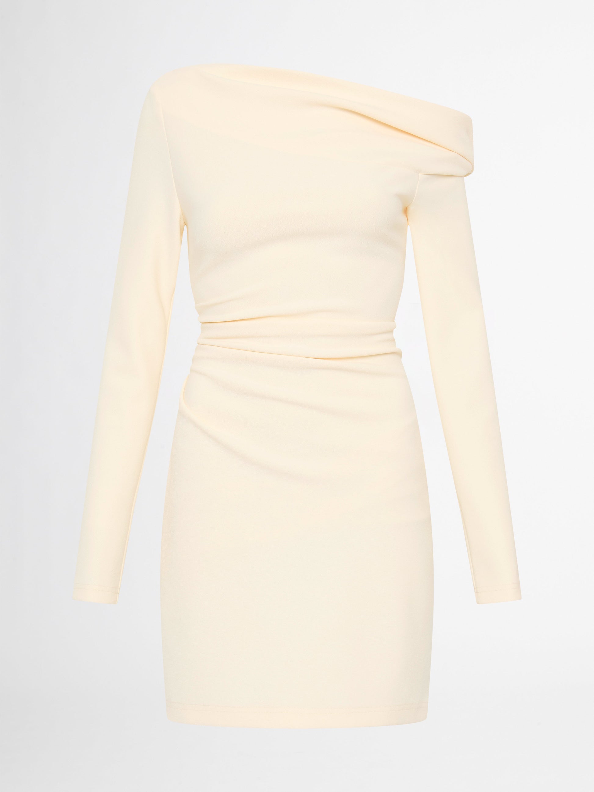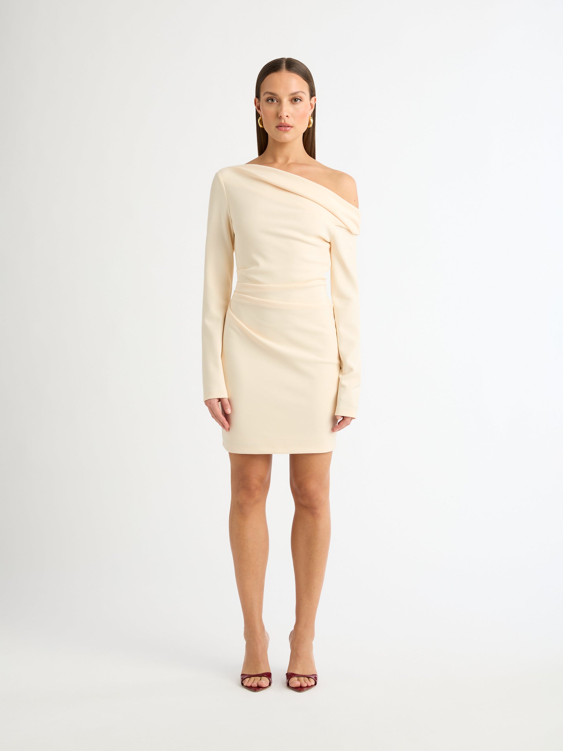 Let your style do the talking with our Brydie Mini Dress - featuring a butter coloured stretch fabrication, fitted cut, asymmetric neckline, one side off shoulder with long sleeves, tucks at bodice and waist and mini skirt length. Pair back with our Marissa Hoop Earrings to complete the look.
