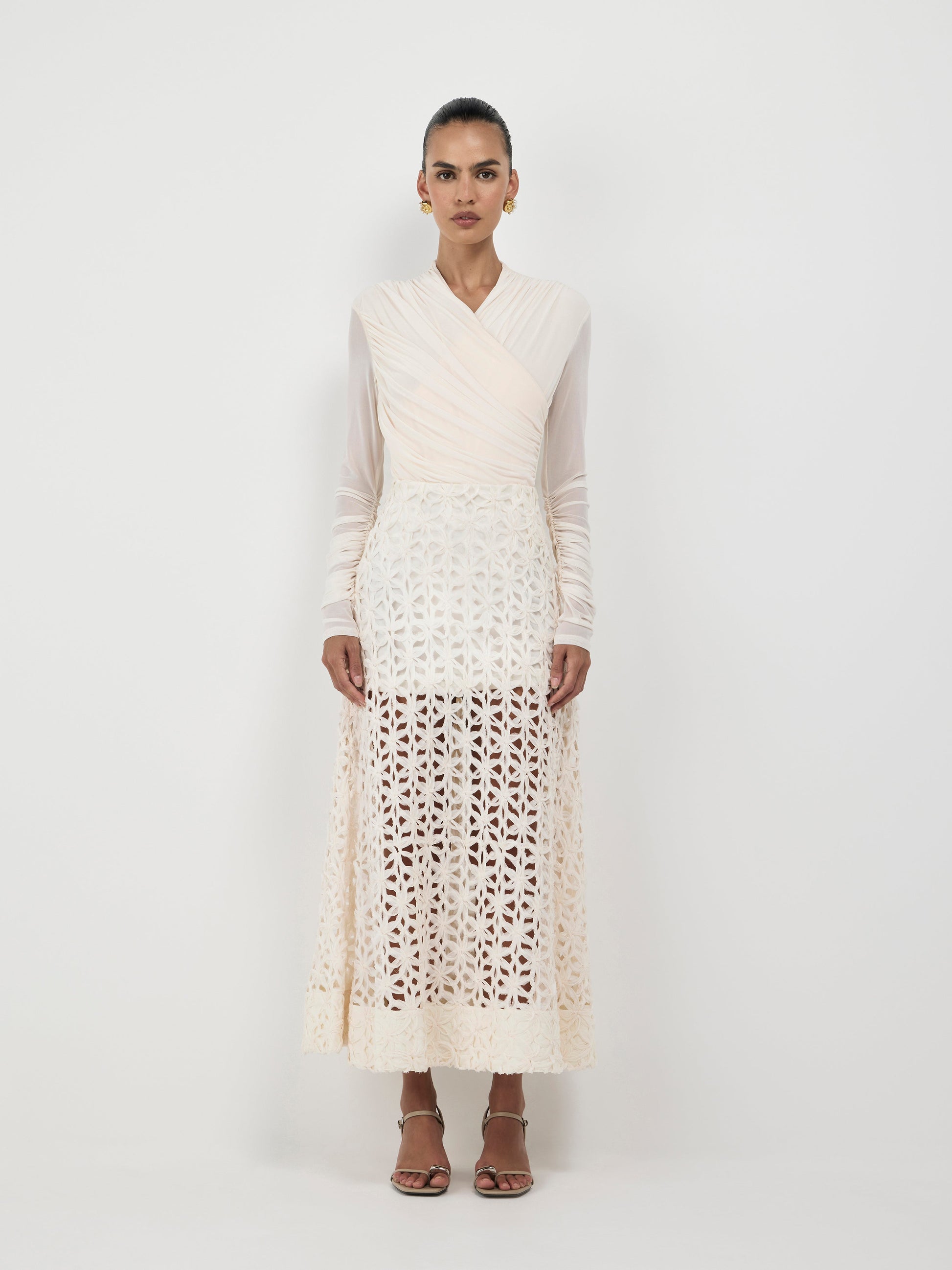 Step into the spotlight with confidence. Introducing our Camille Bodysuit - featuring a ivory mesh stretch fabrication, fitted styling, high neckline, gathered on body and shoulders and press stud closure. Pair back with our Sutton Pant or Audrey Maxi Skirt to complete your look.