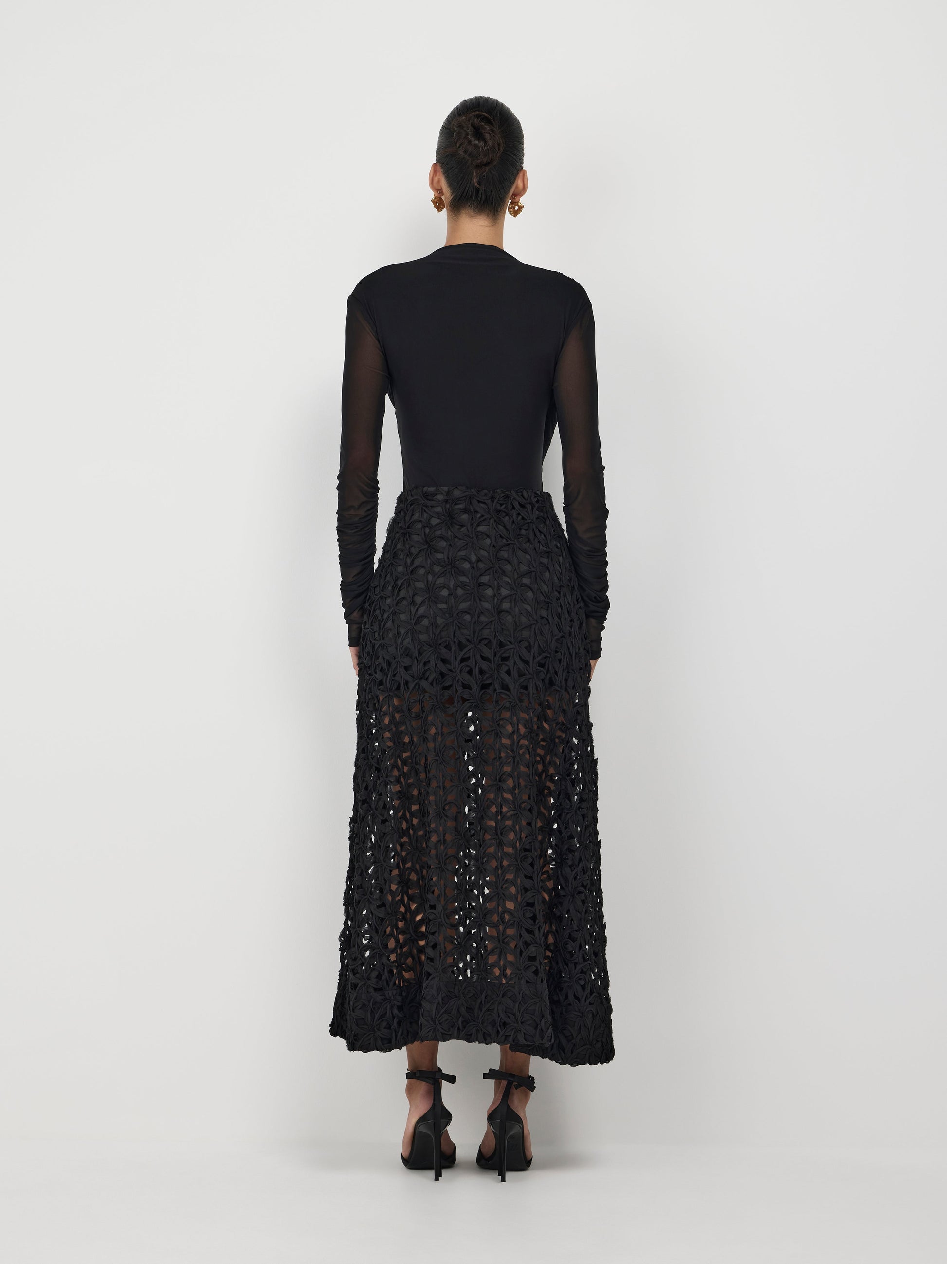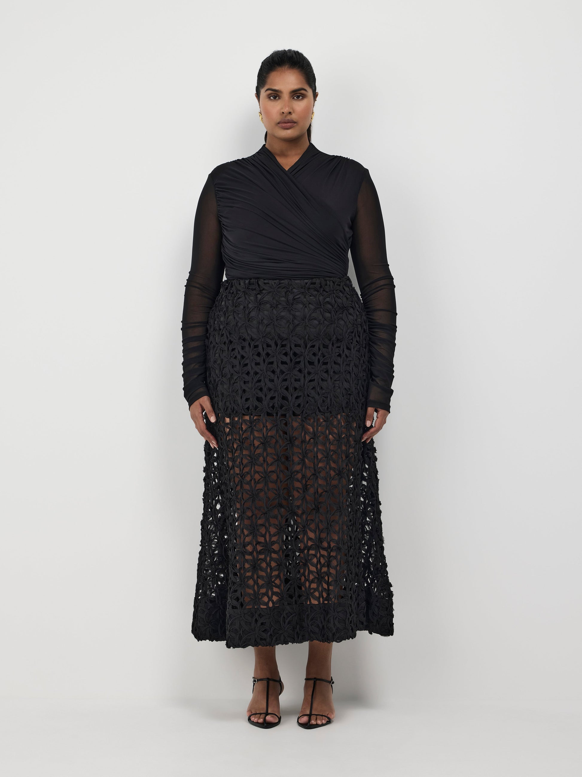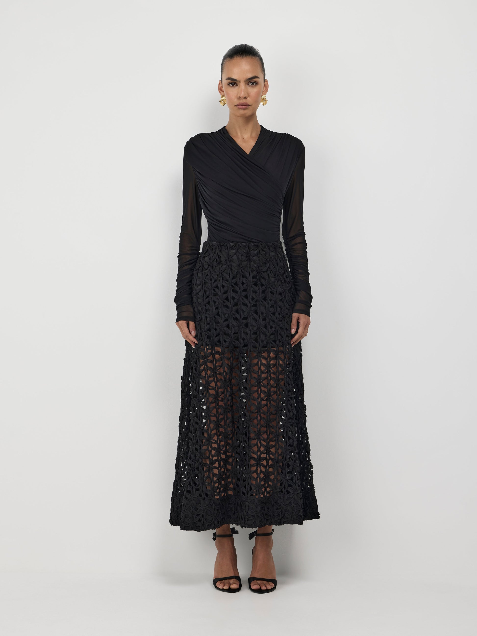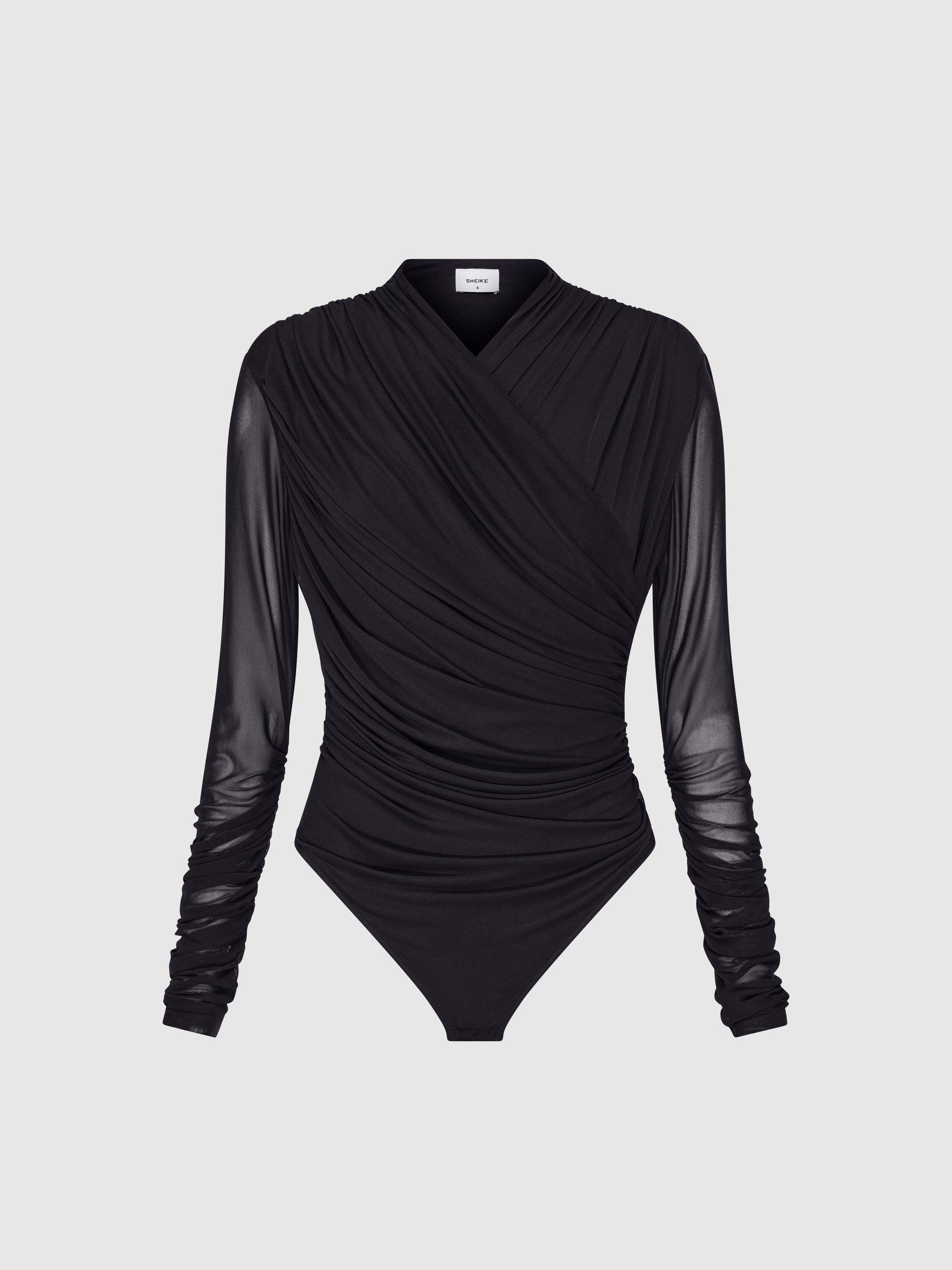 Step into the spotlight with confidence. Introducing our Camille Bodysuit - featuring a black mesh stretch fabrication, fitted styling, high neckline, gathered on body and shoulders and press stud closure. Pair back with our Audrey Maxi Skirt to complete your look.