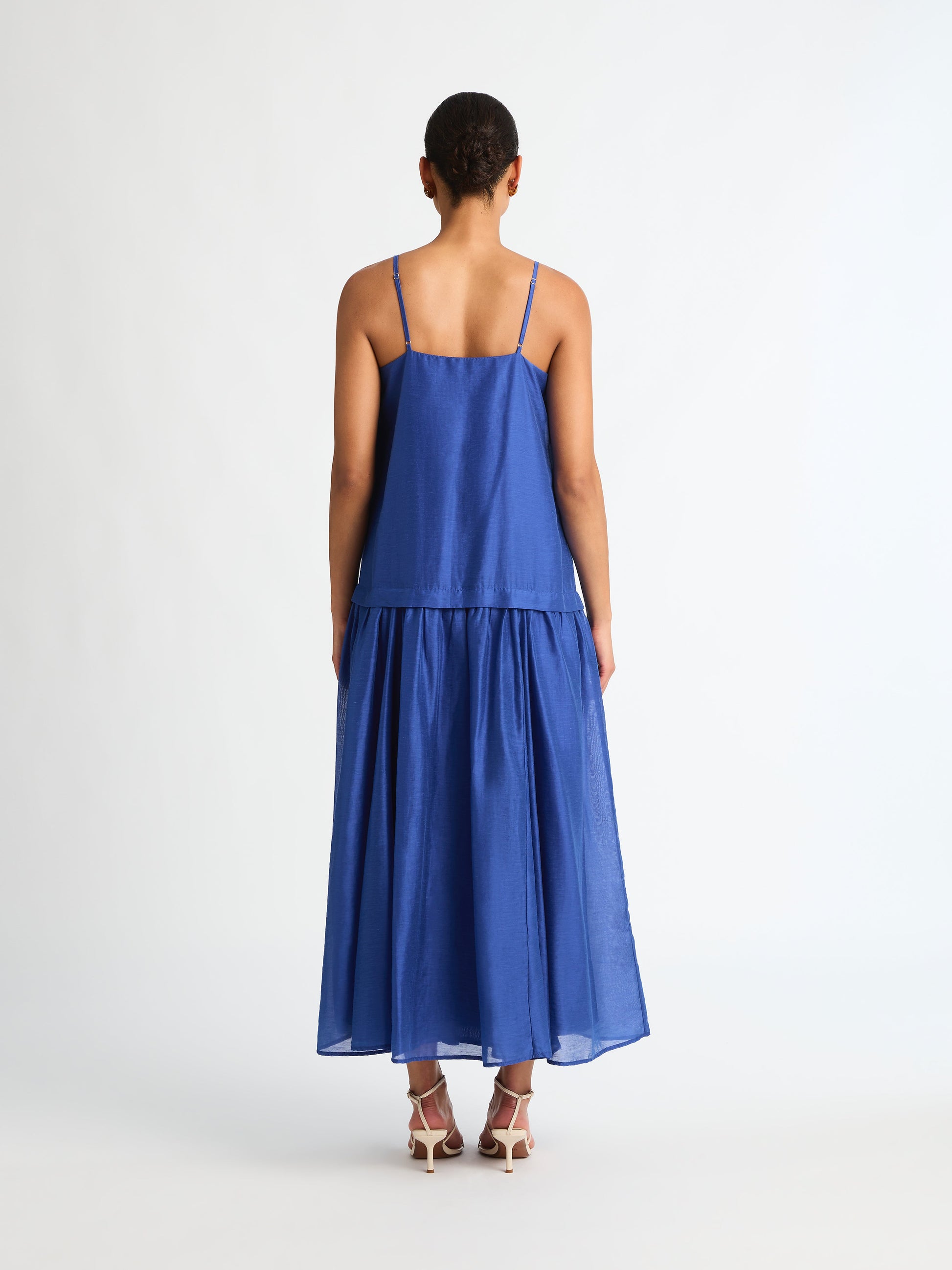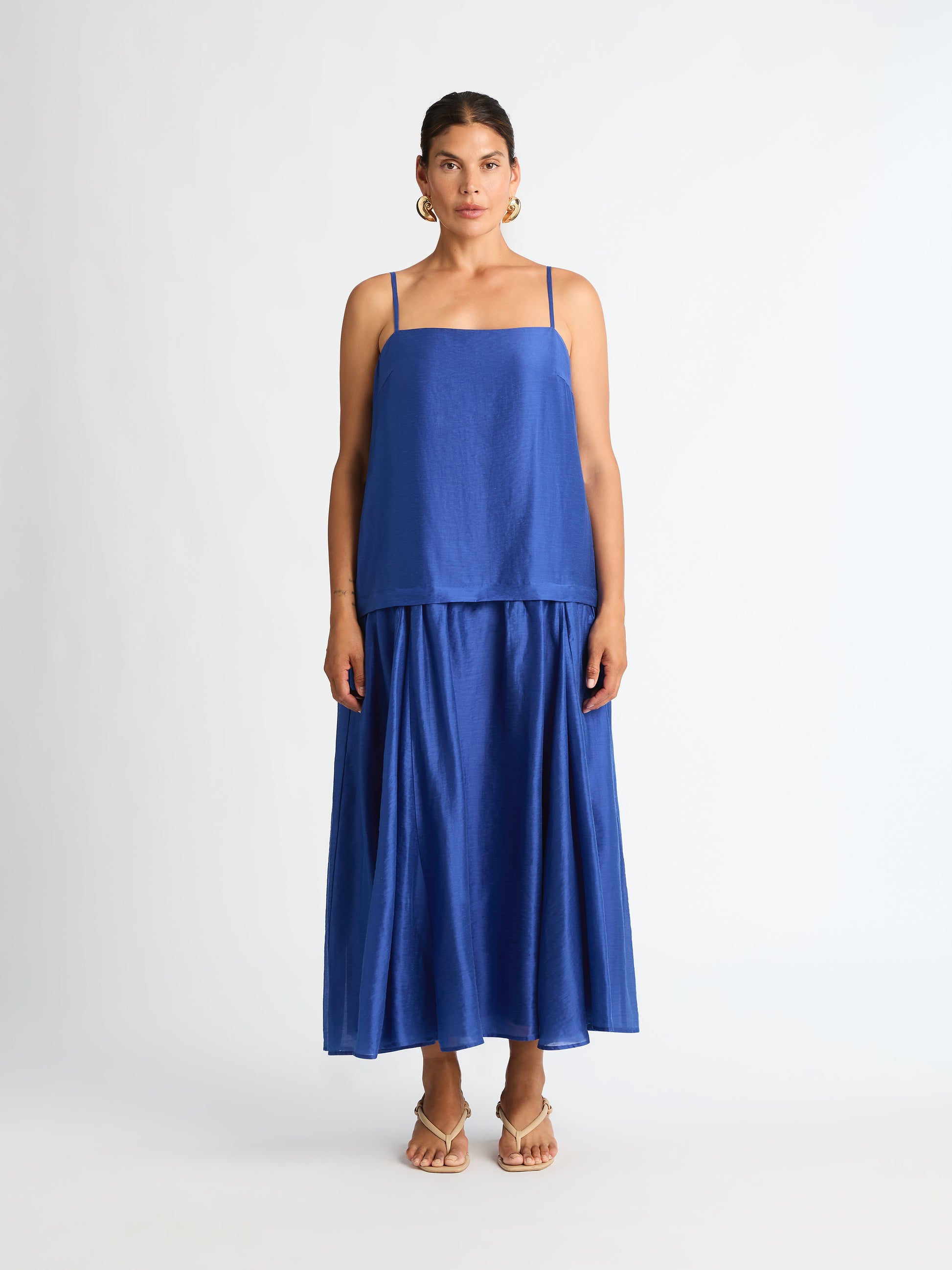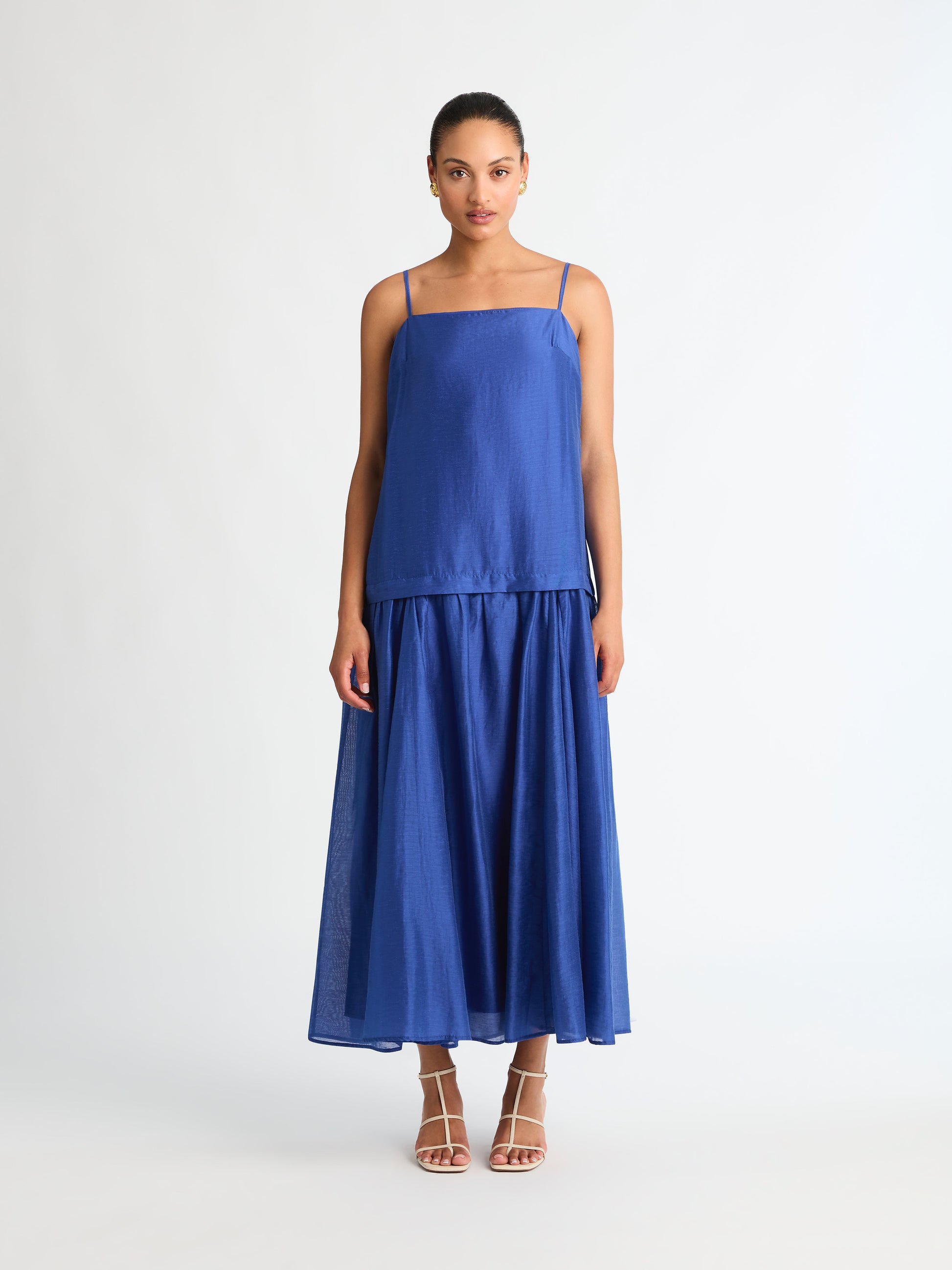 Breezy and bold in the Capri Maxi Dress! Showcasing a cobalt blue woven fabrication, relaxed oversized styling, straight neckline, dropped waist and maxi length skirt. Style with our Oceanic Earrings to complete the look.