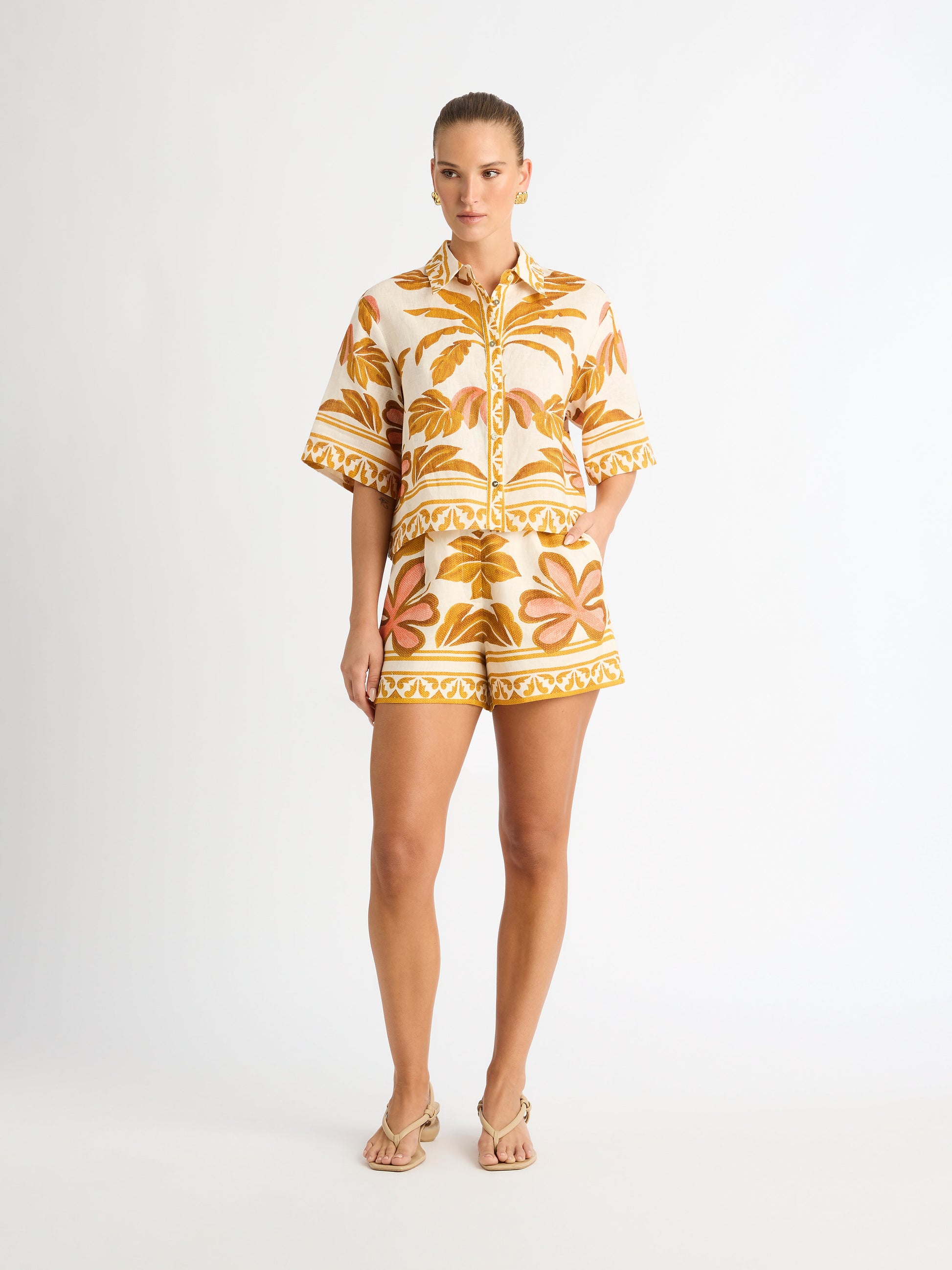 Add a touch of summer to your wardrobe with the Carmelita Shirt. Showcasing a lux printed linen fabrication, relaxed fit, cropped length, collar, short sleeves and front placket opening with gold buttons. Pair with our matching Carmelita Pant or Carmelita Shorts to complete the look.