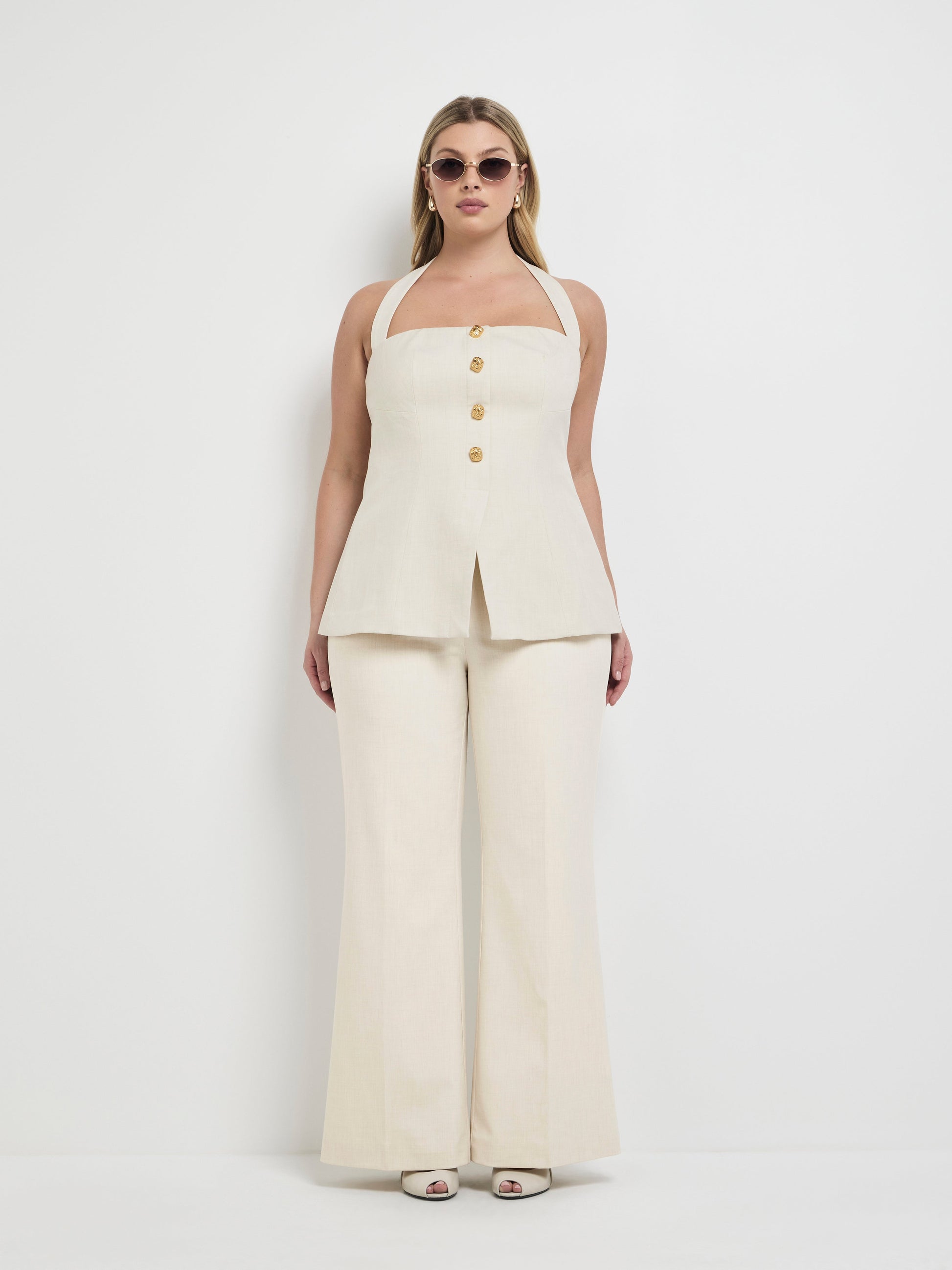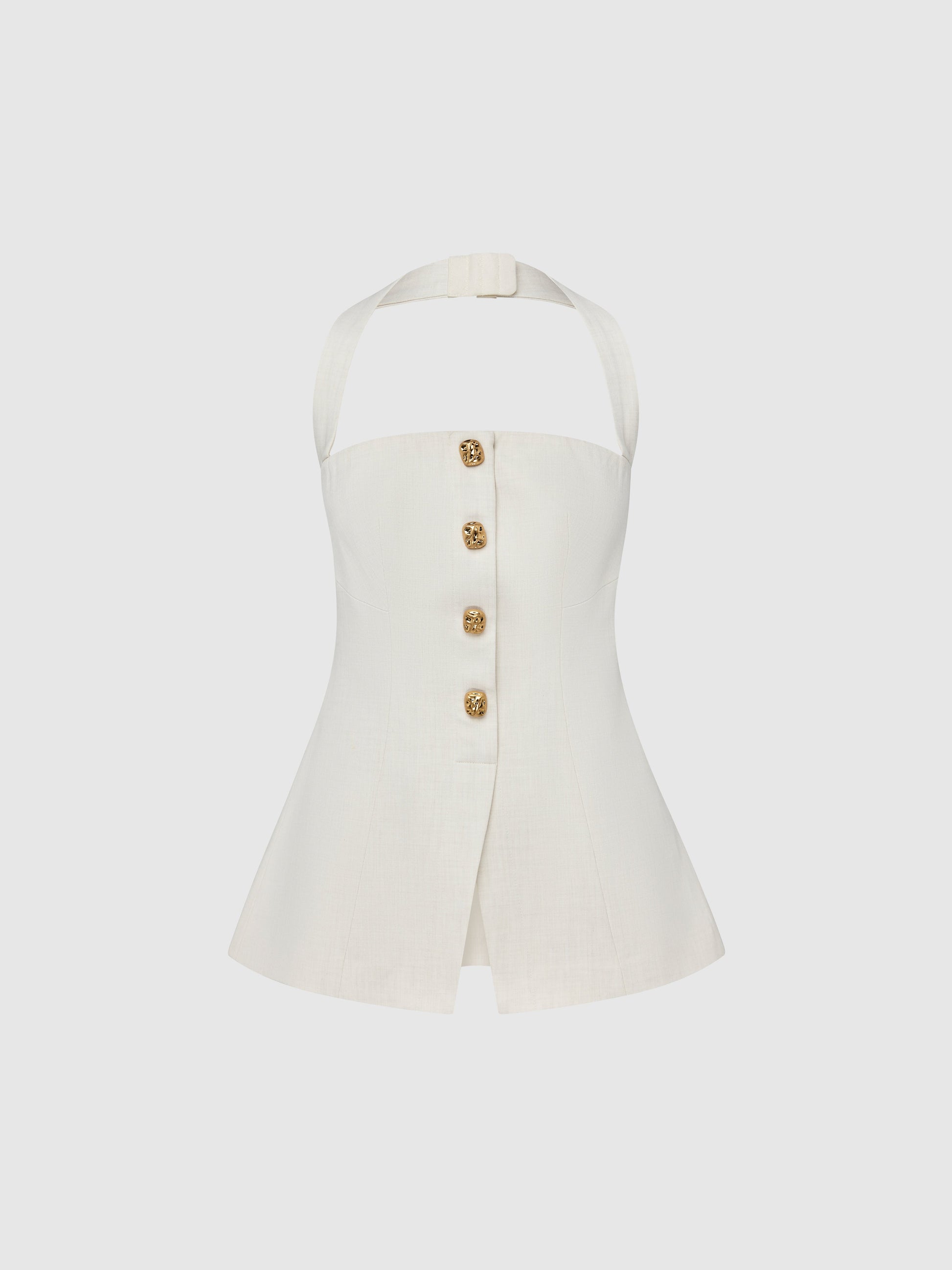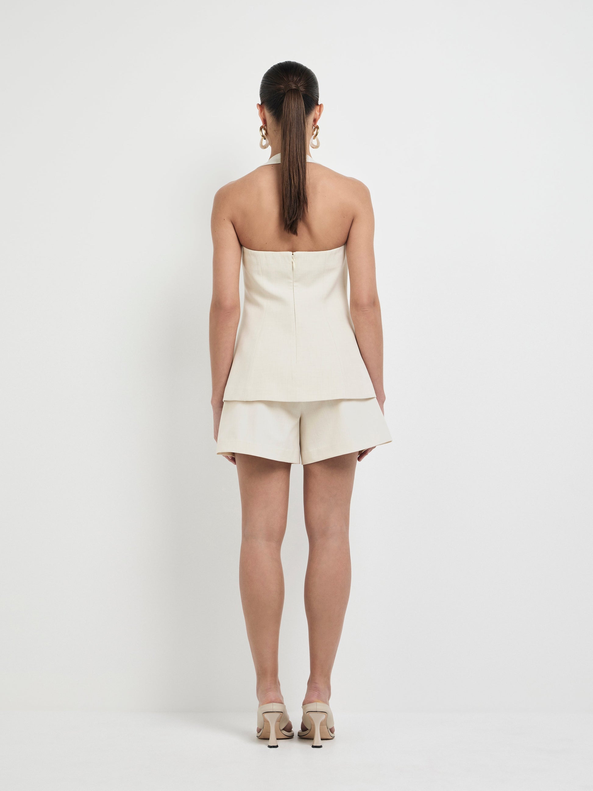 Statement style made effortless - Introducing the Carmen Top. Versatile and flattering, this stylish top with fixed straps, invisible zipper and brushed gold buttons offers both style and versatile. Style with the matching Carmen Short or Pant to complete the look.