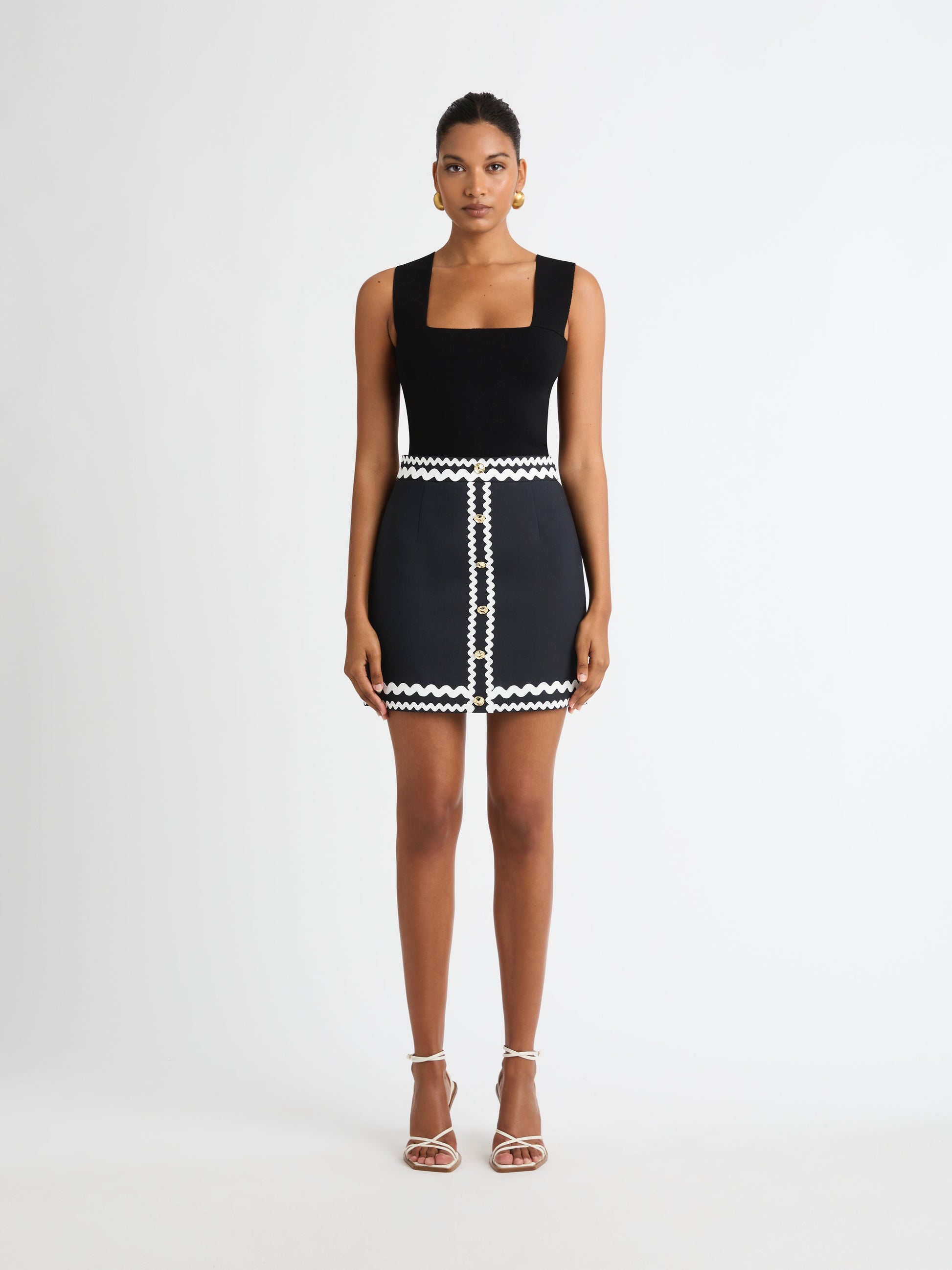 An effortless staple piece to refresh your collection - Introducing the Celine Mini Skirt, showcasing a woven bonded fabrication, slim fit with mock front buttons and contrast ricrac trim detail. Pair with our matching Celine Top to complete the look.