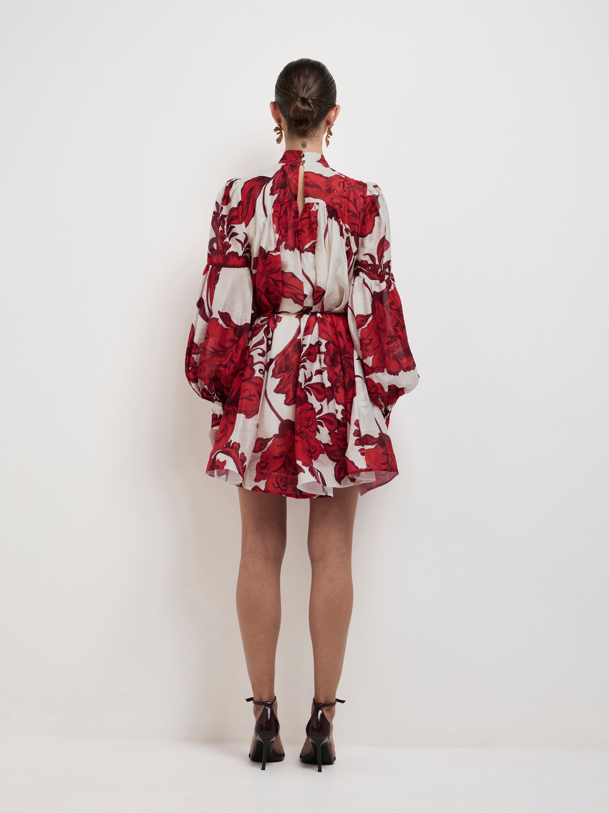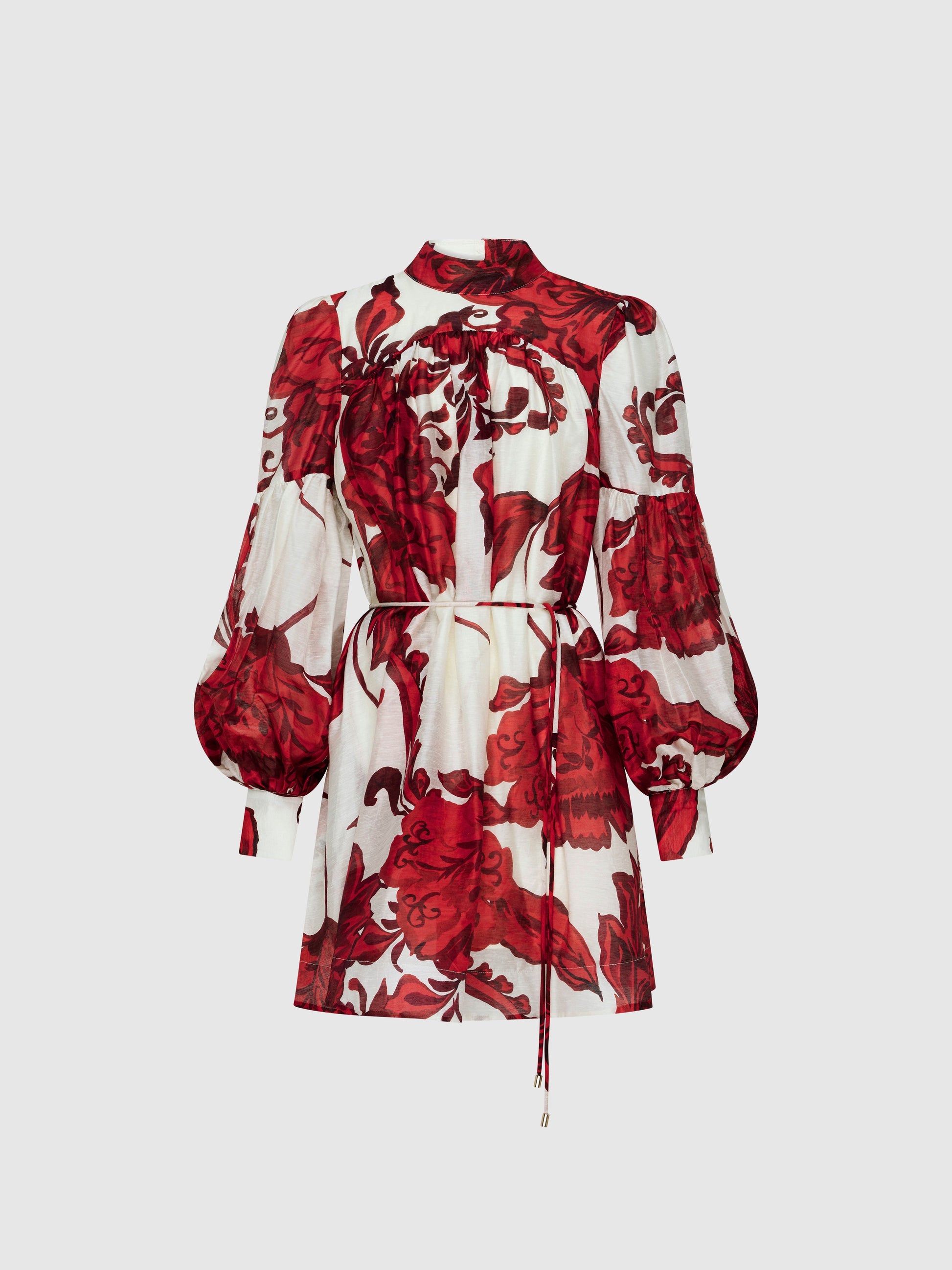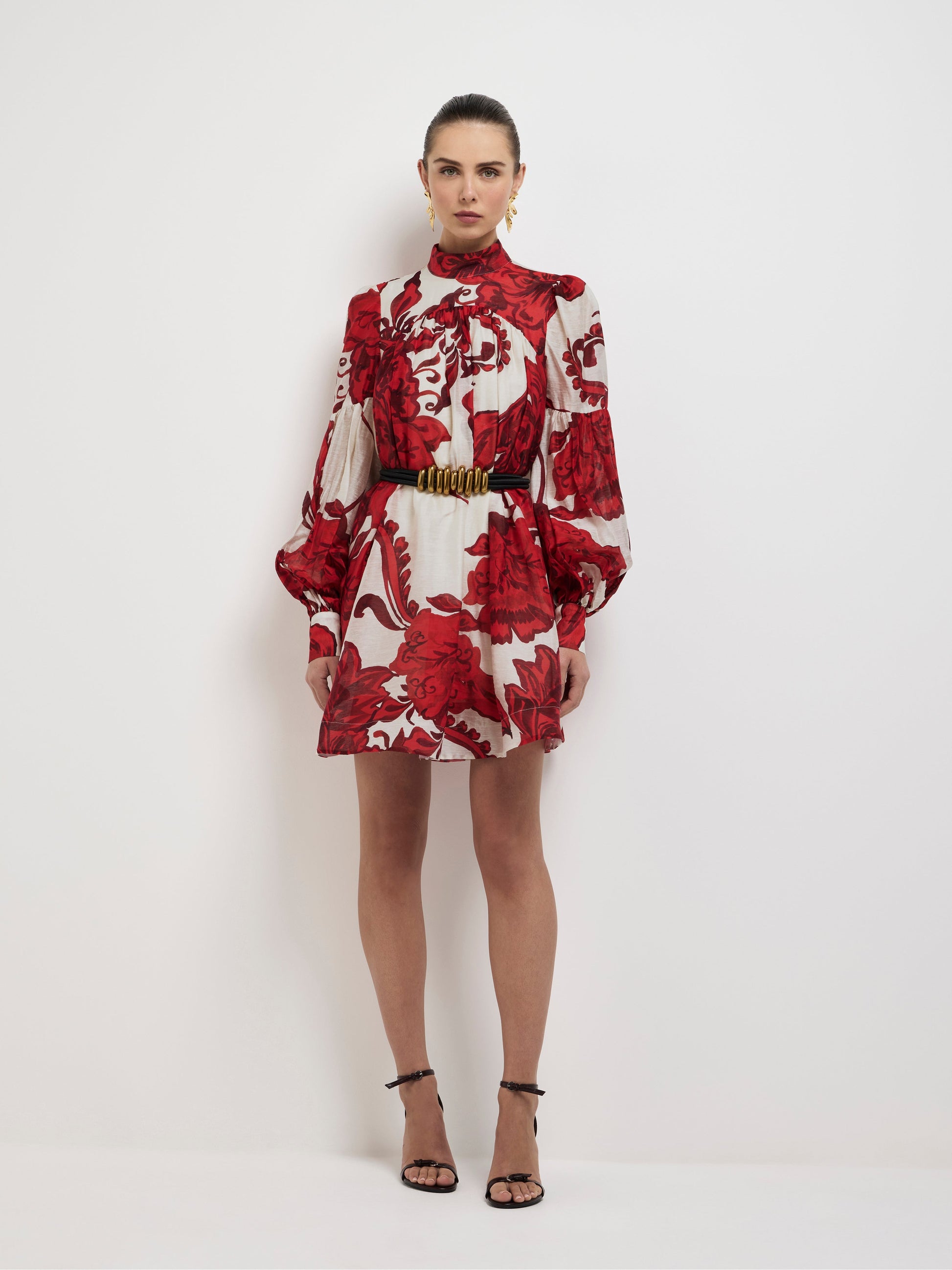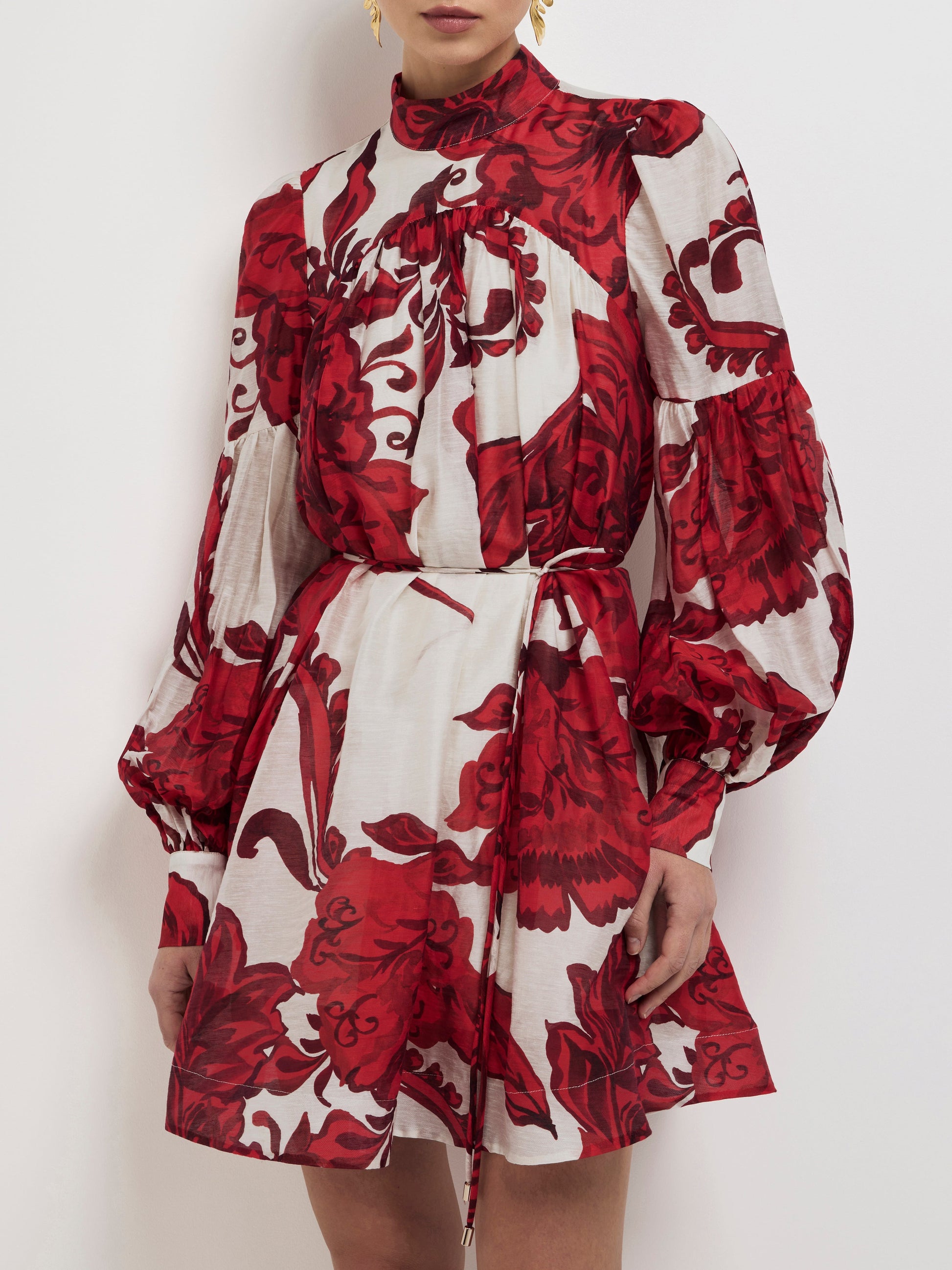 Romantic accents and booming florals make up the Chintz Mini dress. Showcasing a floral semi sheer fabrication with lining, long sleeves, front and back yoke, high neckline, pockets, rouleau waist tie and mini skirt length. Pair with our Phoenix Earrings to complete the look.
