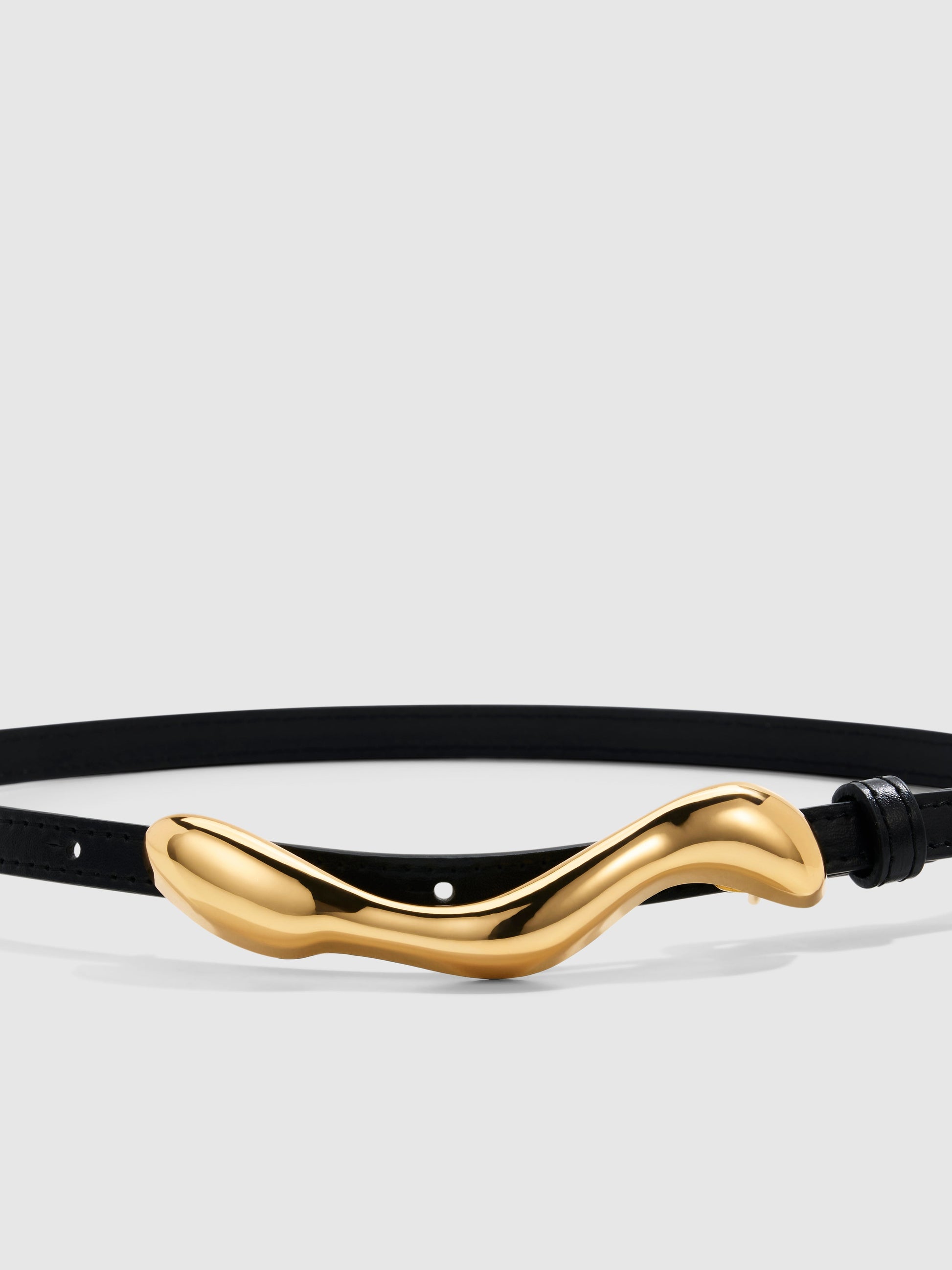 The Chloe Belt, your everyday belt, reimagined as a sculptural statement. Featuring a black thin band with a gold sculptural stud buckle closure.