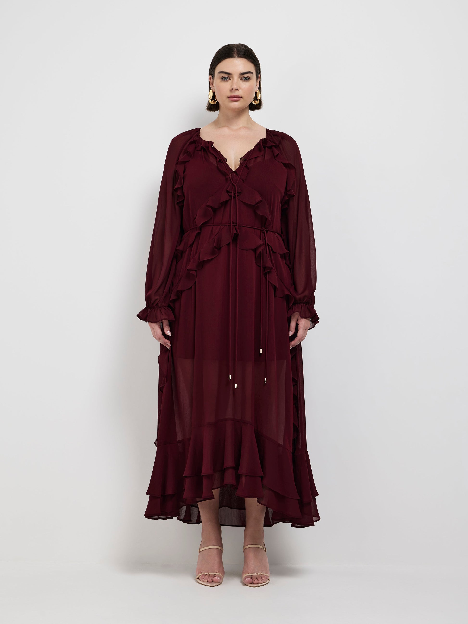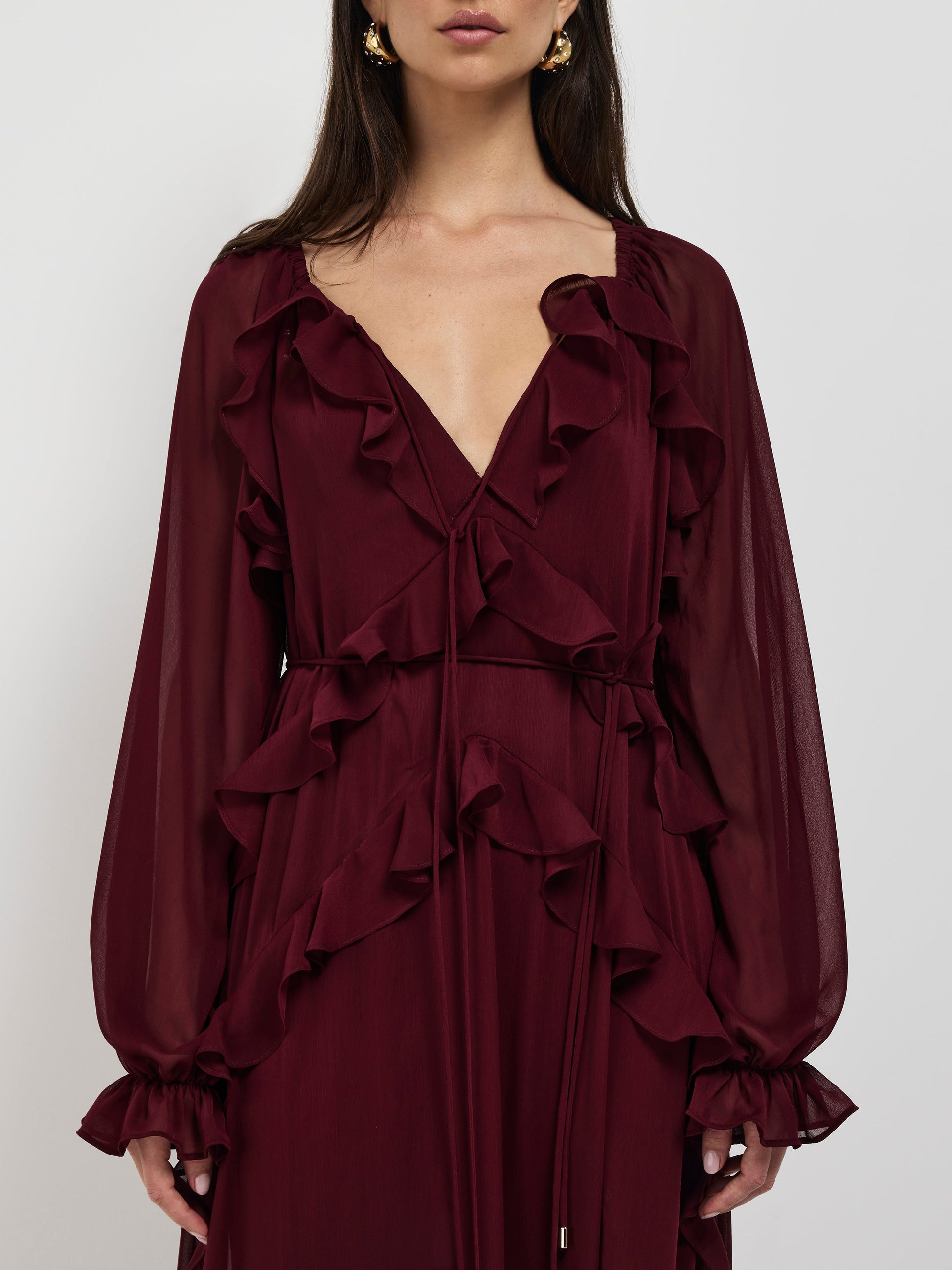 Celebrate femininity in the Clara Maxi Dress. Showcasing a burgundy sheer fabrication, frill detailing on front and back, low neckline with rouleau ties, rouleau tie belt, long sleeves and relaxed maxi length styling. Pair with our Anastasia Earrings to complete the look.