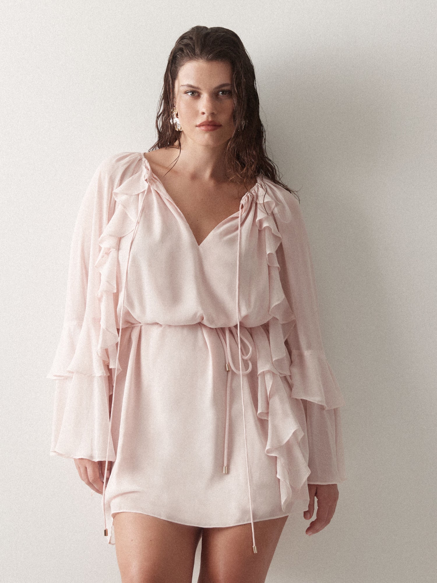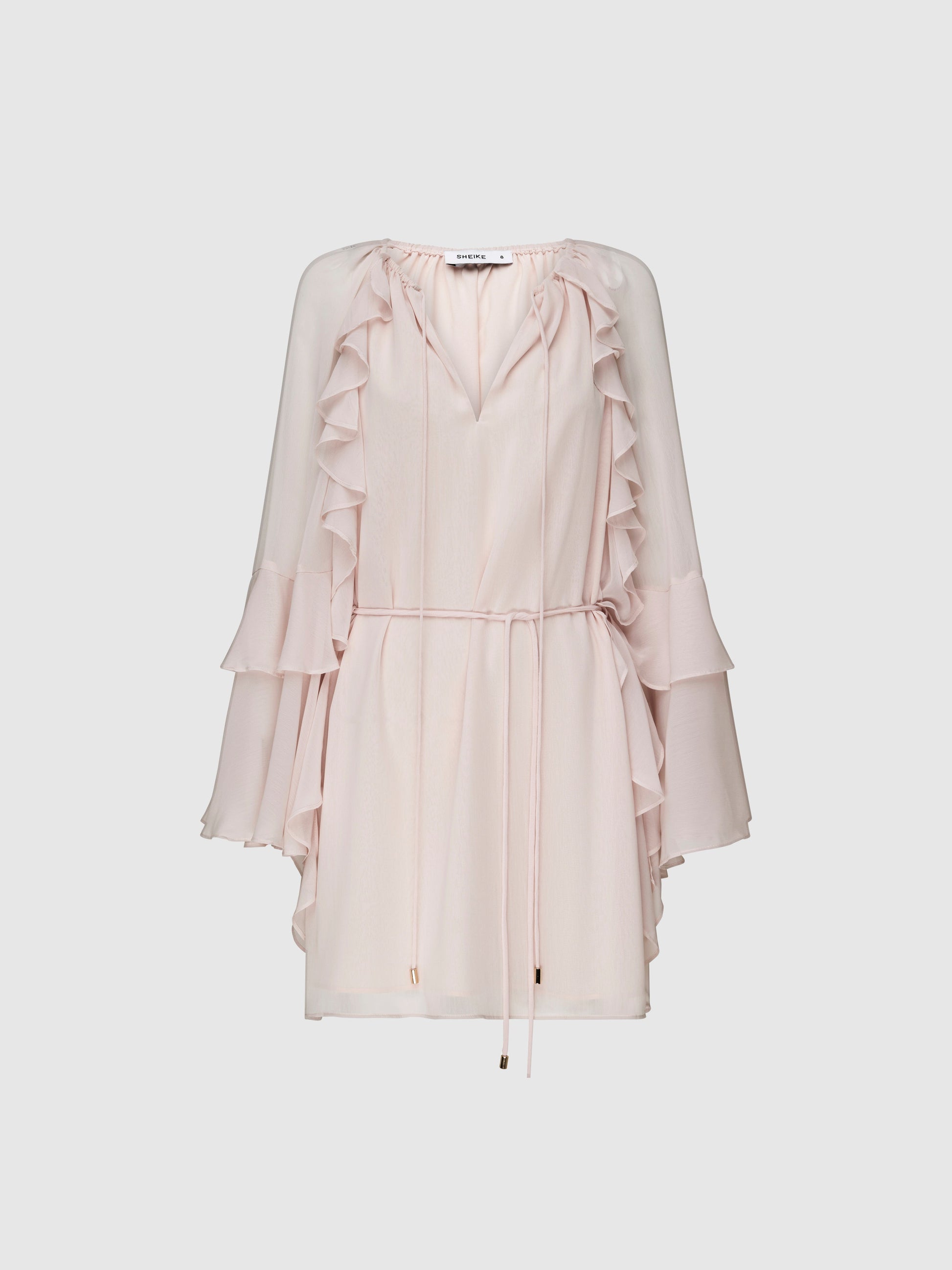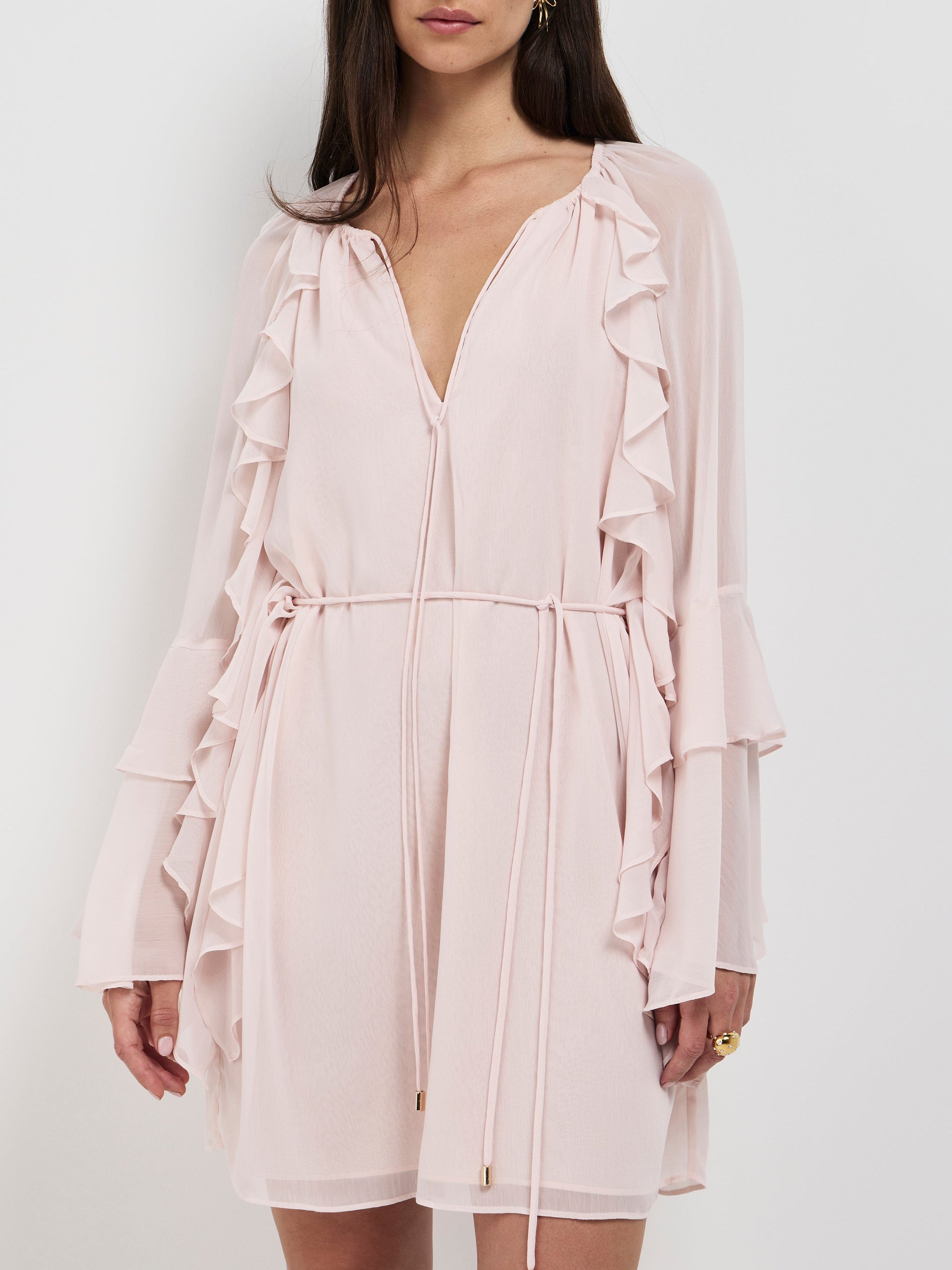 Celebrate femininity in the Clara Mini Dress. Showcasing a blush sheer fabrication, frill detailing on front and back, low neckline with rouleau ties, rouleau tie belt, long sleeves with flare frill hems and relaxed mini length styling. Pair with our Simmie Earrings to complete the look.