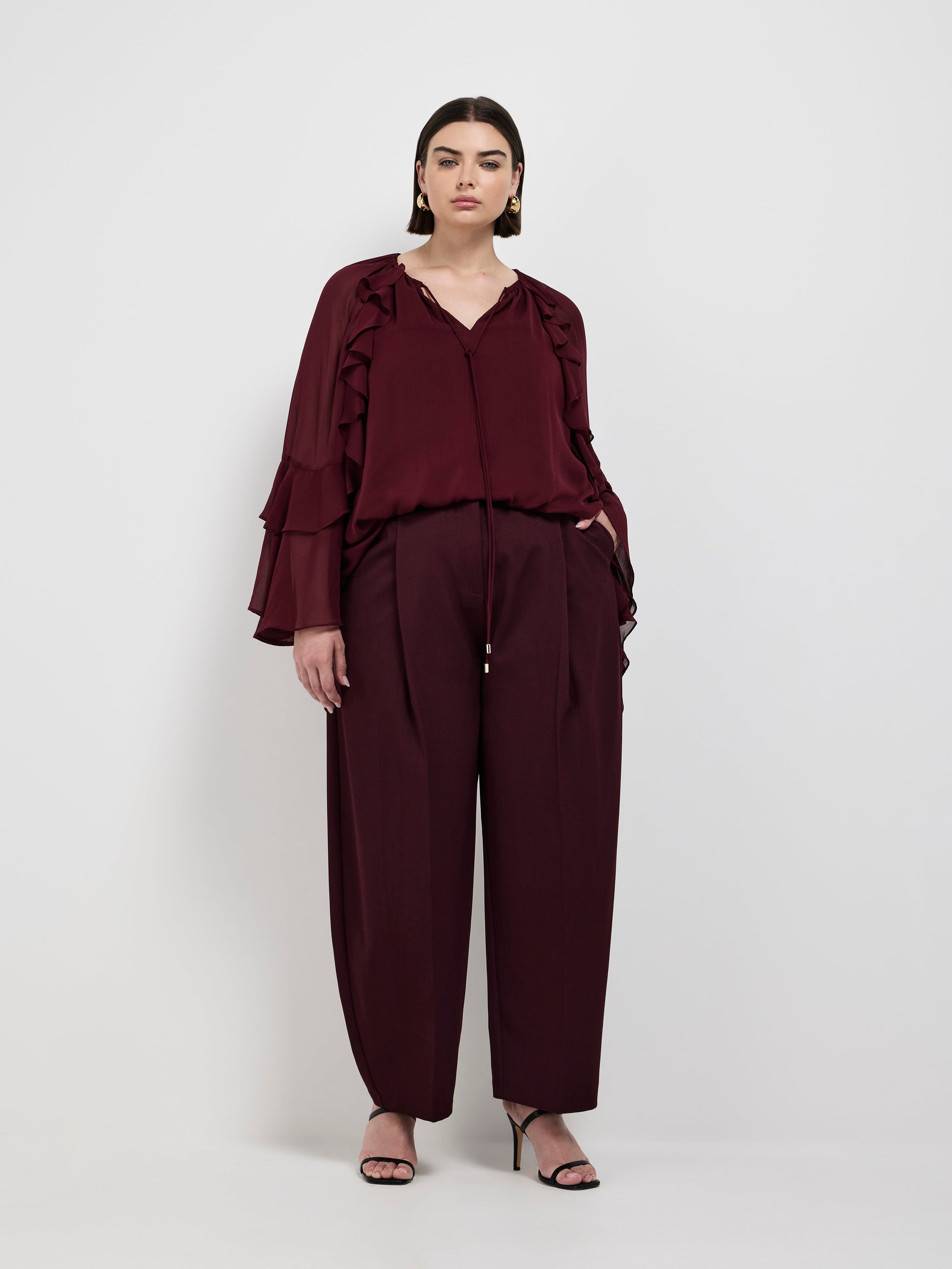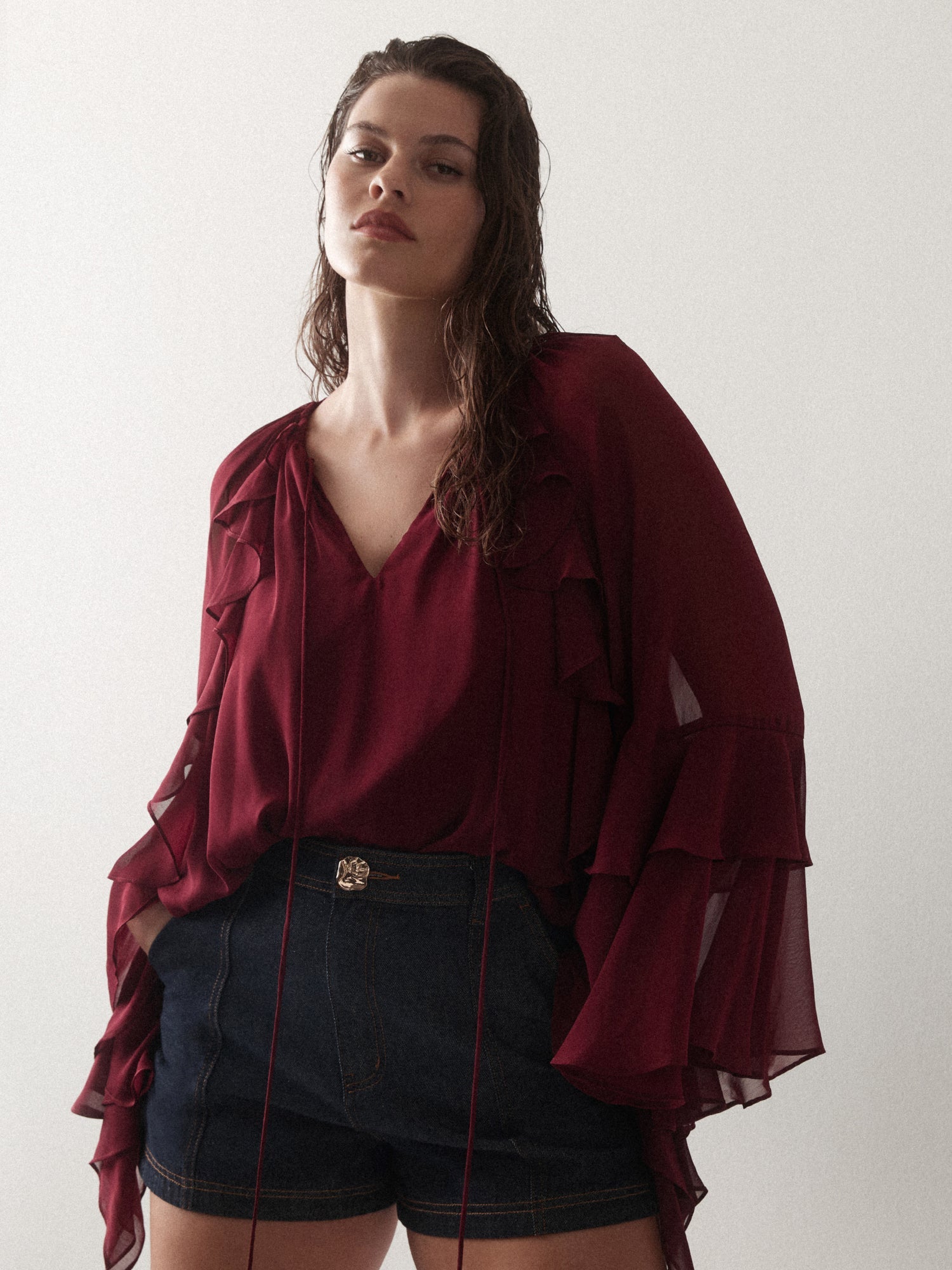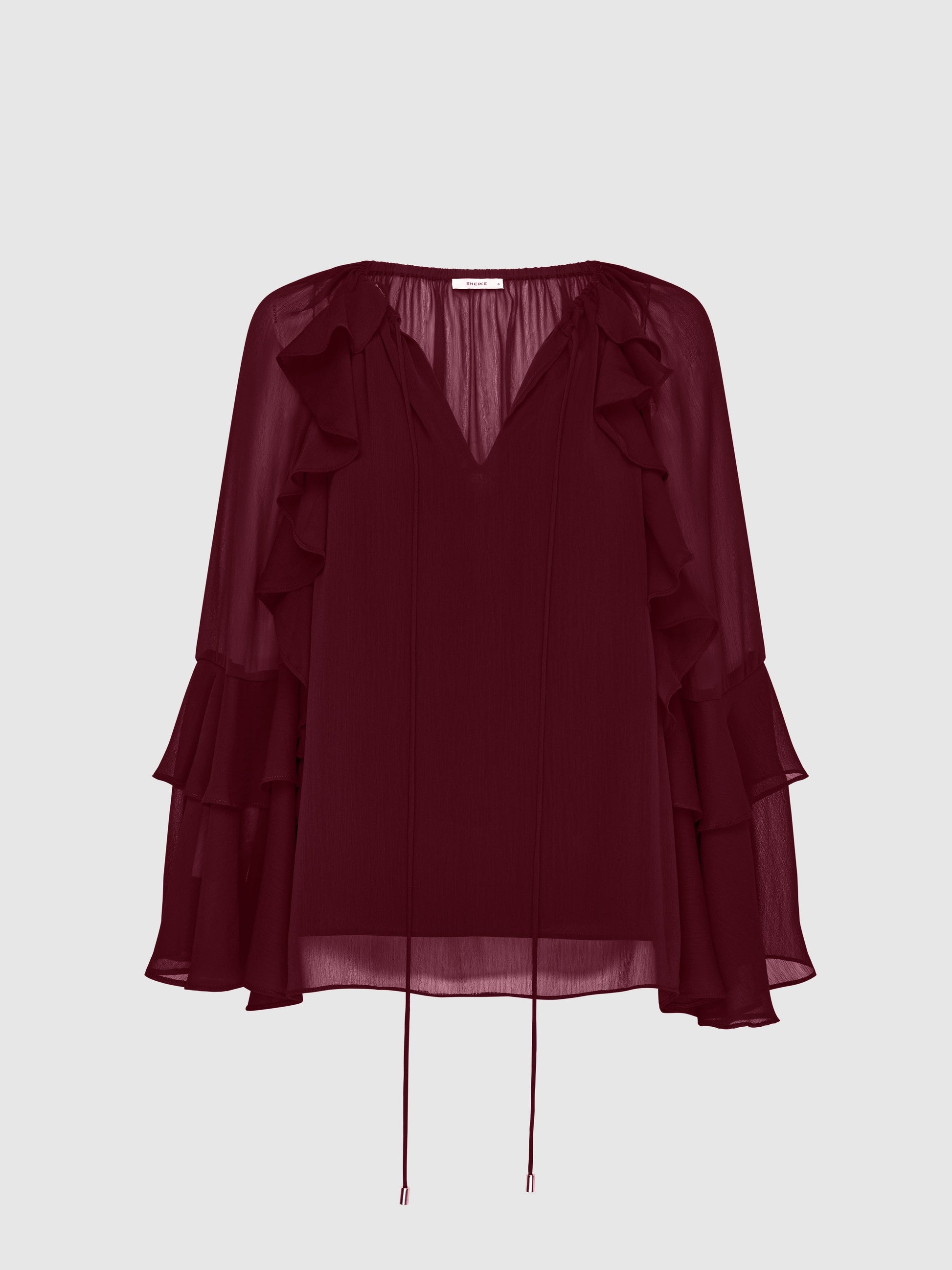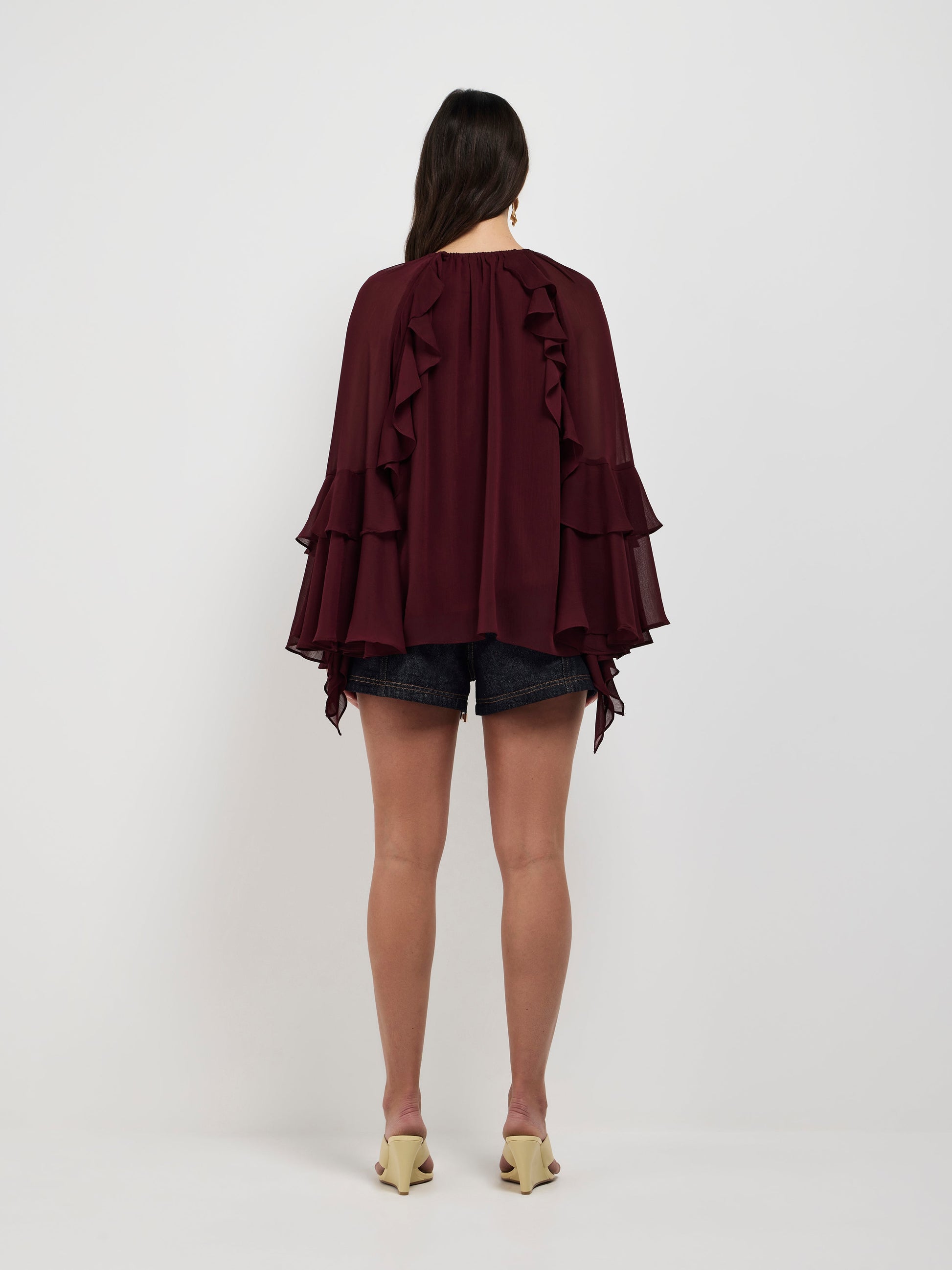 Celebrate femininity in the Clara Top. Showcasing a burgundy sheer fabrication, frill detailing on front and back, low neckline with rouleau ties, long sleeves and relaxed styling. Pair with our Amsterdam Shorts and Whimsy Earrings to complete the look.
