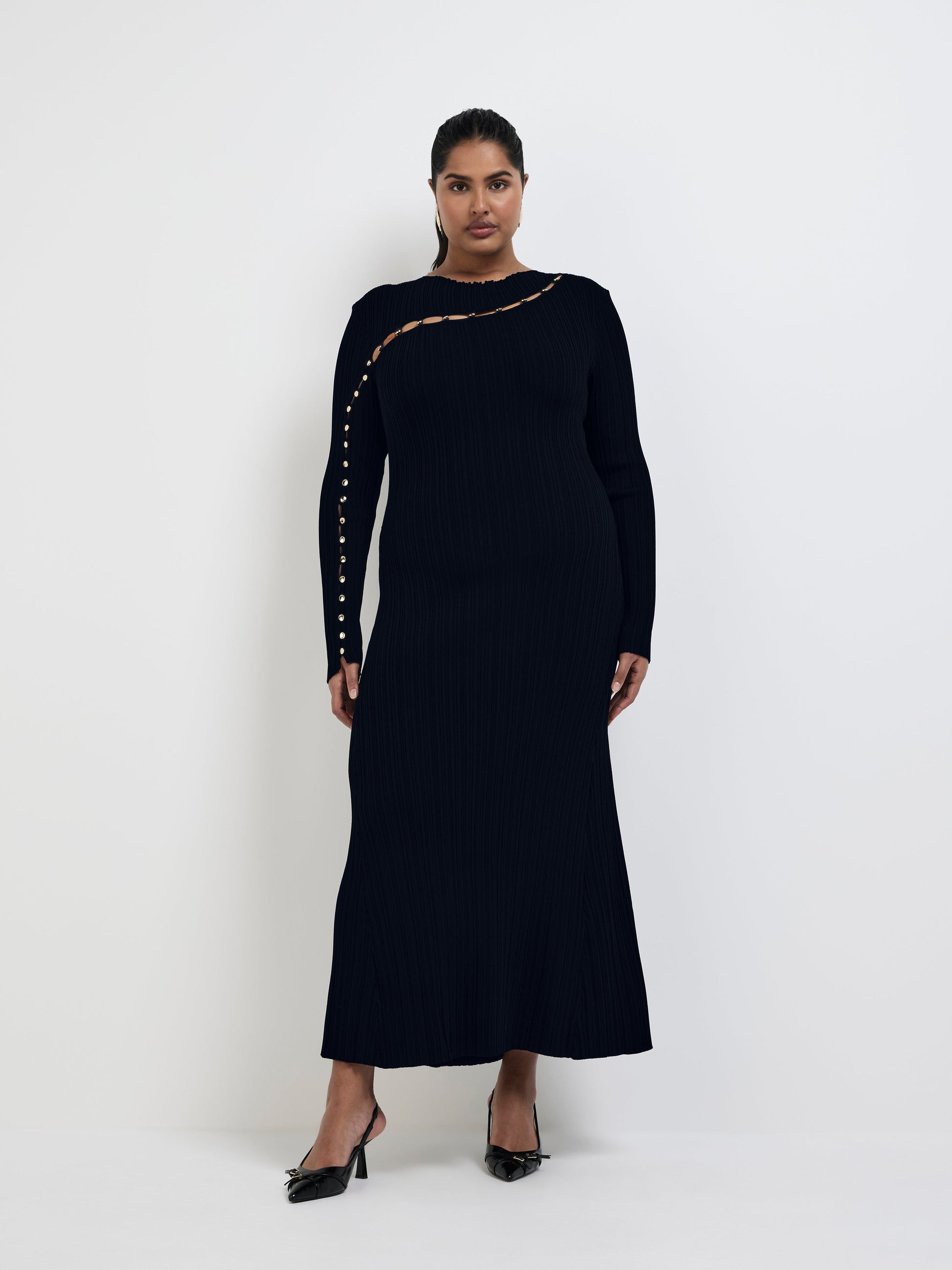 A knit worth noticing - Introducing the Claudette Midi Dress, showcasing a black ribbed knit fabrication, fitted cut, asymmetrical button and cut out detail, midi skirt and high cut neckline. Pair with our Hannah Earrings to complete the look.