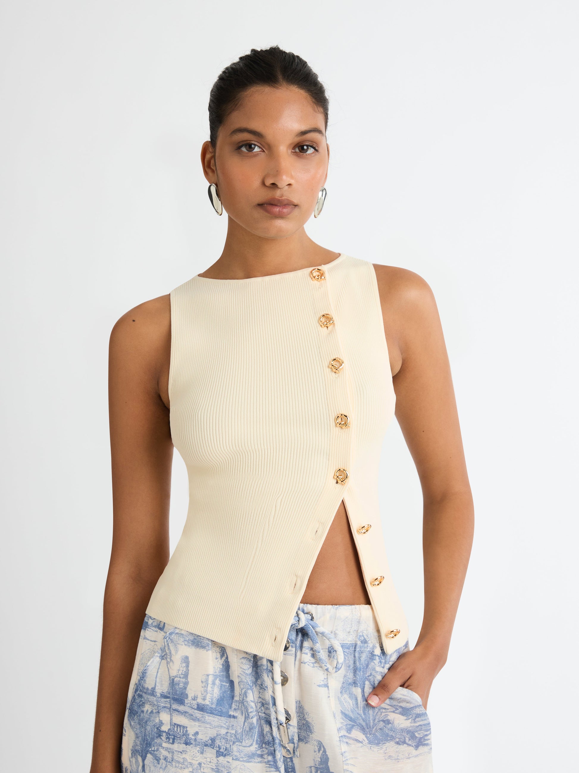 Neutral tones meet effortless styling - Introducing the Clement Knit Top, showcasing a ecru ribbed knit fabrication, fitted cut, off centre buttons and boat cut neckline. Pair with our Sanctuary Pant to complete the look.