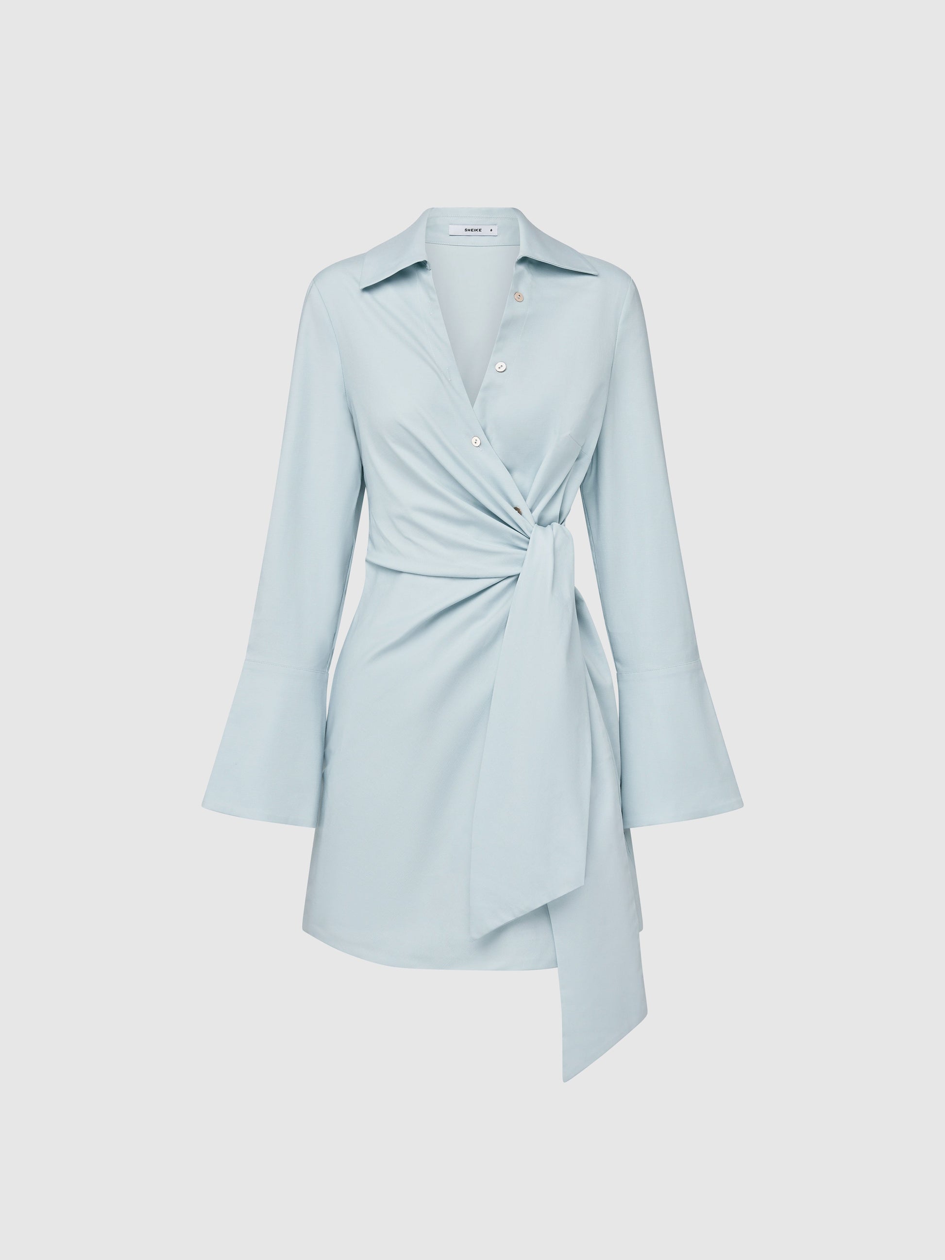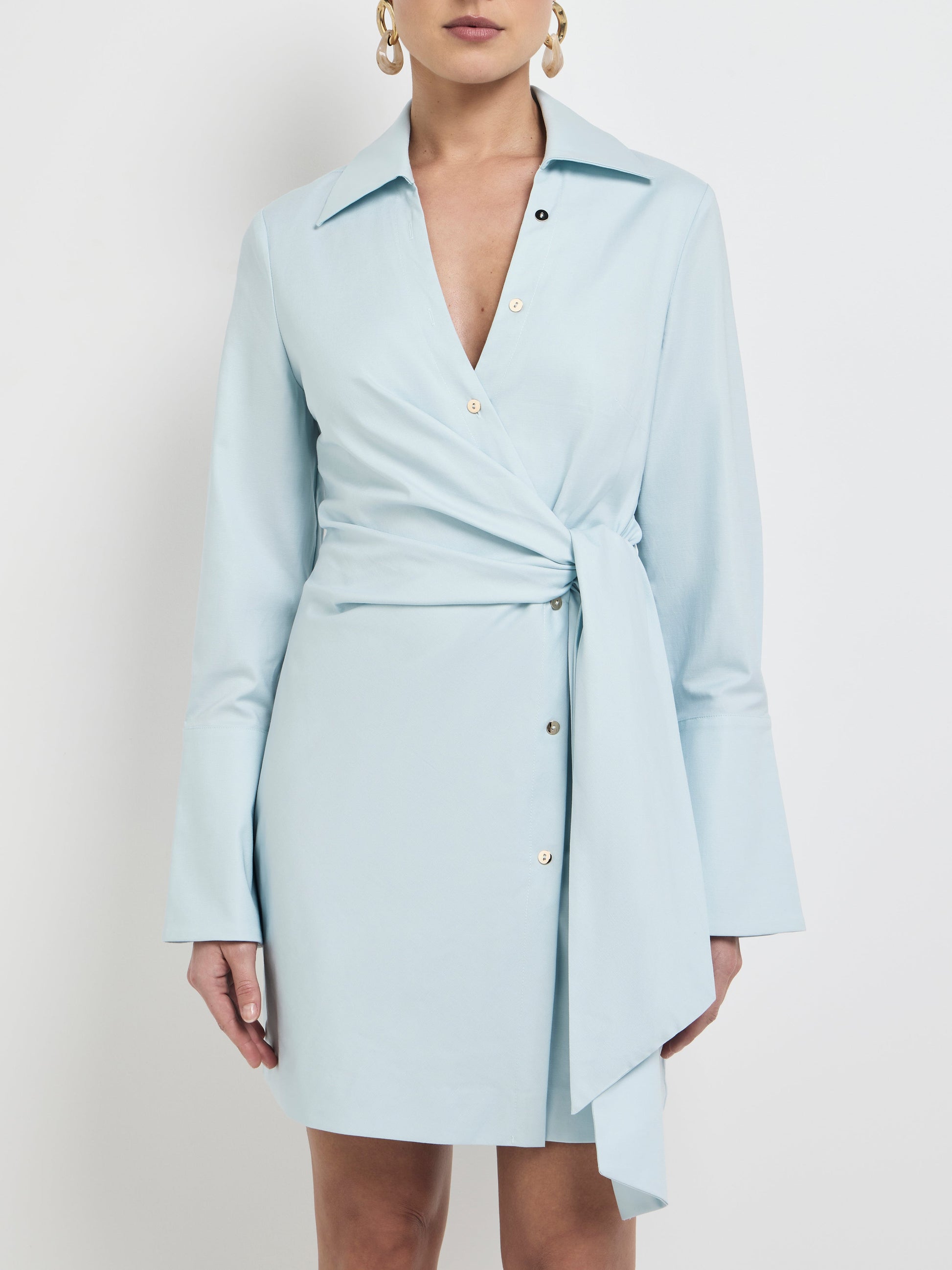 Elevate your look with classic and crisp styling. Introducing our Clementine Mini Dress - featuring a sky-blue stretch cotton blend fabrication, asymmetric button front, long sleeves with cuffs, V collar neckline, wrap front tie closure and mini skirt length. Pair back with our Monaco Earrings and Akira Sunglasses to complete your look.