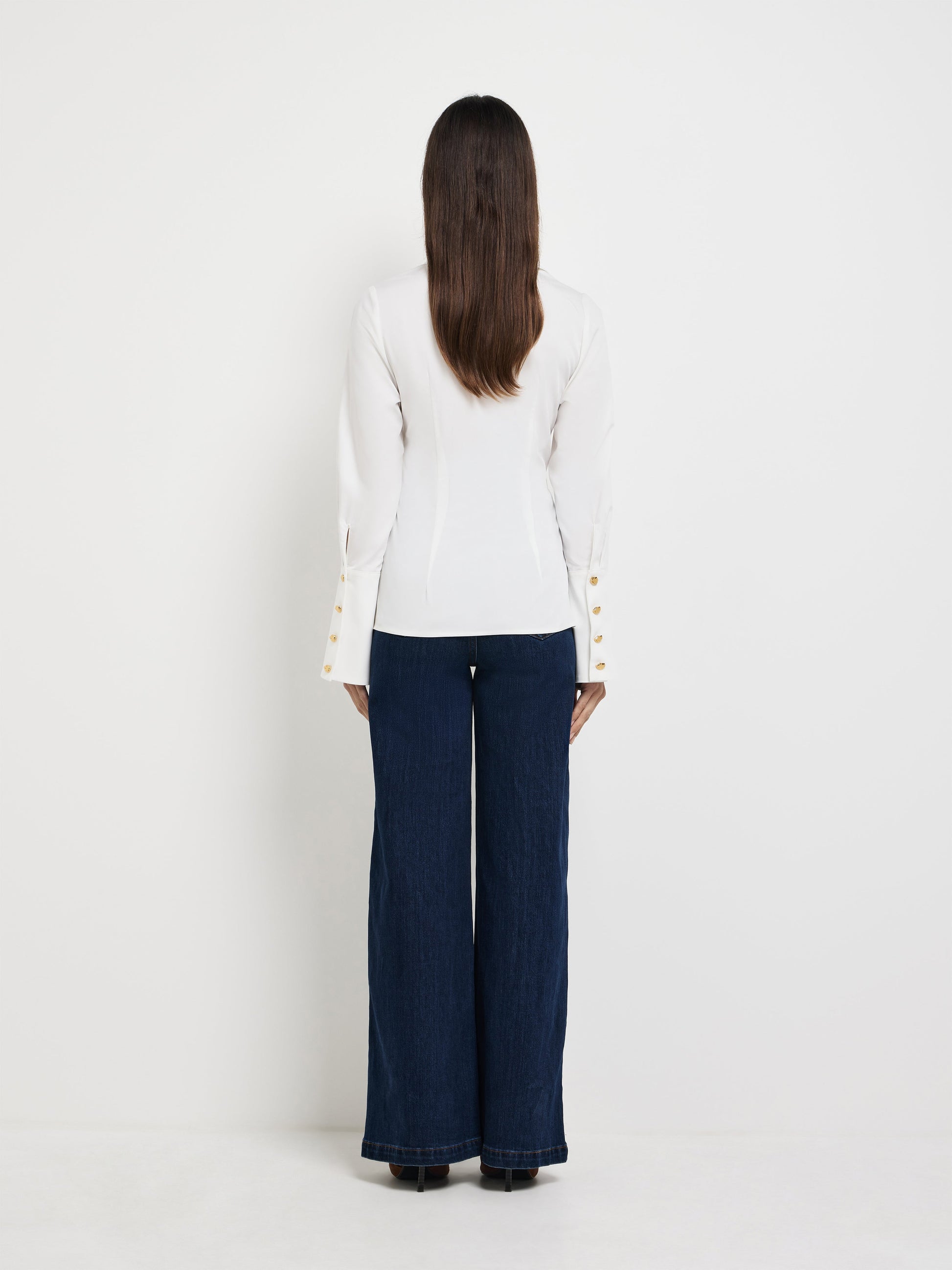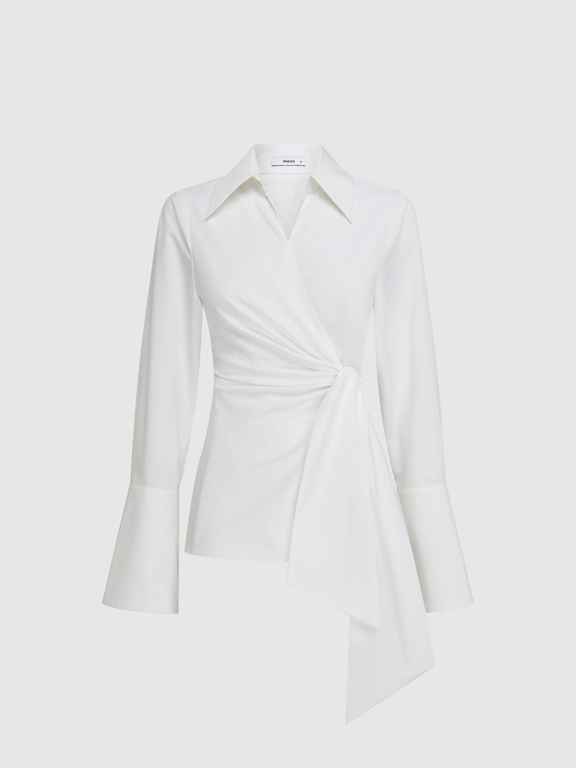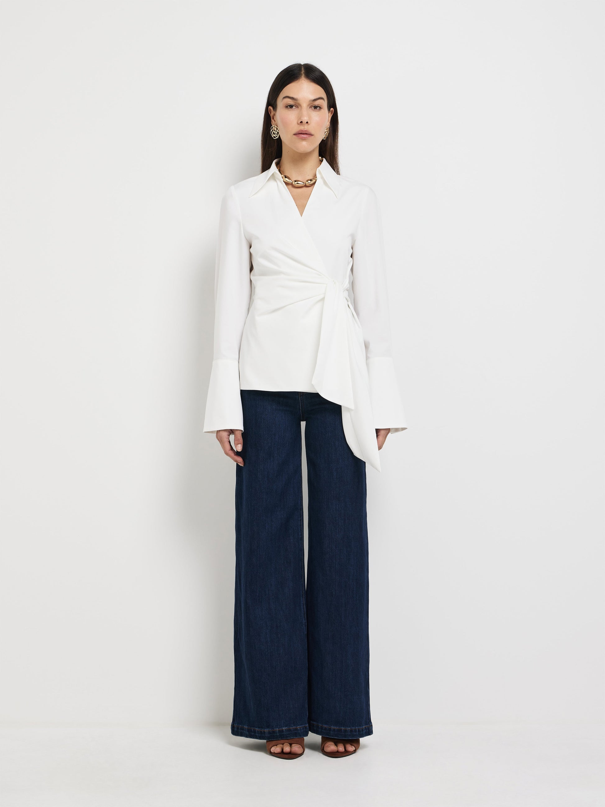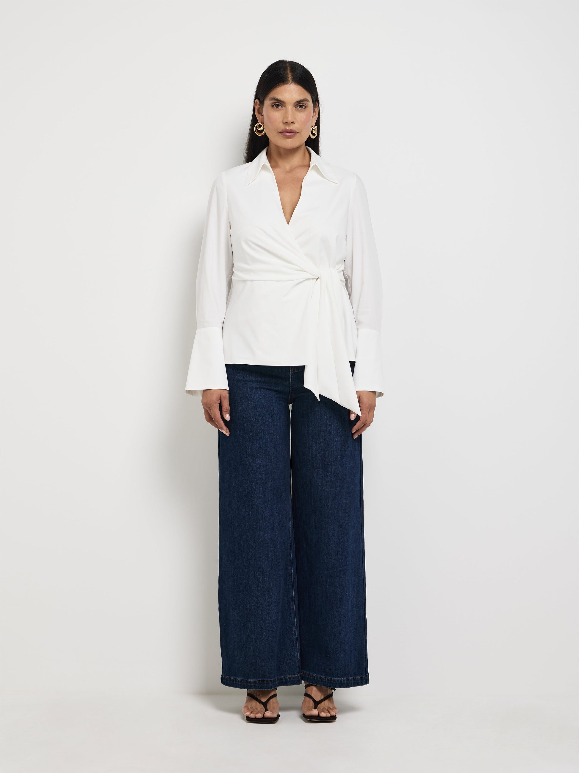 Introducing the Cleo Shirt - here to make a statement in a crisp white fabrication! Featuring a relaxed fit, woven fabrication, wrap style with tie, long sleeves with cuffs and collared V neckline. Pair back with our Botanica Jeans to complete the look.