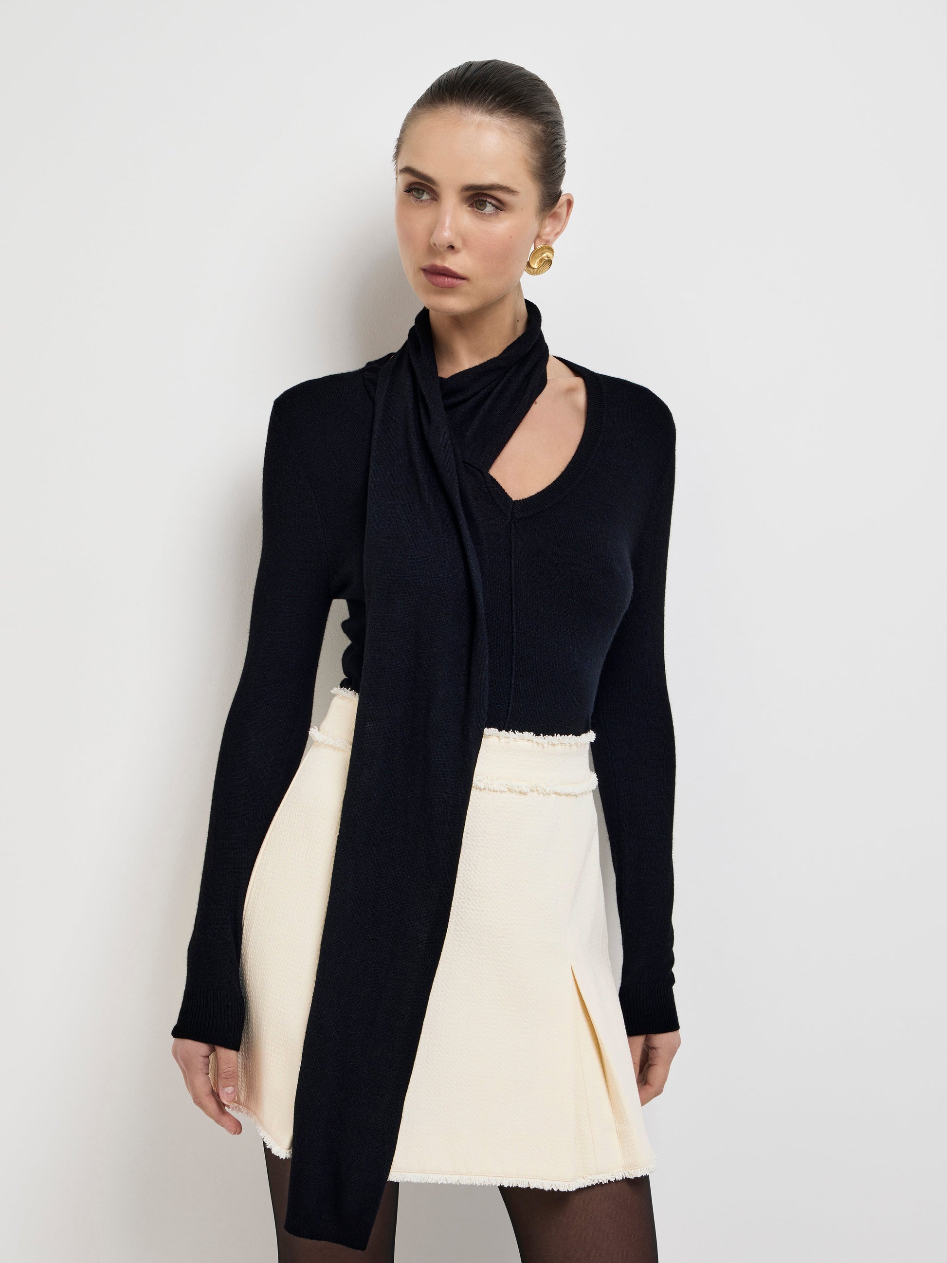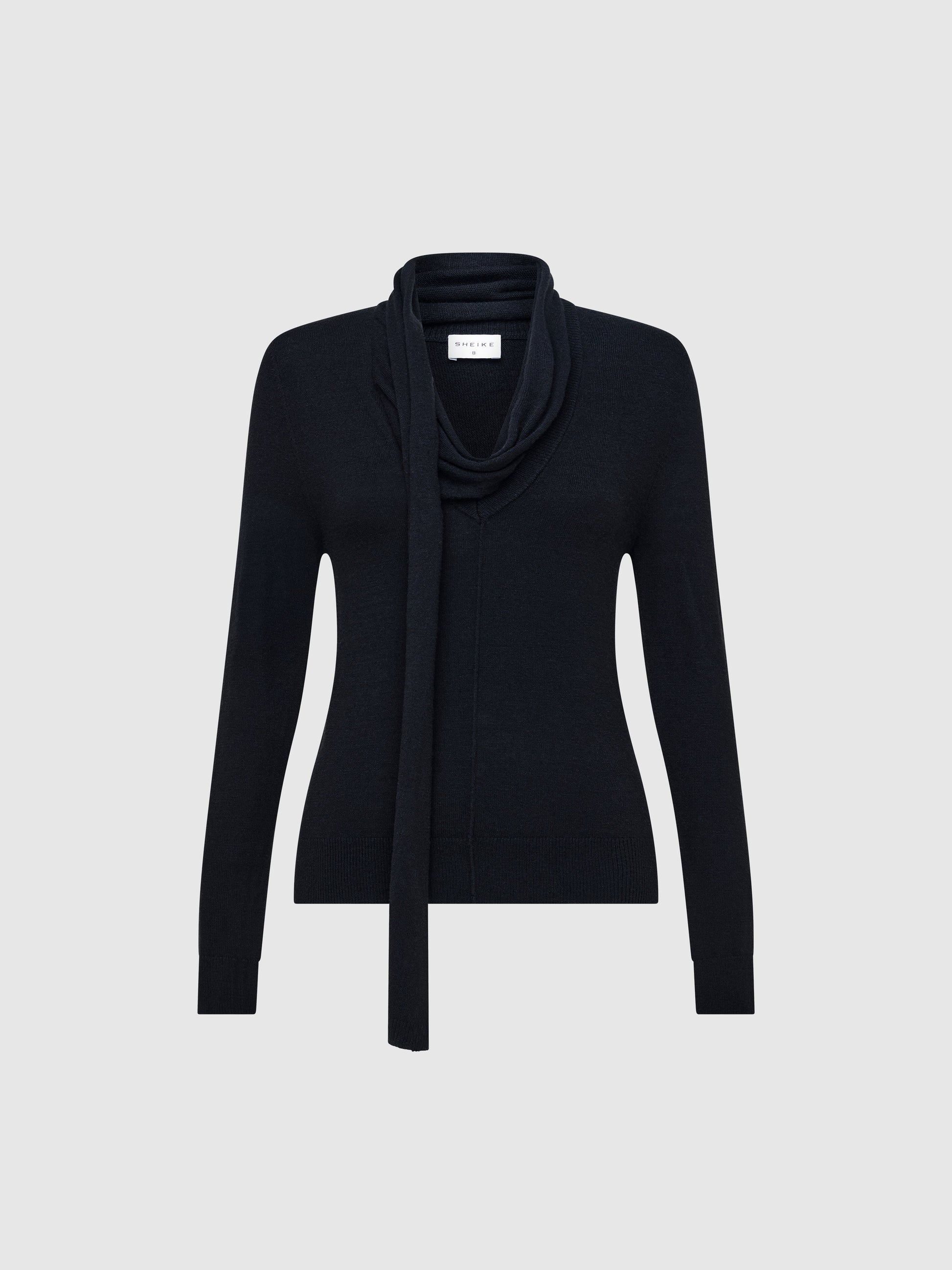 - Ribbed "V" front neckline with attached scarf detail