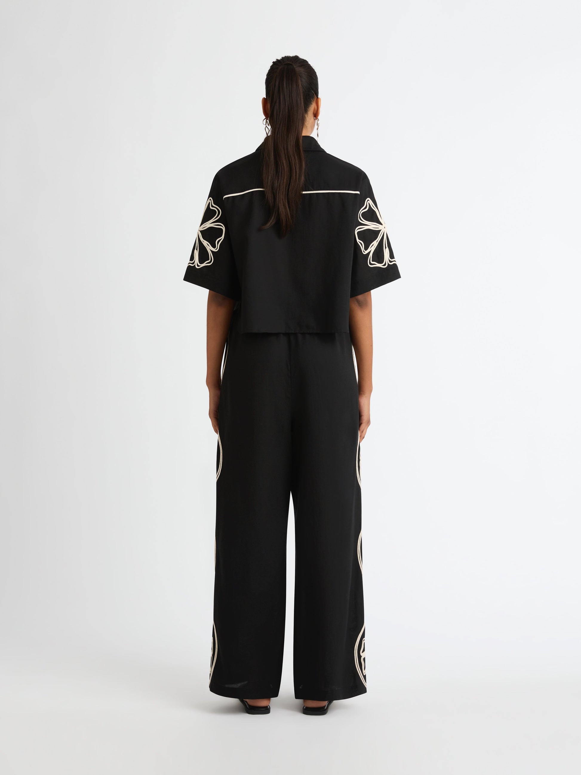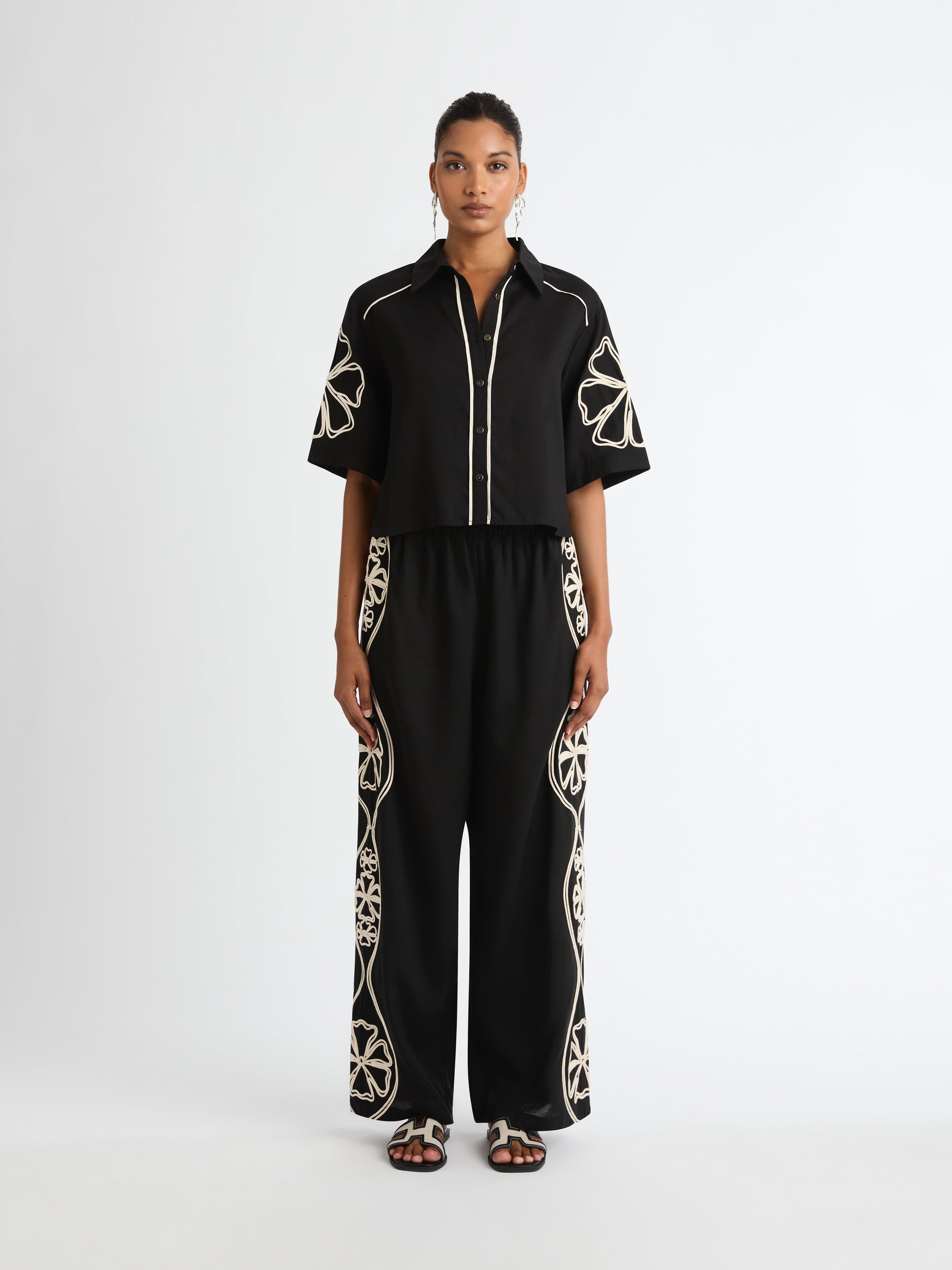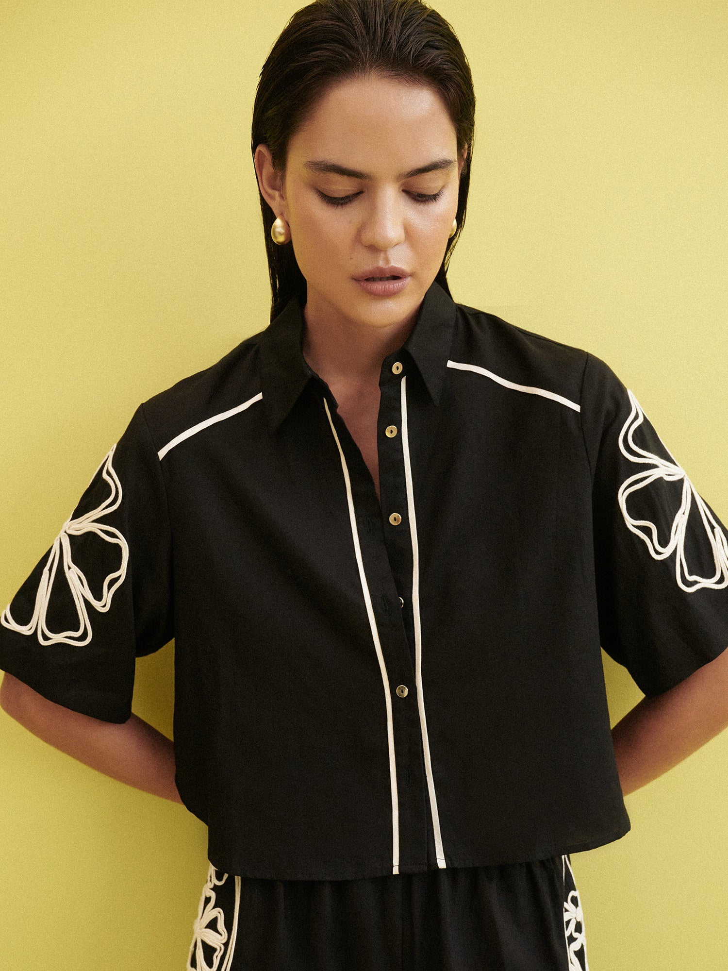 Feel the playfulness of the Daisy Shirt this season. Featuring a woven fabrication, relaxed fit, collar neckline, button up front, short sleeves, contrast trim detail and applique floral detail on front and sleeves. Pair with our matching Daisy Pant to complete the look.