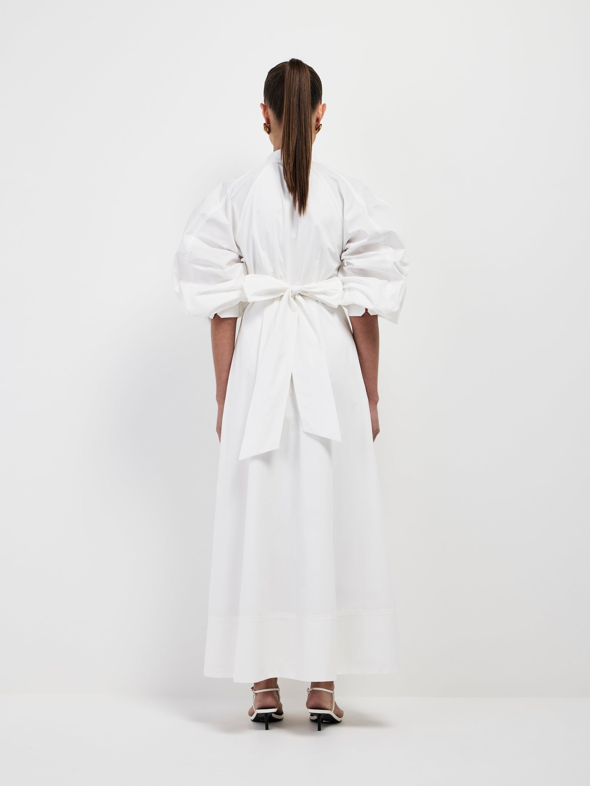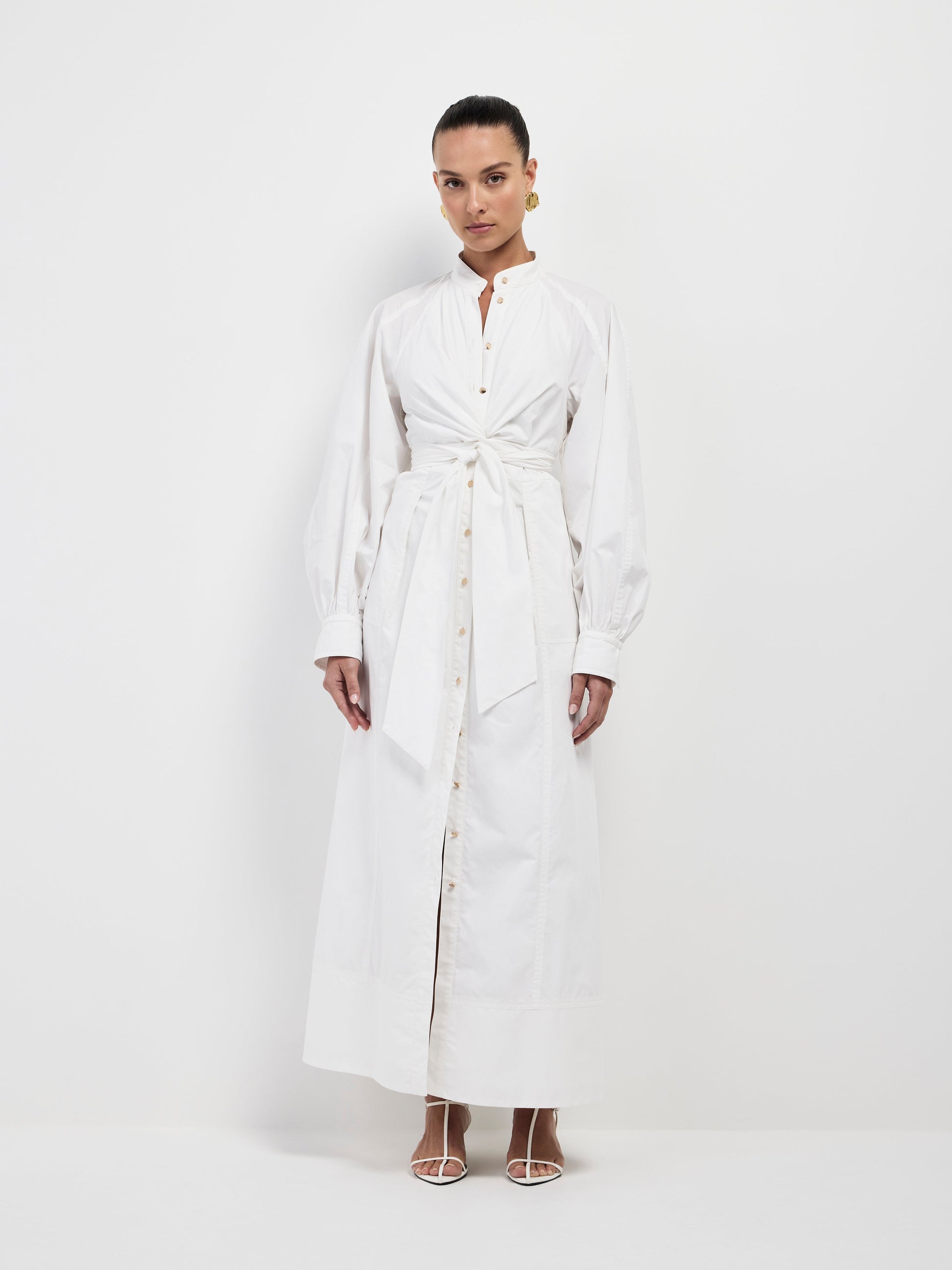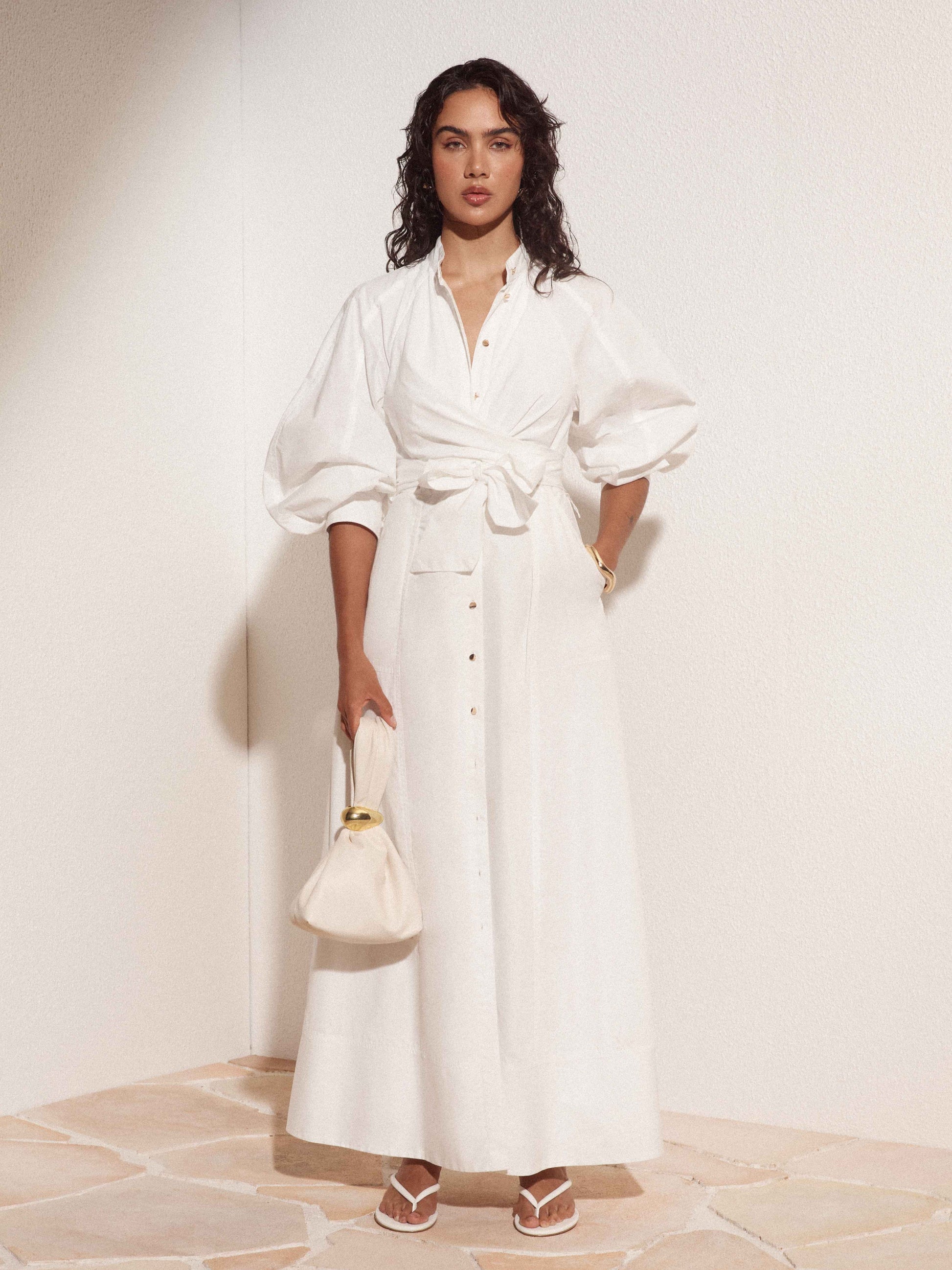 The idyllic white dress to introduce to your wardrobe this Summer - Introducing the Dana Maxi Dress. Featuring 100% cotton fabrication, raglan long sleeves, maxi length skirt, side seam pockets and front tie detail at waist. Pair with our Estella Bag and Sorrento Earrings to complete the look.