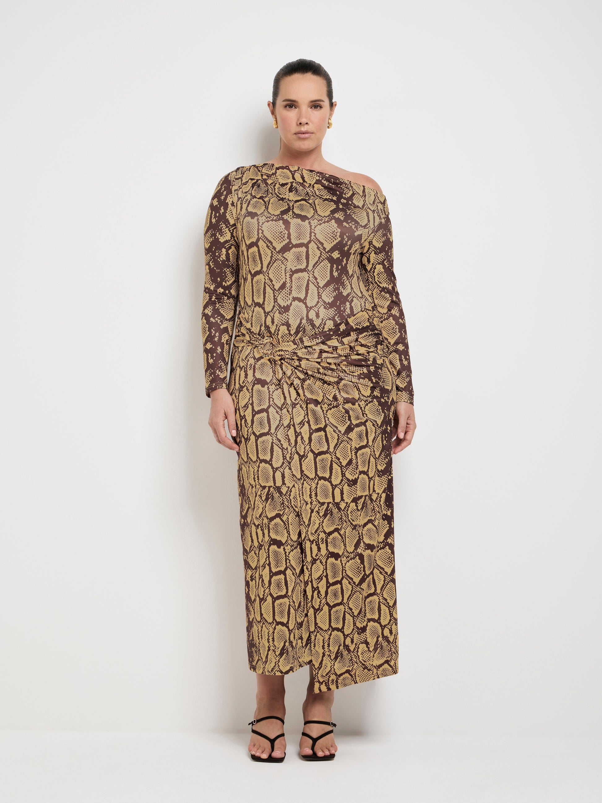 Channel unapologetic confidence in the Daphne Midi Dress. Showcasing a snake print fabrication, fitted cut, asymmetric off shoulder neckline, midi length skirt, long sleeves and wrap style skirt with gold buckle. Pair with our Knot Earrings to complete the look.