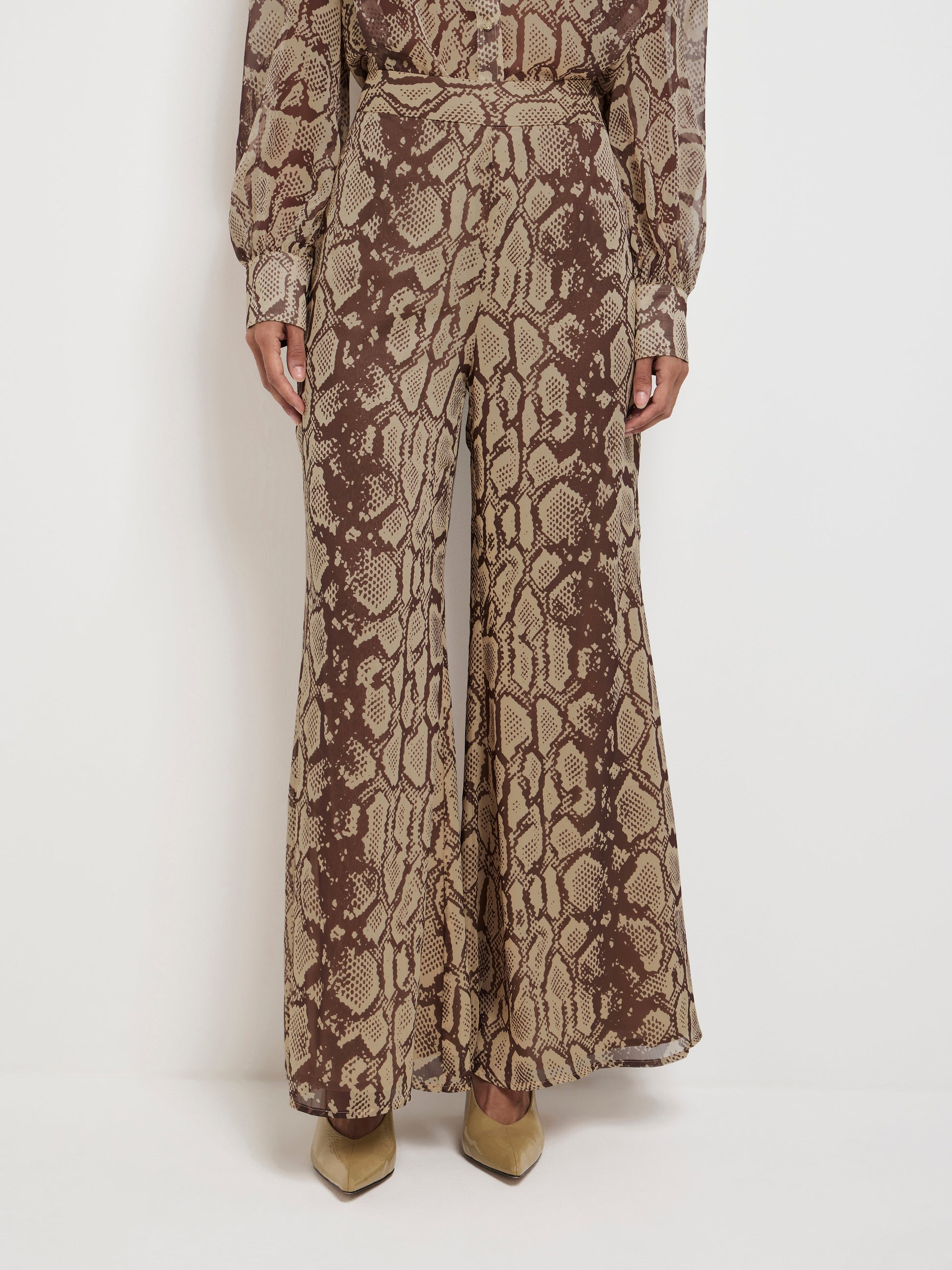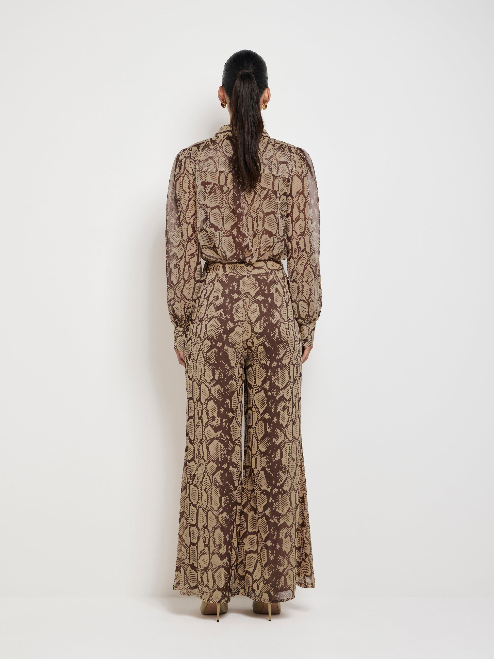 Channel unapologetic confidence in the Daphne Pant. Showcasing a snake print fabrication, relaxed cut with fixed waistband and flared style full length pant. Pair with our matching Daphne Shirt to complete the look.