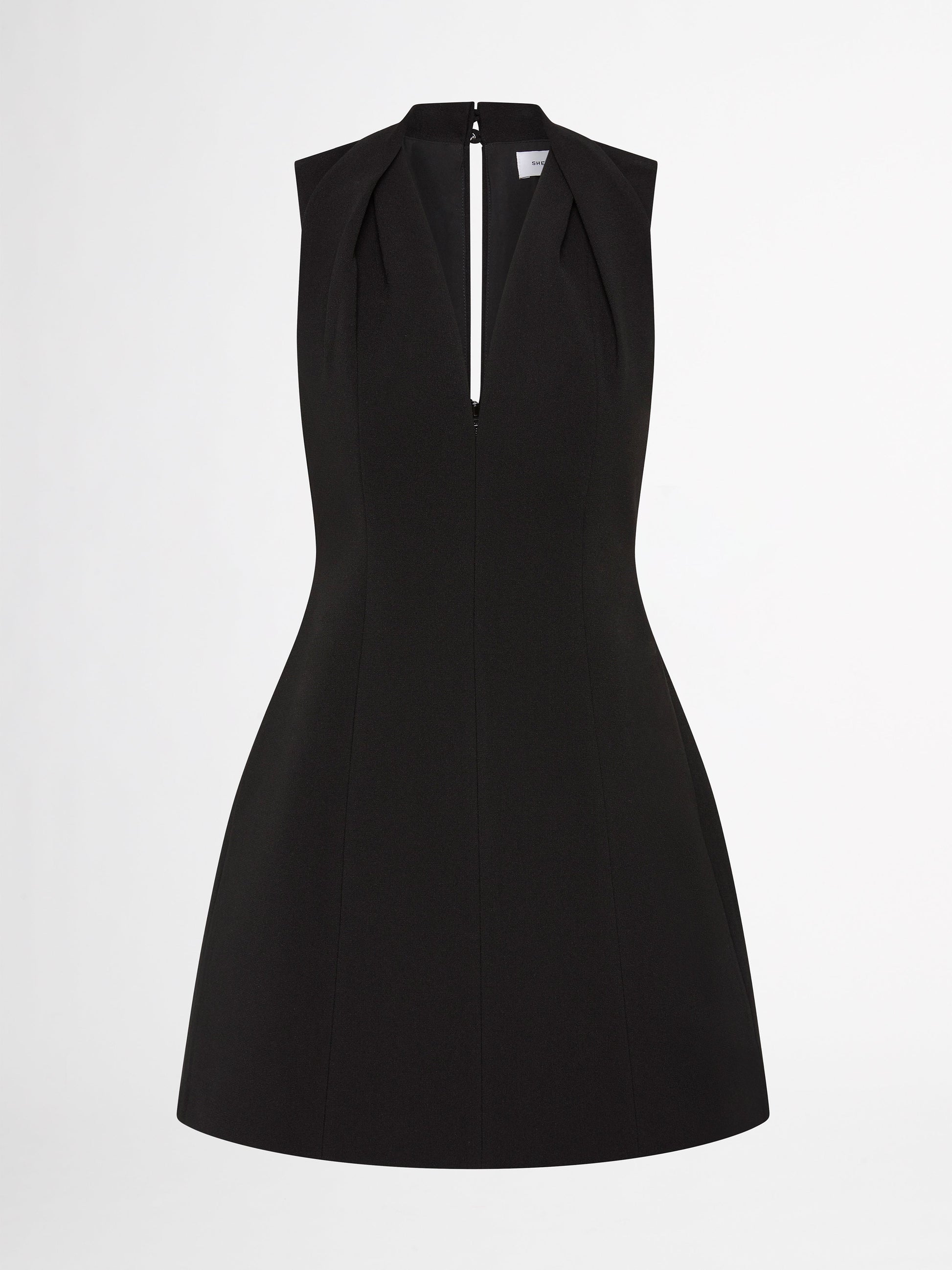 Instilled with elements of exaggerated silhouettes and structured shapes, the Darla Mini Dress is a power piece designed to stand the test of time. Showcasing a black bonded fabrication, fit and flare mini length styling, shawl collar V neckline, pockets and fitted waist with slight bubble hem, this black mini is a celebration of confidence. Pair with our Camelia Earrings to complete your look!