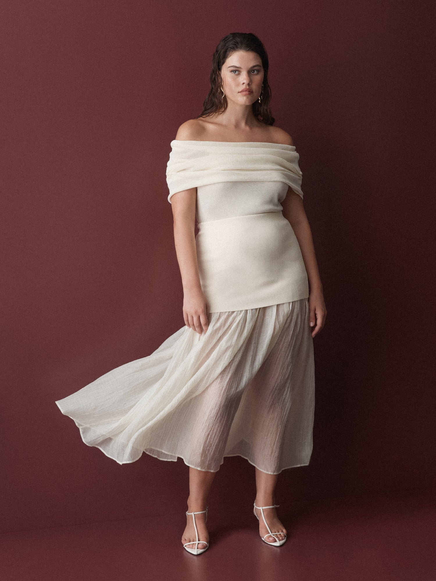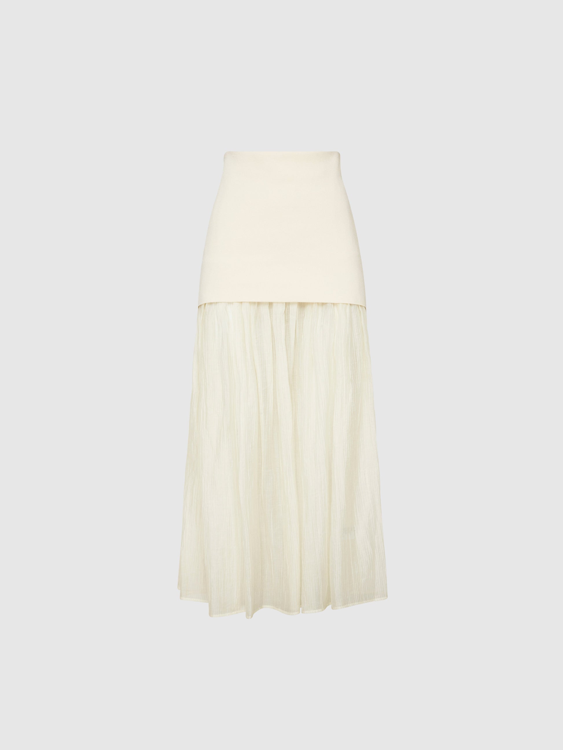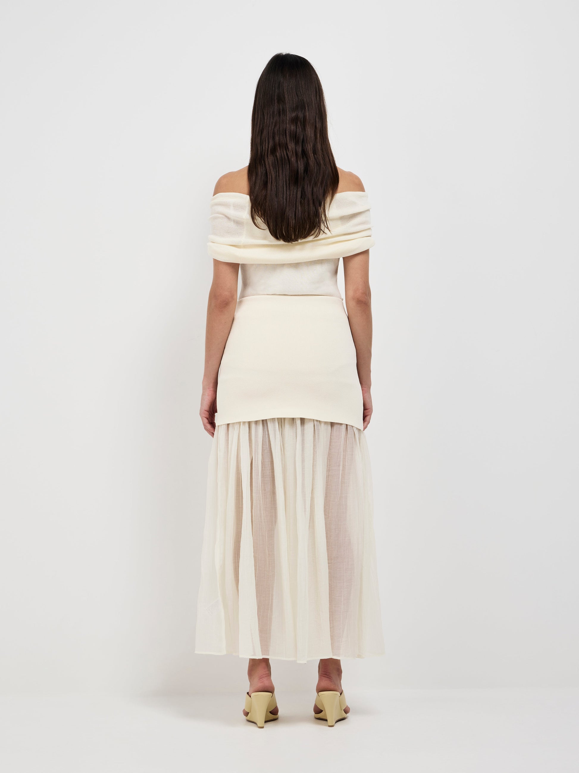 Own the moment in the Desiree Knit Skirt - featuring a ecru toned knit fabrication mini skirt with sheer pleated underskirt, midi length styling and elasticated waistband. Pair back with our Desiree Knit Top to complete the look.
