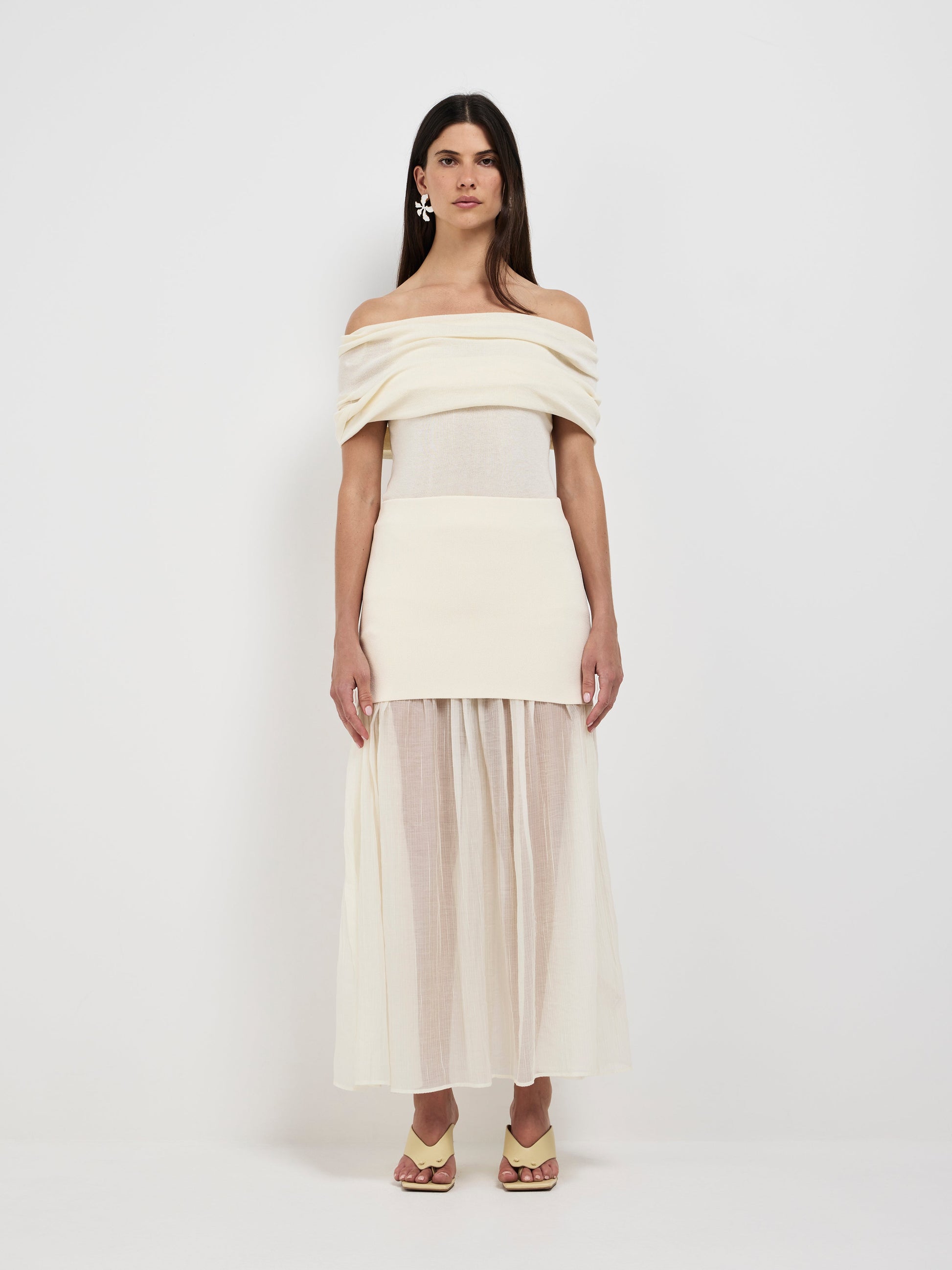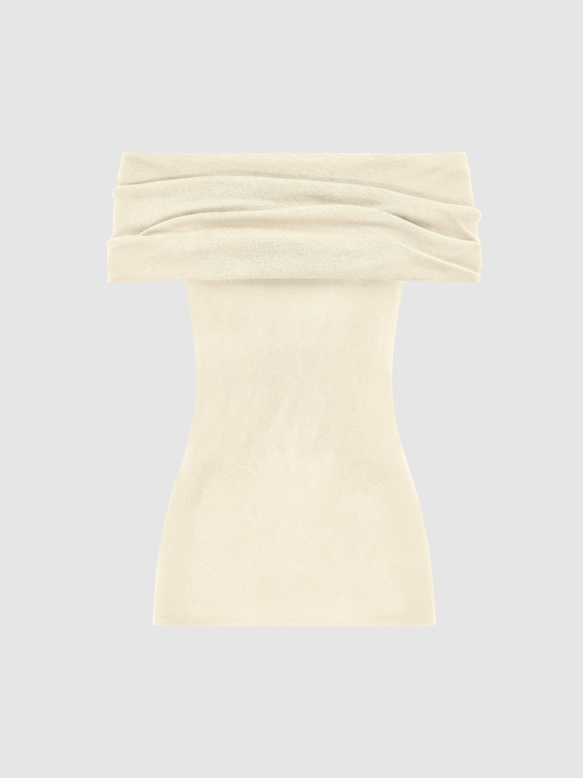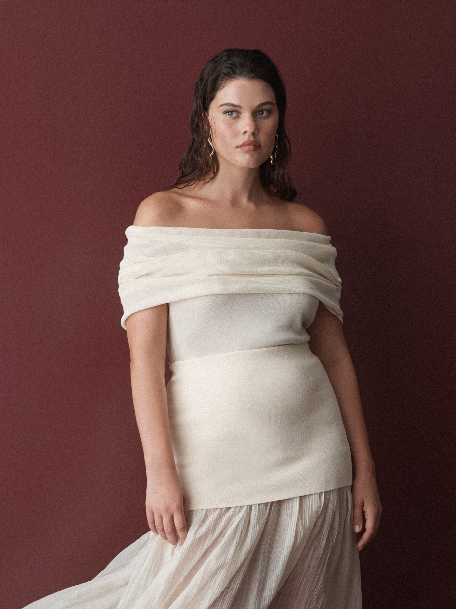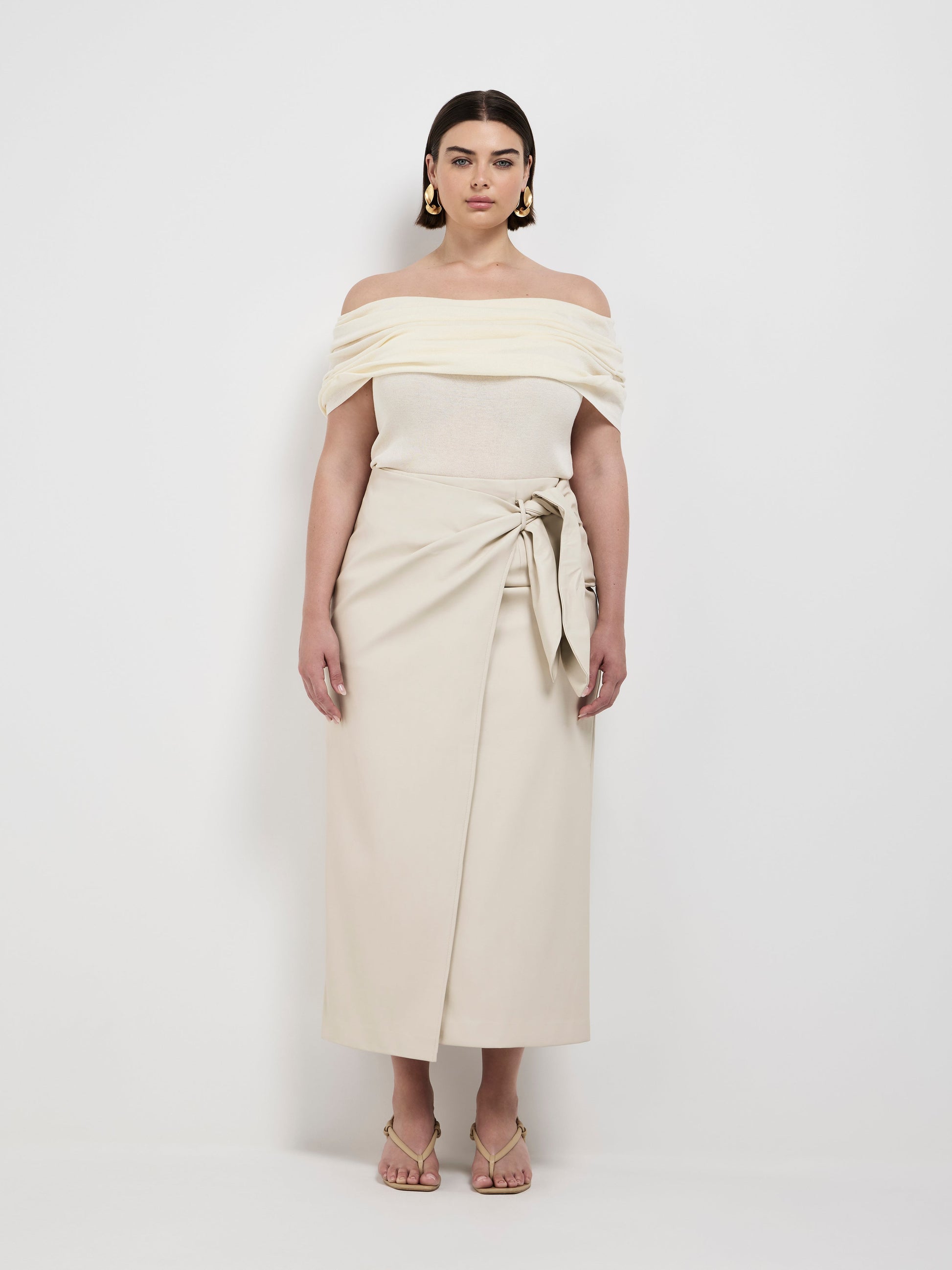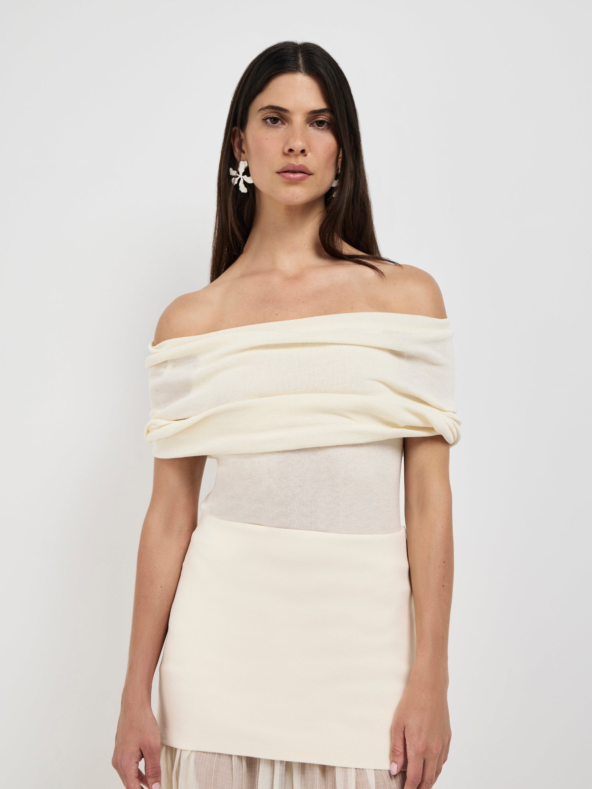 Own the moment in the Desiree Knit Top - featuring off the shoulder neckline, an ecru toned true knit fabrication and fitted styling. Pair back with our Desiree Knit Skirt to complete the look.
