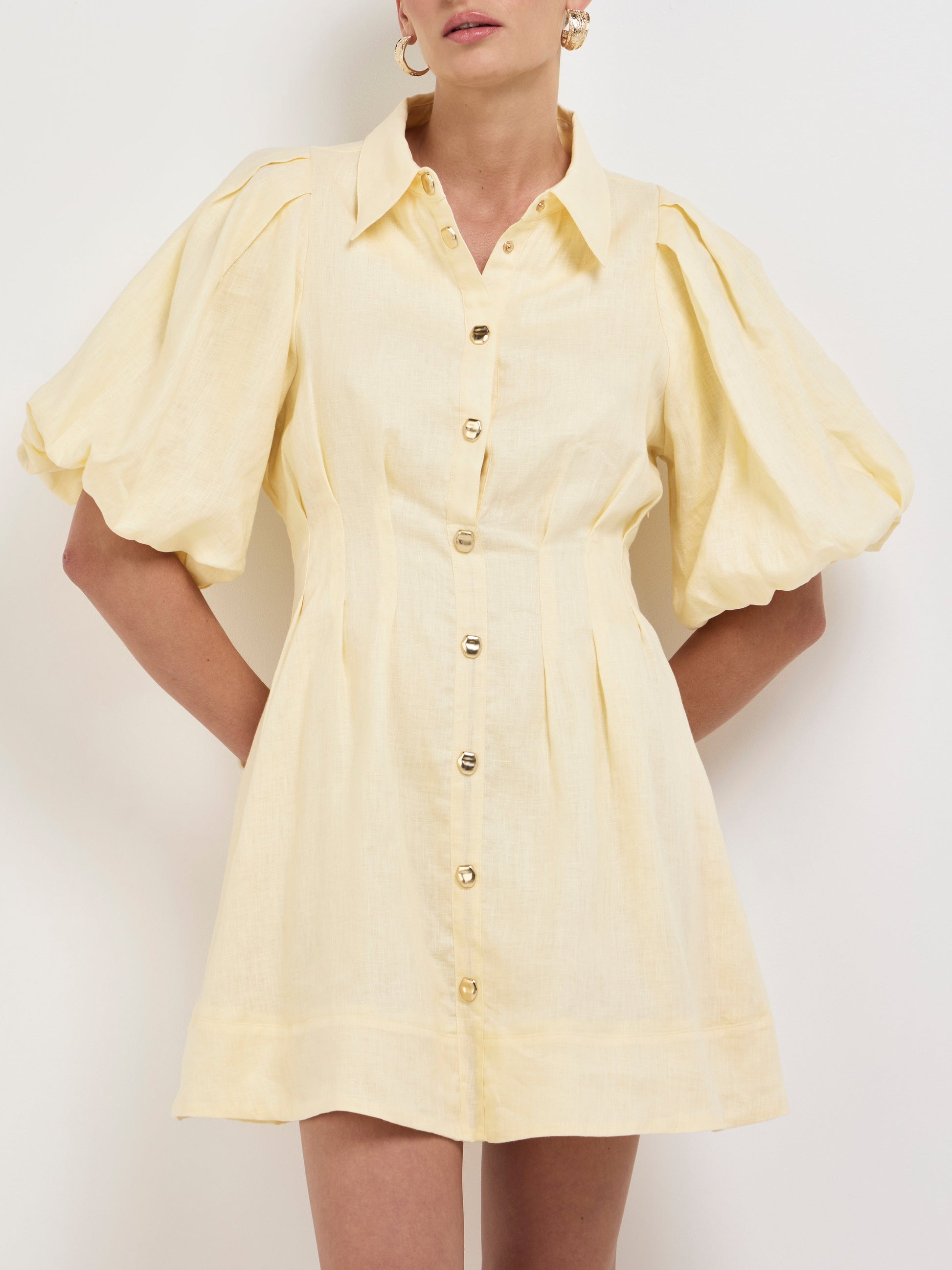 Fresh, feminine, and made for summer. The Elisa Mini Dress in Limoncello is crafted from 100% linen with full lining for all-day comfort. Featuring a fit-and-flare silhouette, bubble sleeves, and soft gold press studs, it’s equal parts playful and polished. Pleated at the waist for added shape and movement, it’s your go-to for easy elegance.