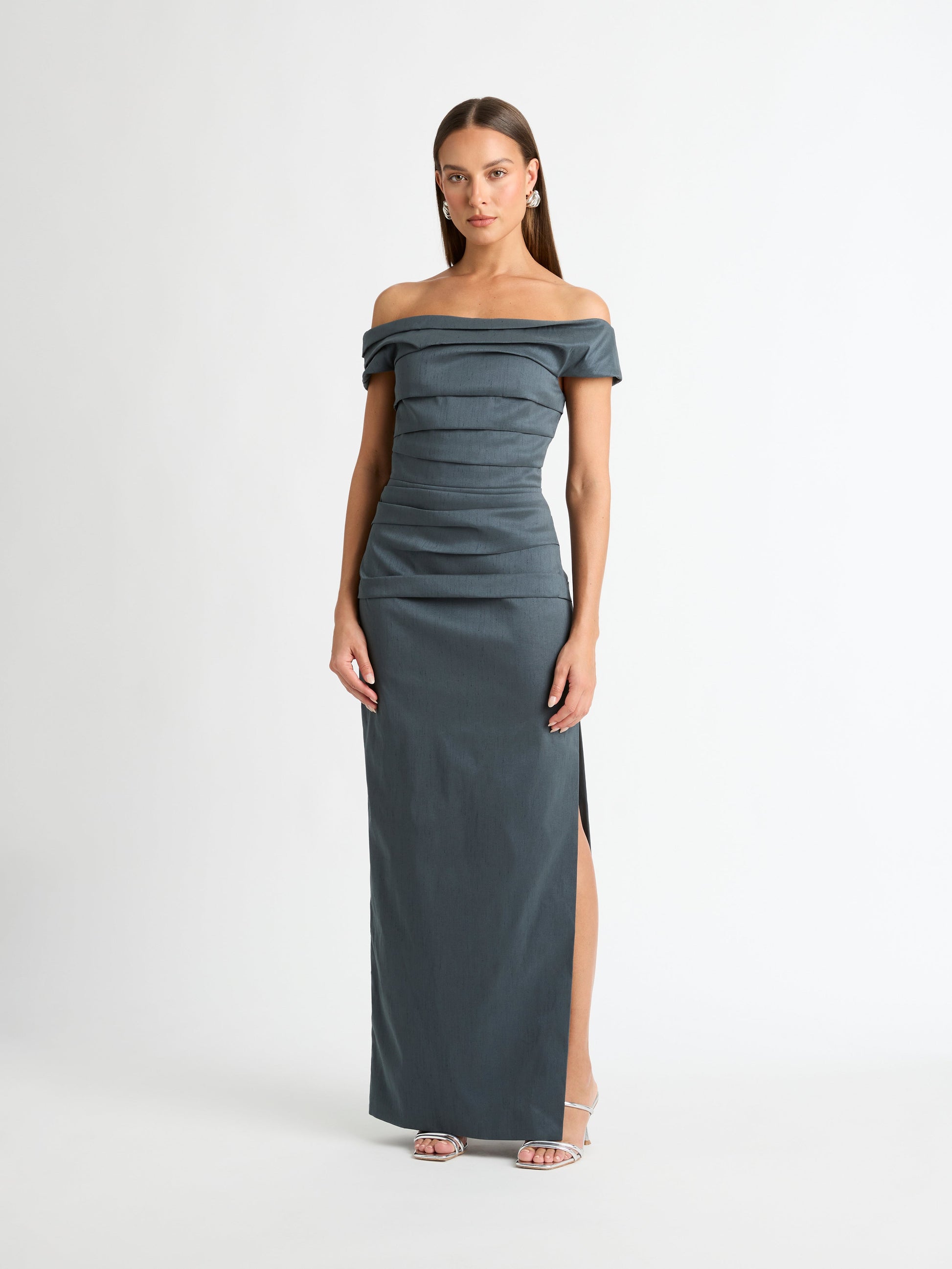 Designed to honour the shape of the female form. Introducing the Elissa Gown - showcasing a fitted styling, stretch taffeta fabrication, off shoulder straps, pleating throughout dress, side seam split and invisible center back zipper. Pair with our Blake Ear Cuff to complete the look.