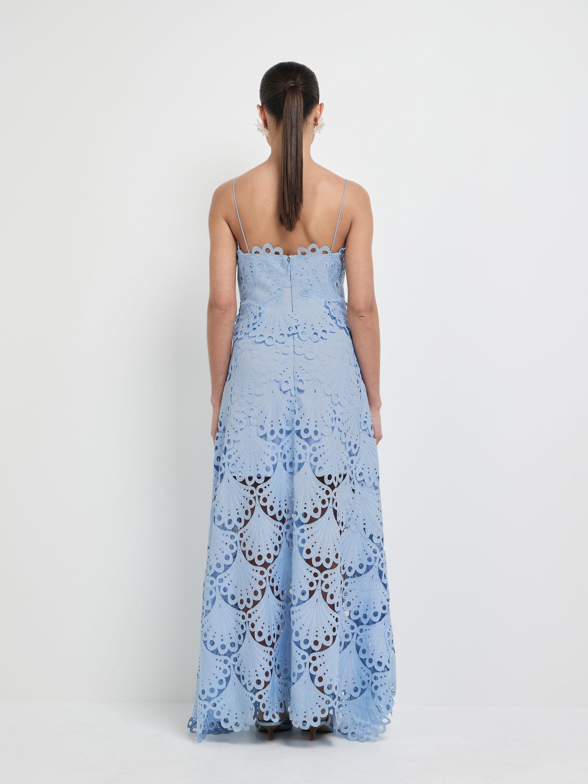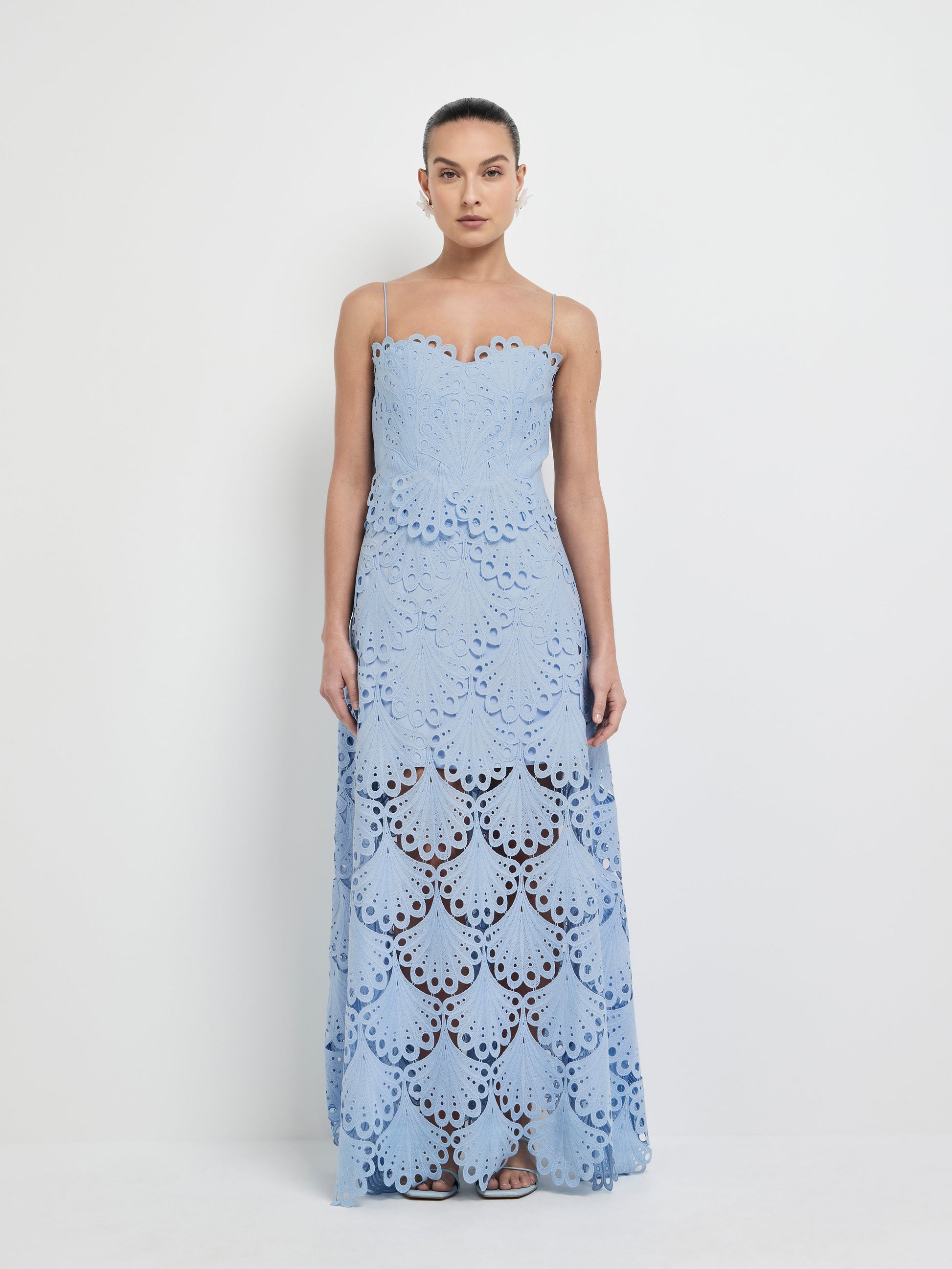 A vision in blue. Introducing our Ella Lace Maxi Dress - showcasing a blue lace fabrication, fitted styling, delicate cord straps, maxi length skirt and mini skirt lining. Pair with our Alica Earrings to complete the look.