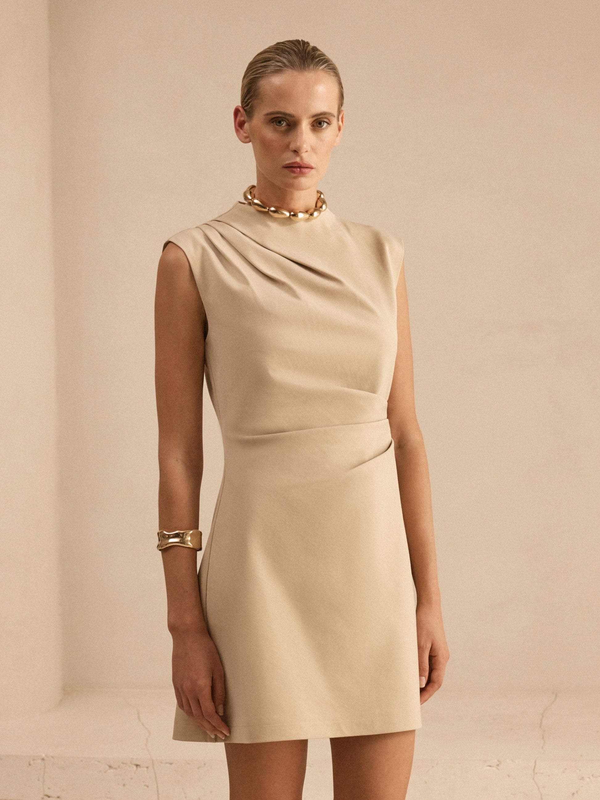 The ultimate desk-to-dinner mini, designed to flatter from every angle. Introducing the Elle Mini Dress - showcasing a sand stretch blend fabrication, fitted cut, high neckline, sleeveless with tuck details and mini length Skirt. Pair with our Kaia Earrings to complete the look.