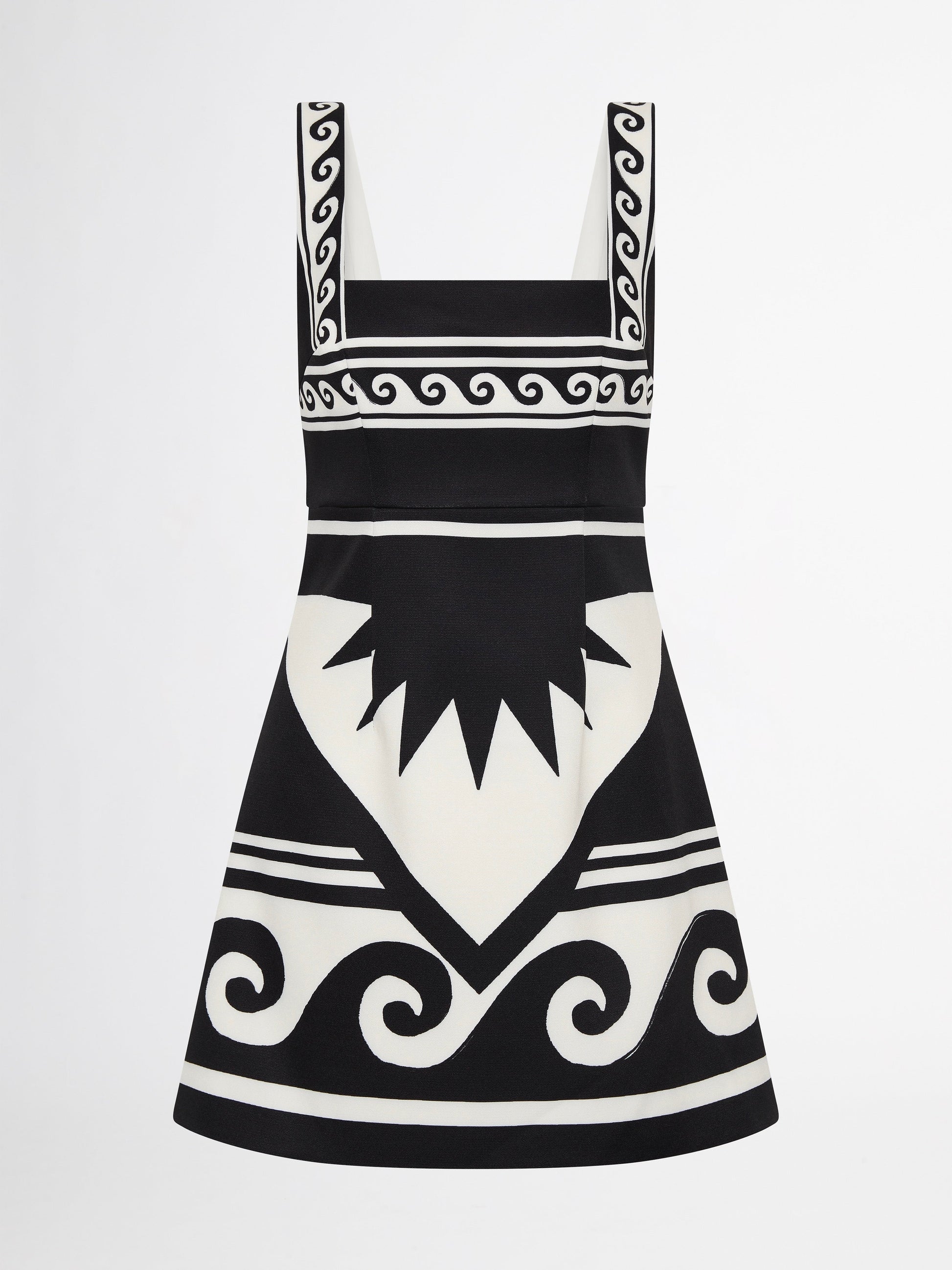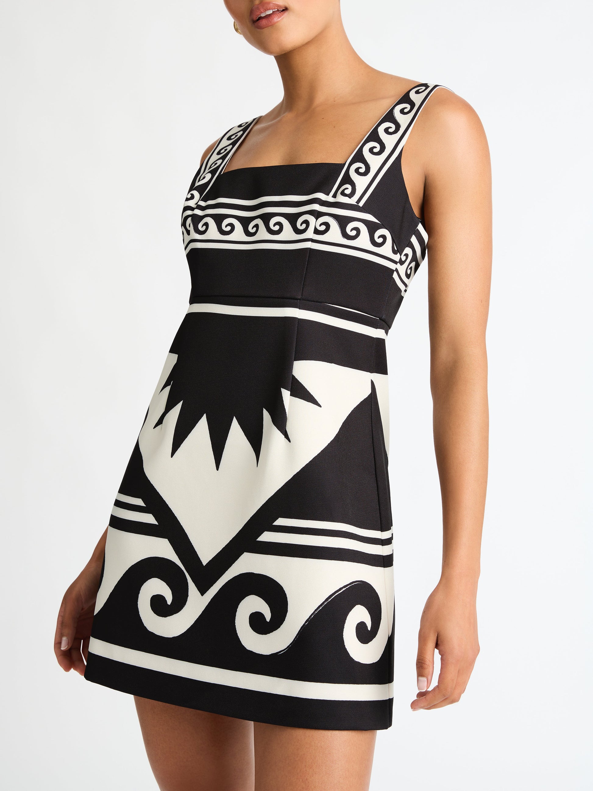 Embrace timeless monochrome in the Eros Mini Dress! Featuring a bonded print fabrication, fit and flare styling, square neckline, adjustable straps and A-line mini skirt. Pair with our Seashore Earrings to complete the look.