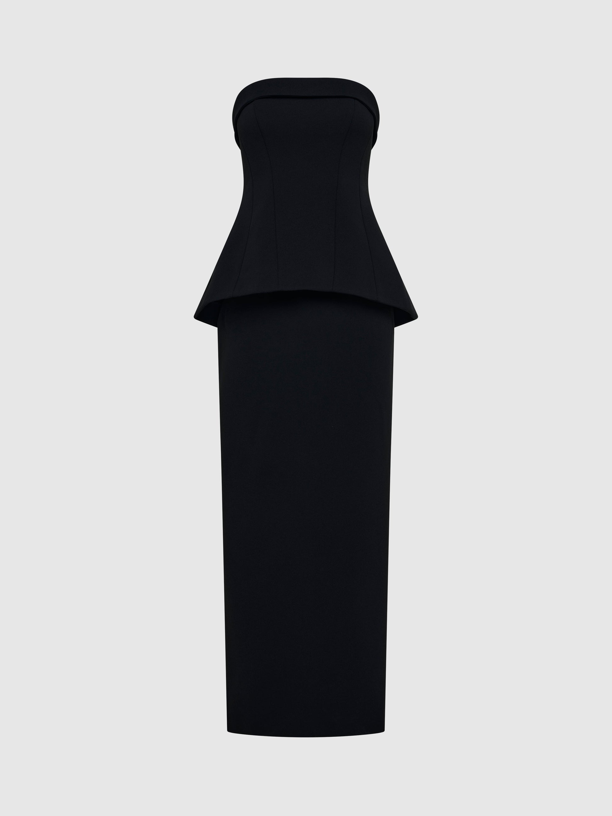 A masterclass in structured elegance. Introducing the Estella Gown - showcasing a black bonded fabrication, straight strapless neckline with fold over detail, peplum, column shaped maxi skirt with back split, and exposed back zipper. Pair with our Hannah Earrings to complete the look.