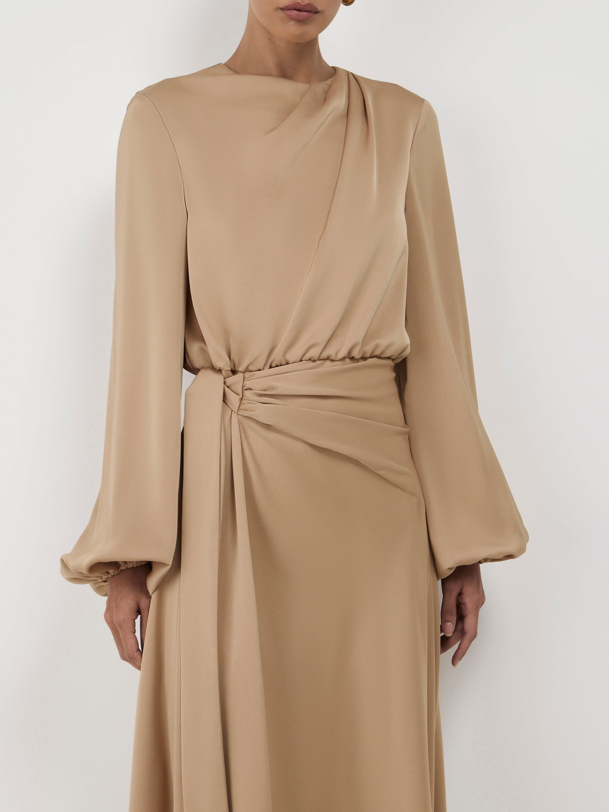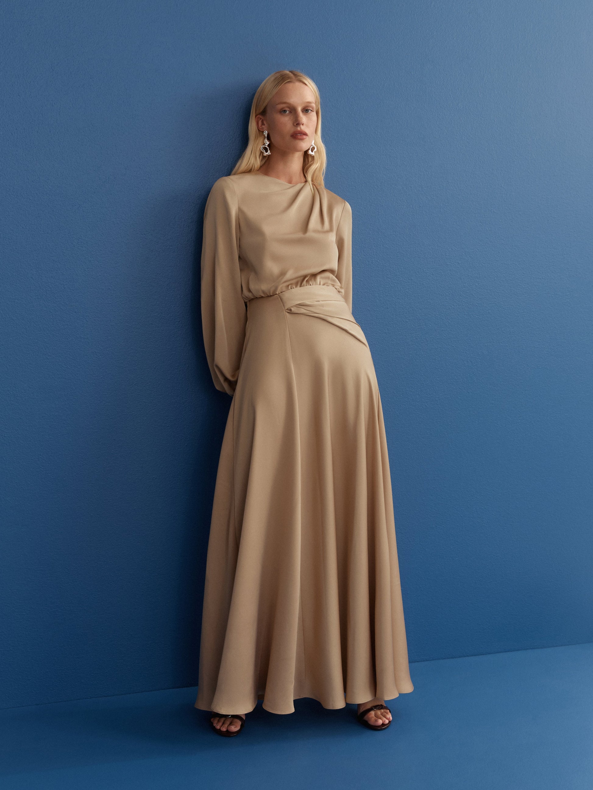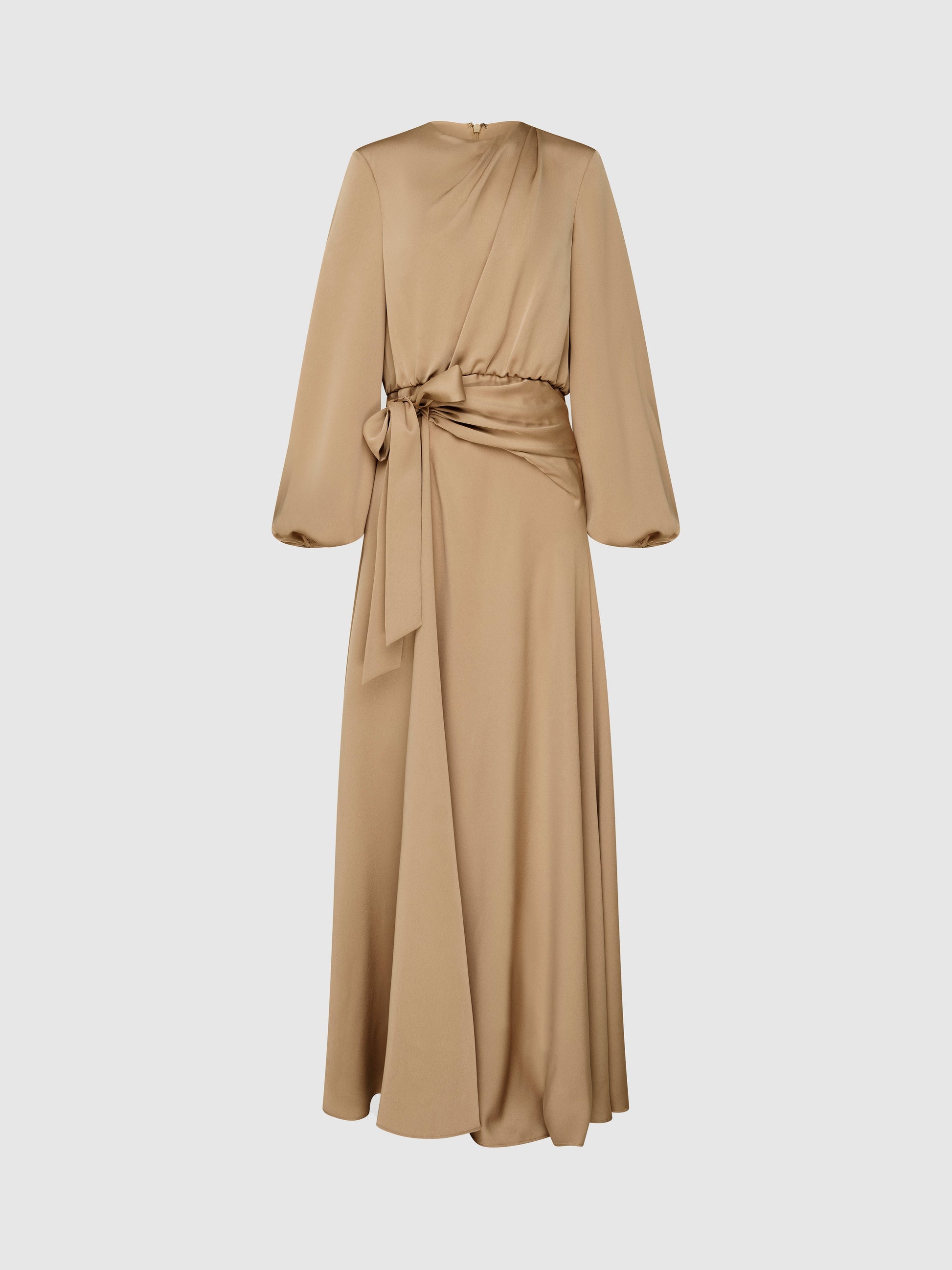 Rich golden hues and silky satin fabrication makes up the delectable Evelyn Maxi Dress. Showcasing a gold satin fabrication, high neckline, wrap tie front at skirt, long sleeves and maxi length skirt. Pair with our Leo Earrings to complete the look.