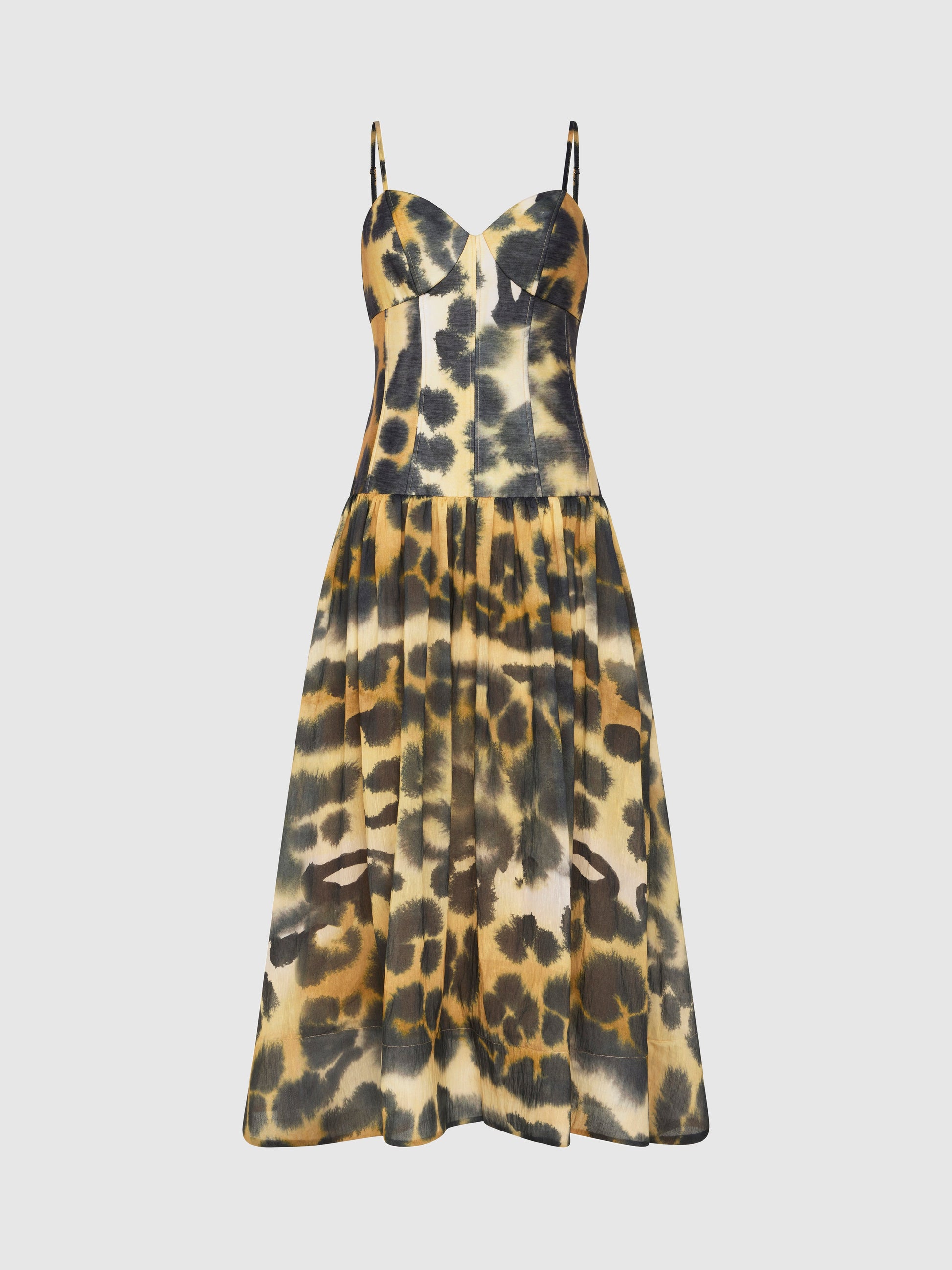 Indulge in leopard print this season with the Feline Dress. Showcasing a leopard print fabrication, fitted cut, A-line midi skirt, shirred back panel, shaped bust panels and side seam pockets. Pair with our Camilla Earrings to complete the look.