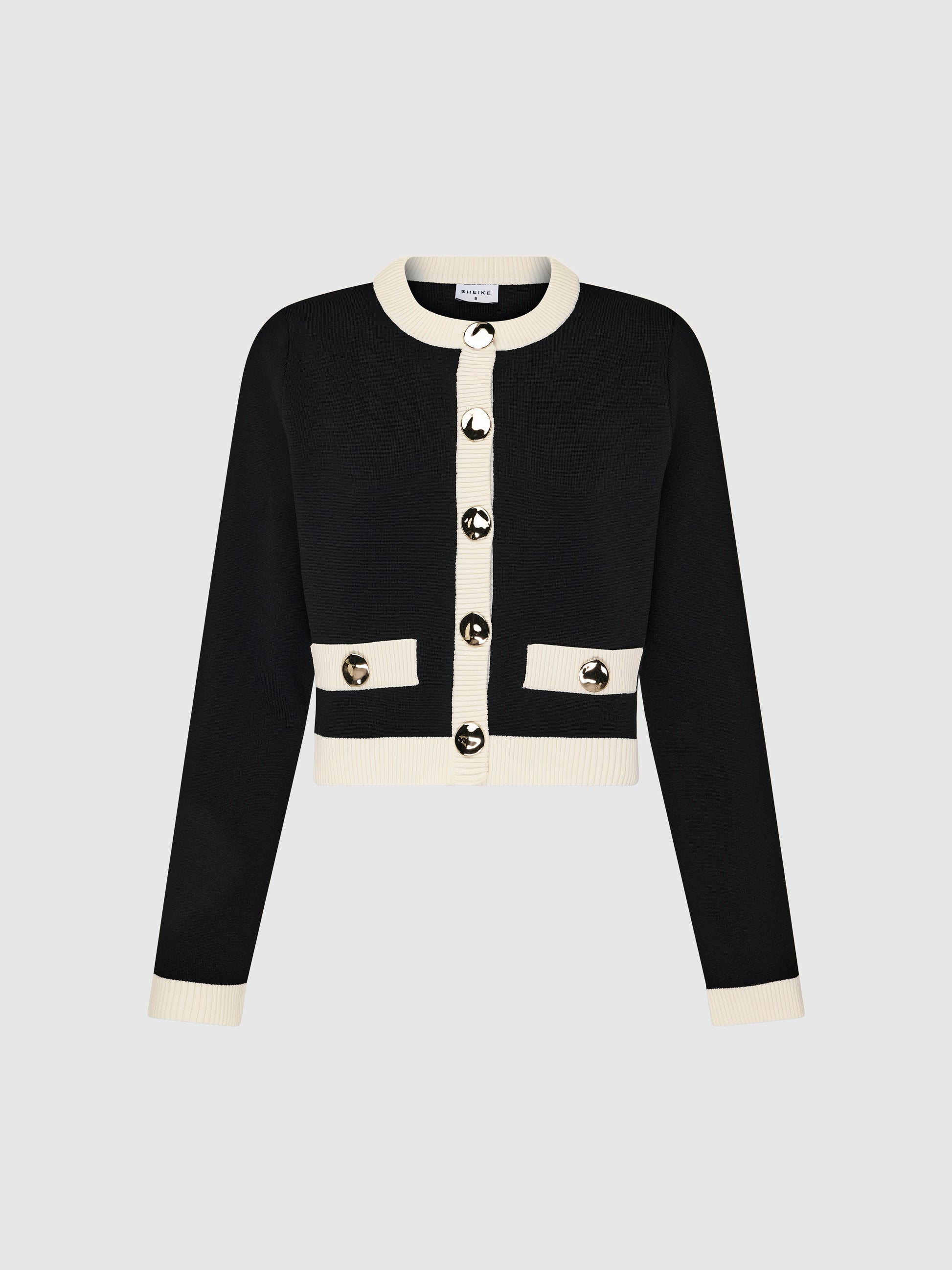 Parisian chic inspired. Introducing the Fia Cardigan - Showcasing a black knit fabrication, relaxed fit, crew neckline, faux welt pockets in contrast cream rib with gold button, contrast cream rib hem, cuffs and placket and button up front. Pair back with our matching Fia Skirt to complete the look.