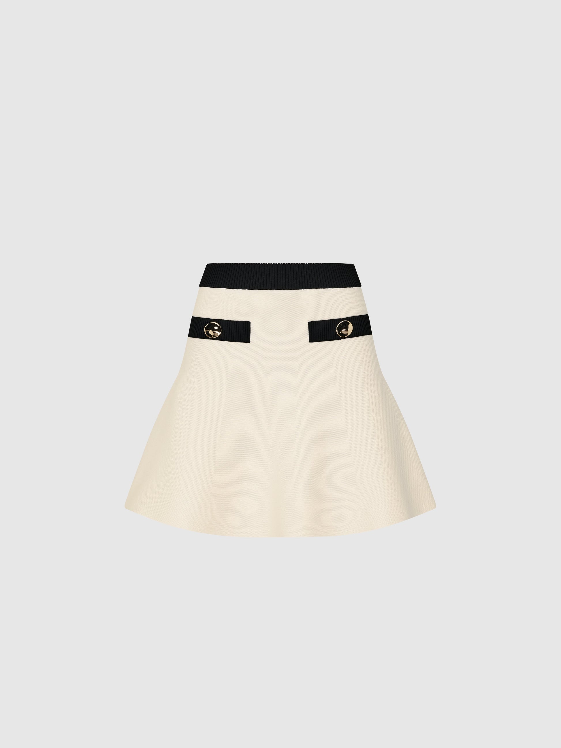Parisian chic inspired. Introducing the Fia Skirt - Showcasing a cream knit fabrication, fit and flare A-line styling, mini skirt length, faux welt pockets in contrast black rib and elasticated waistband. Pair back with our matching Fia Cardigan to complete the look.