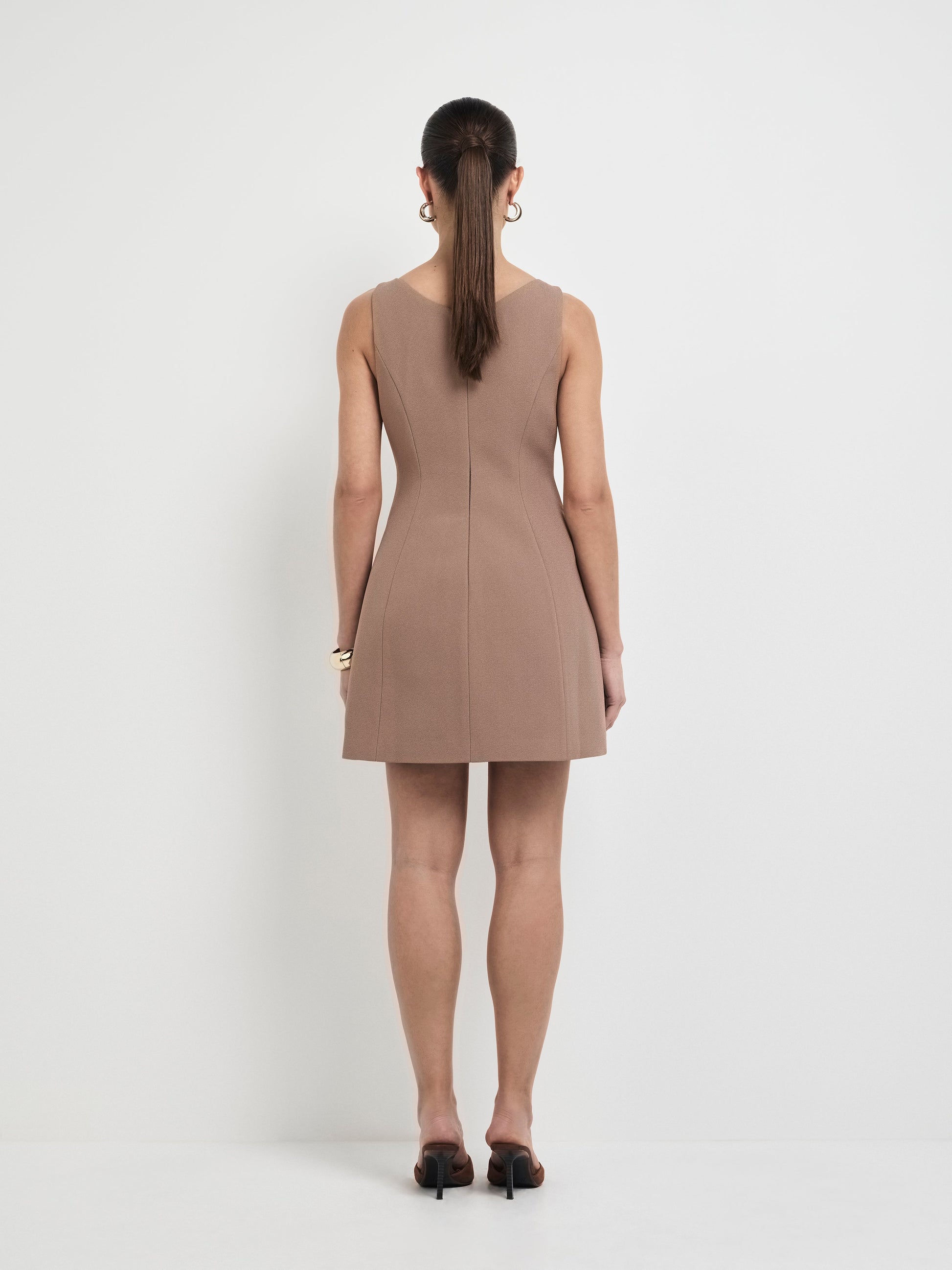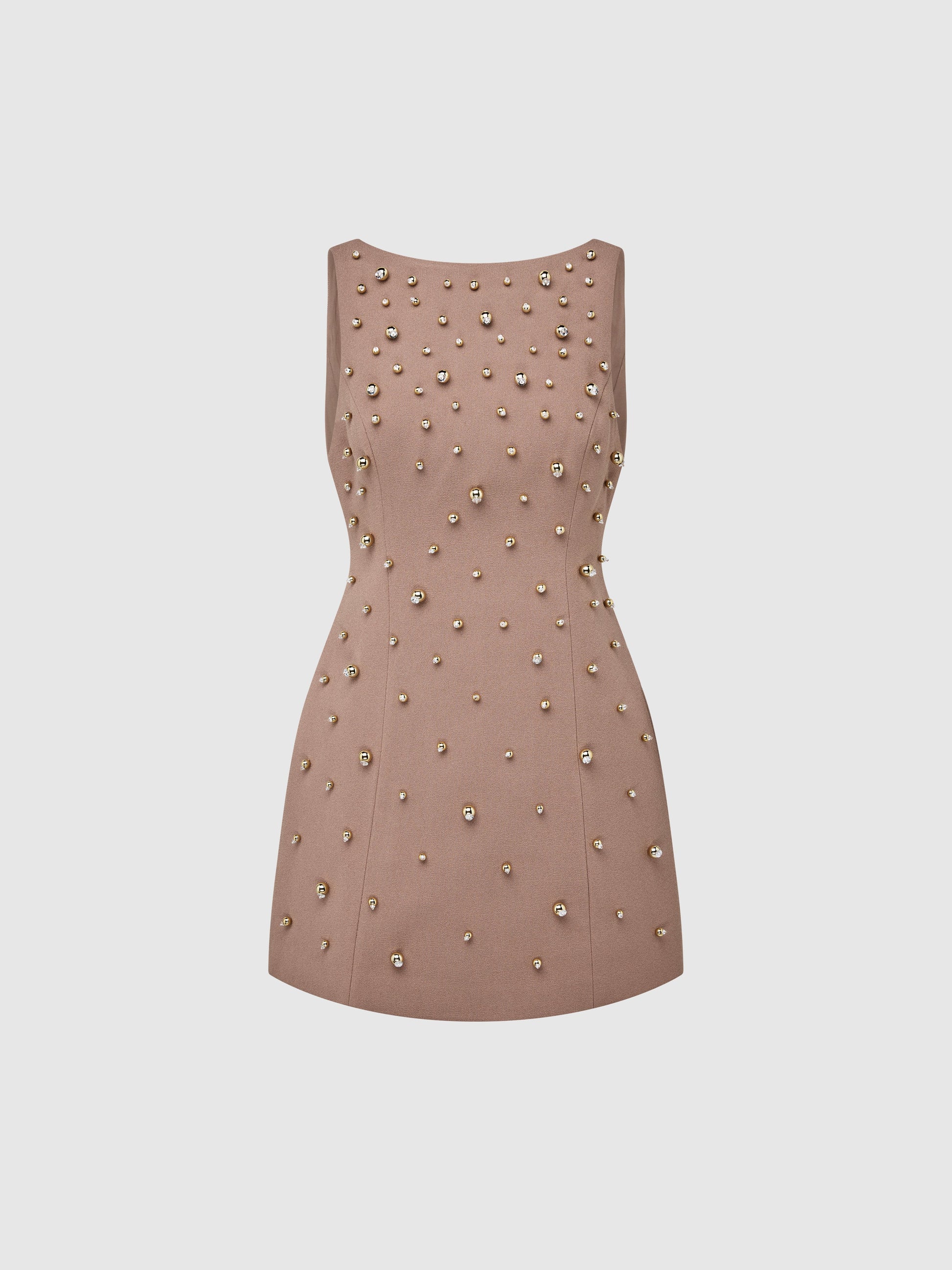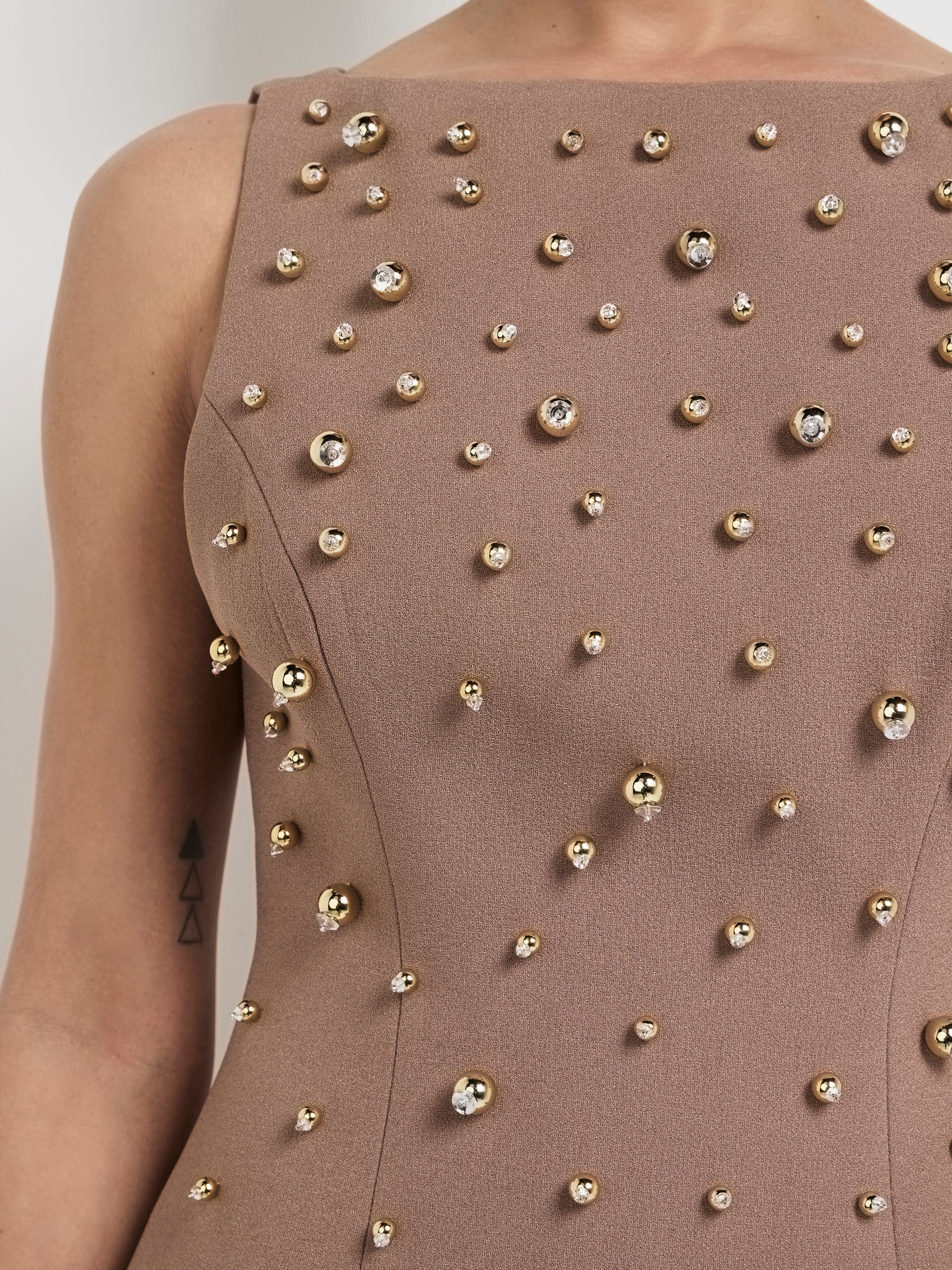Make a statement in mocha tones and golden details. Introducing the Firework Mini Dress - showcasing a mocha heavily bonded woven fabrication, slim fit, boat neckline, gold bead detail on front and mini skirt length. Pair with our Lottie Earrings to complete the look.