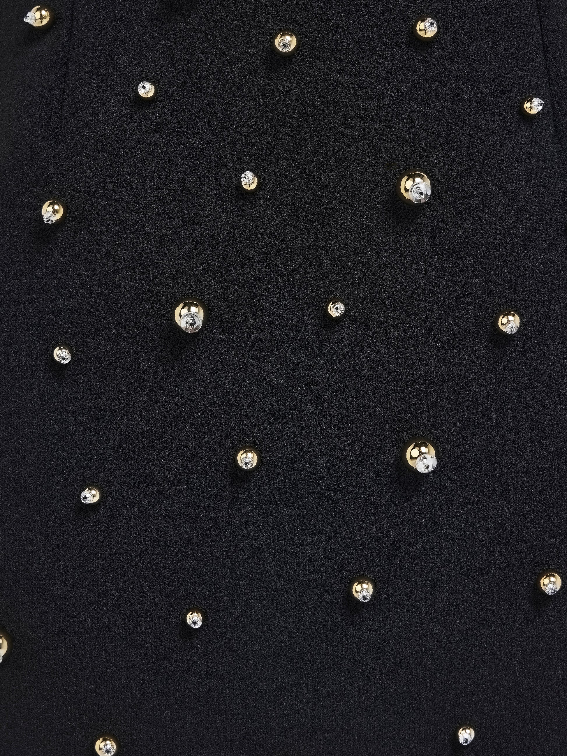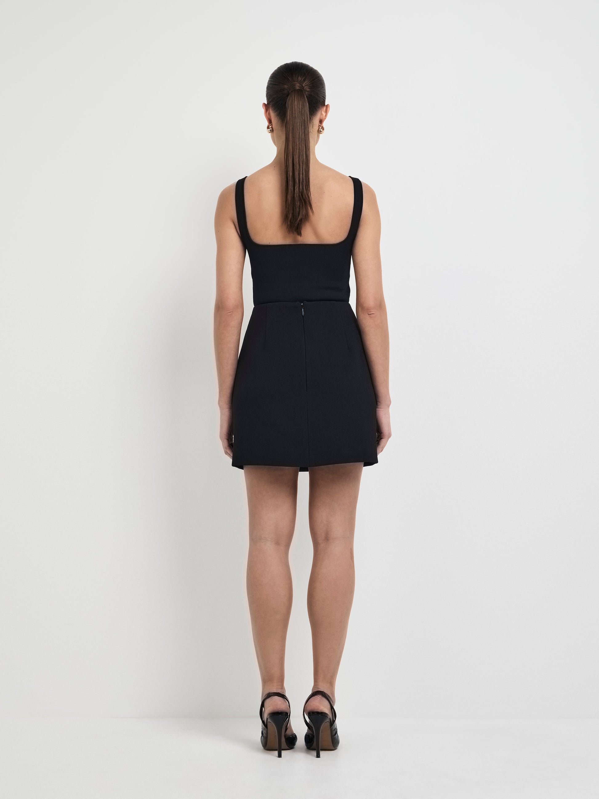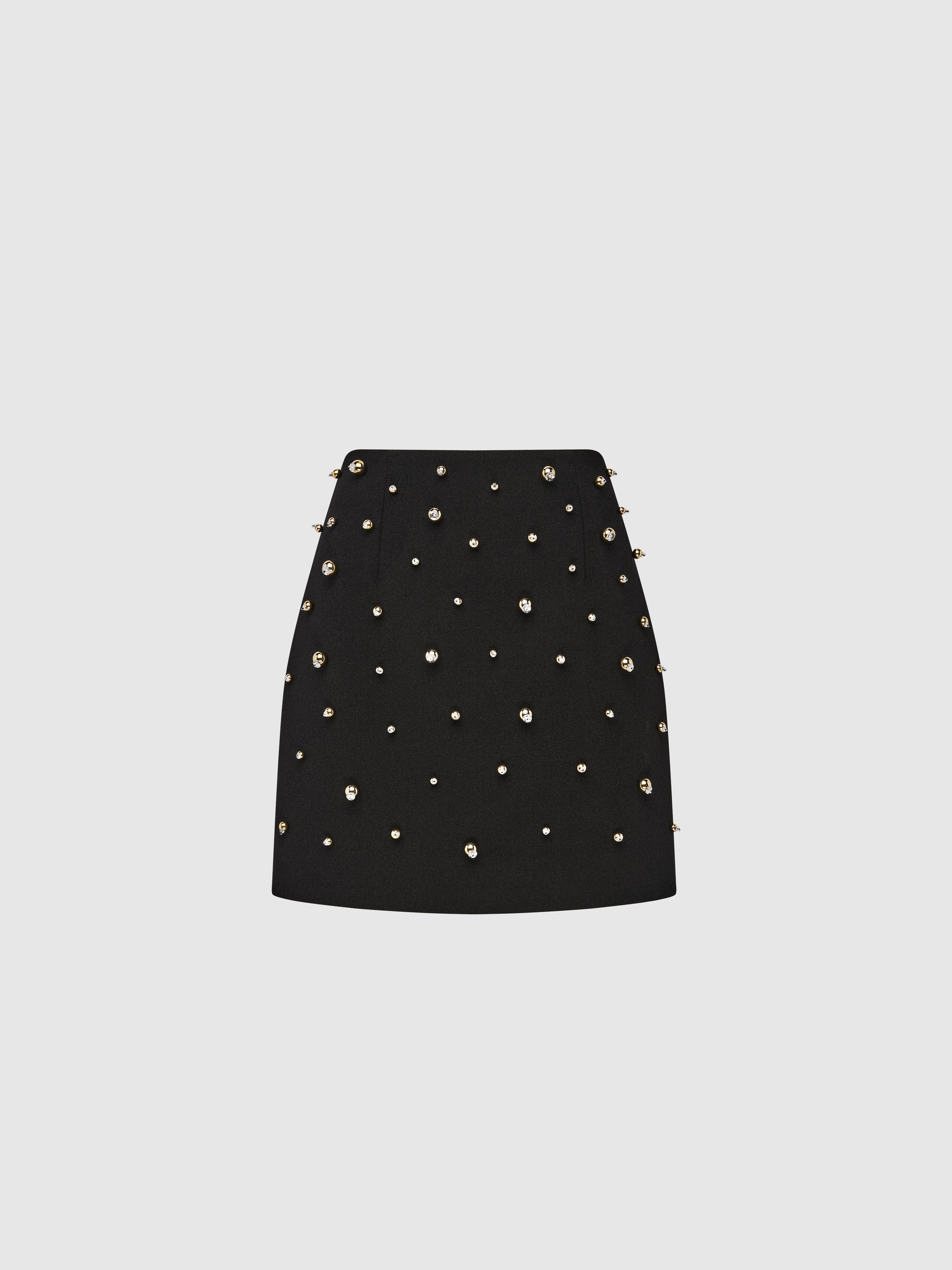 Make a statement in raven tones and golden details. Introducing the Firework Mini Skirt - showcasing a black heavily bonded woven fabrication, slim fit, gold bead detail on front and mini skirt length. Pair with our Nicolette Knit Top or Noelle Top to complete the look.